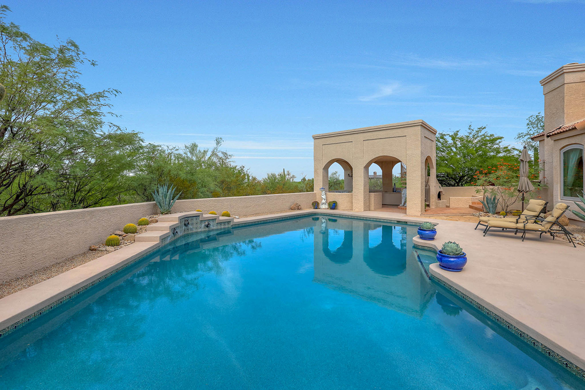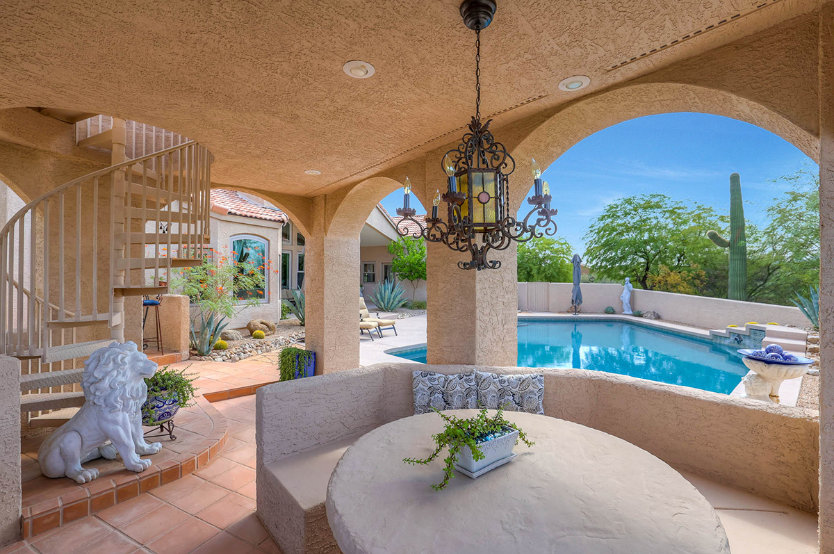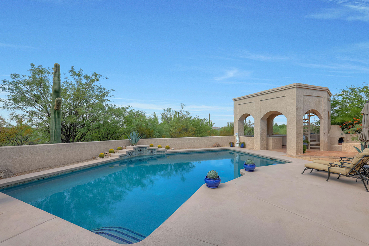 The true jewel of this property is the outstanding backyard with a sparkling diving pool, covered ramada with built-in table and bench seating, spa with new tile surround, built-in BBQ, and a spiral staircase leading to the view deck. From the view deck, you can indulge in the beauty of sunset and mountain views over the pristine pool and spa. The pool was given a stunning makeover in 2022, featuring Stone Scape pebble sheen coating, new tile, and forged bronze spouts.