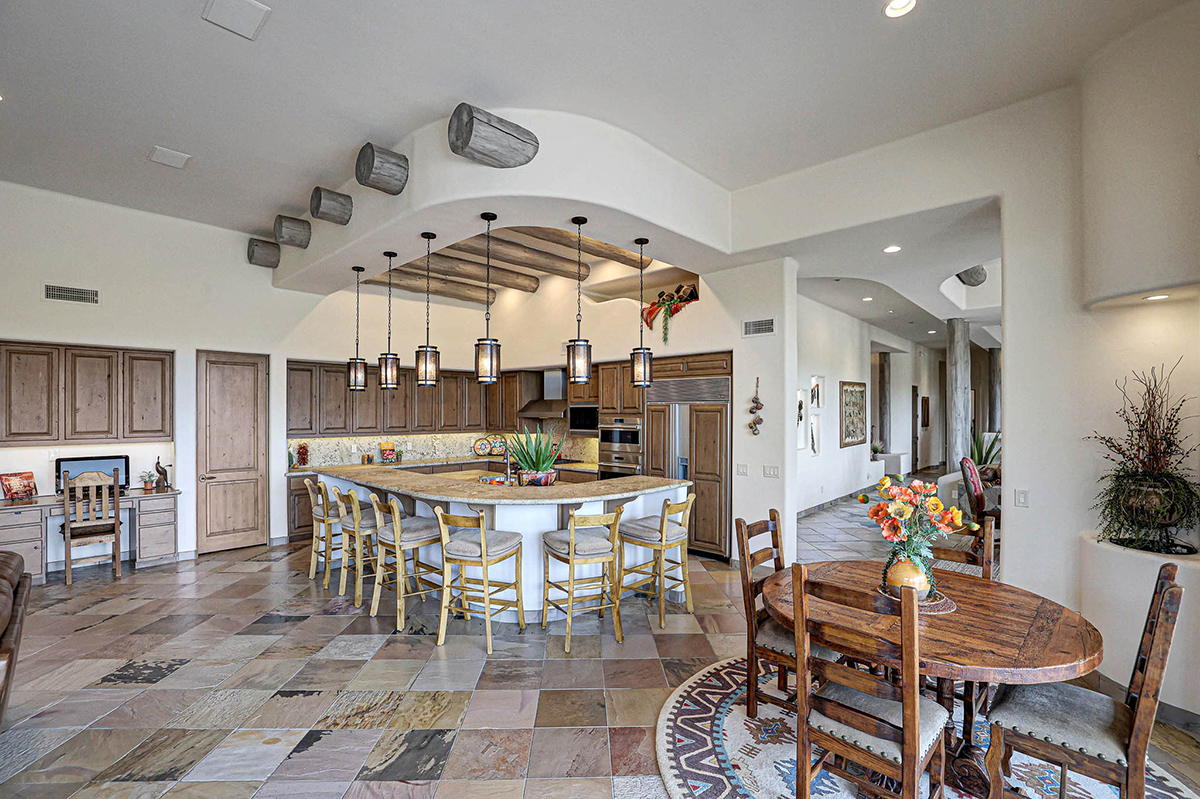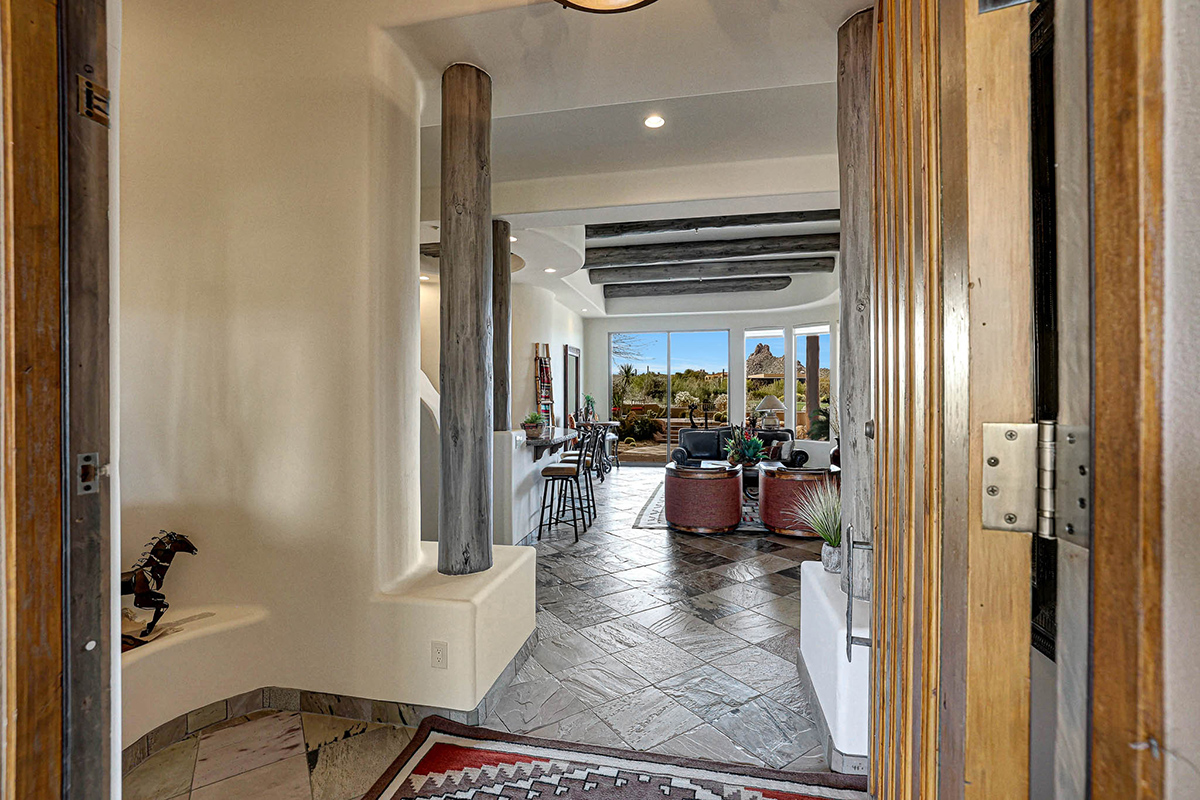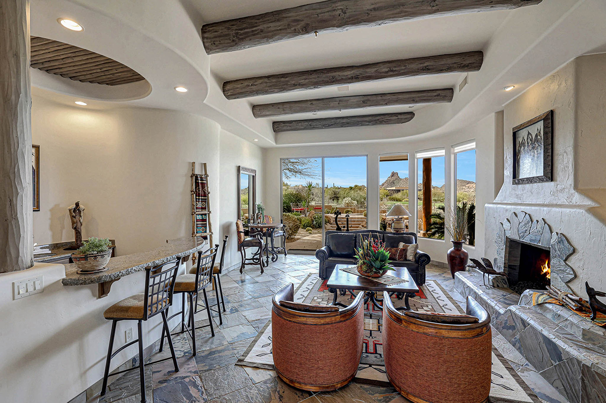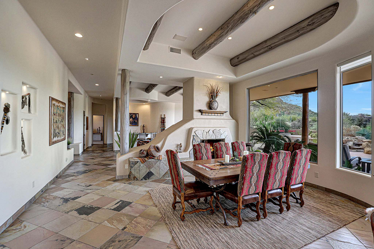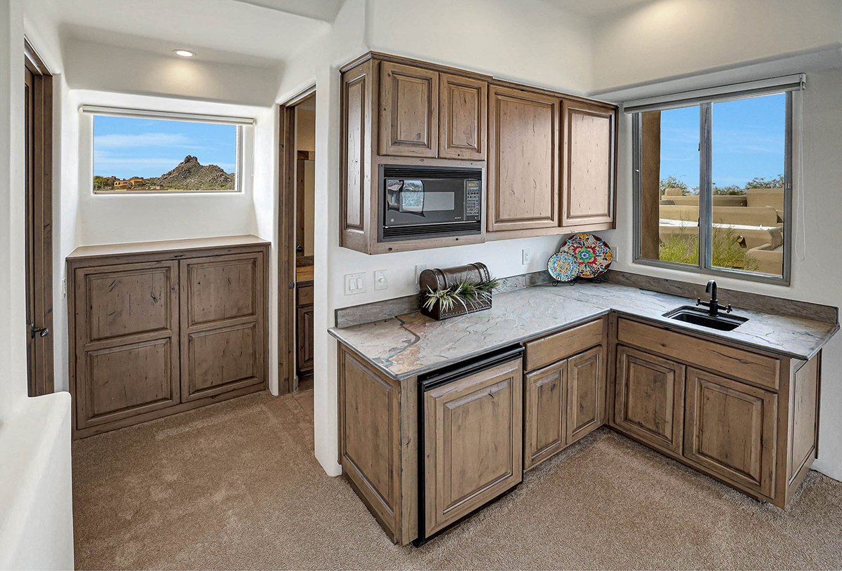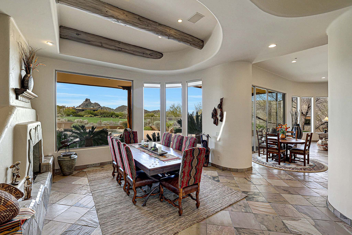 As soon as you step inside take note of the direct view of Pinnacle Peak. No interior steps on the main level. With four spacious bedrooms, each accompanied by en suite baths, along with an additional den/office and two powder baths, this home provides ample space and privacy for residents and guests alike. The upstairs bedroom suite is perfect for visiting guests as it offers its own kitchenette, private balcony, and privacy. The interior showcases meticulous attention to detail, with custom features throughout including slate stone floors and details, curved accents and beamed and latilla wood accents.