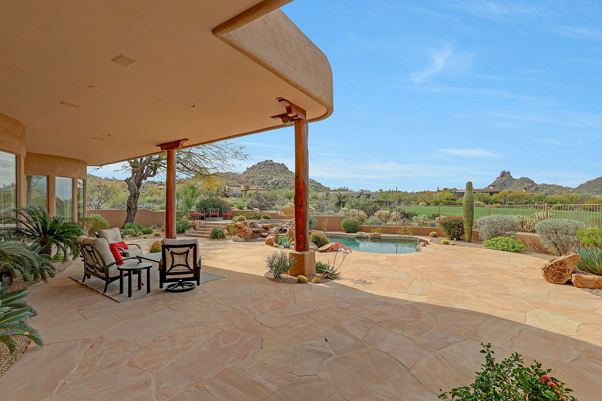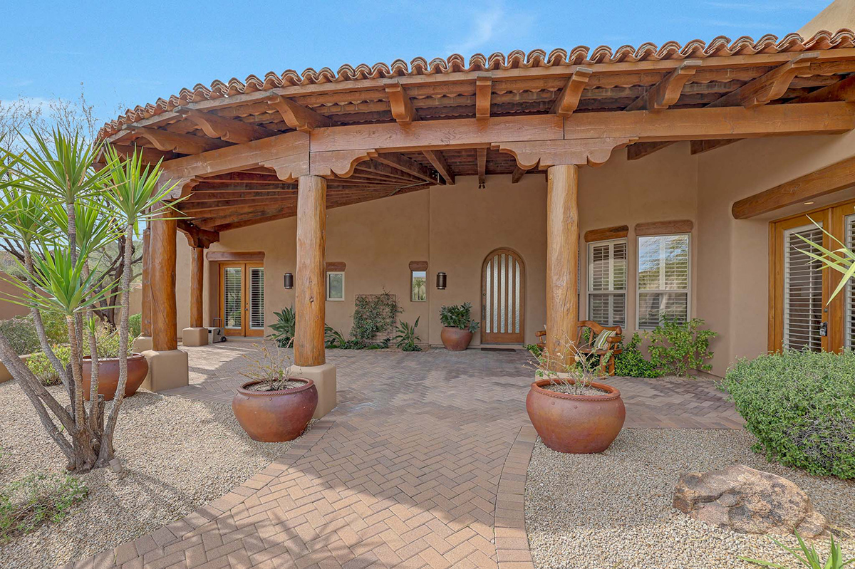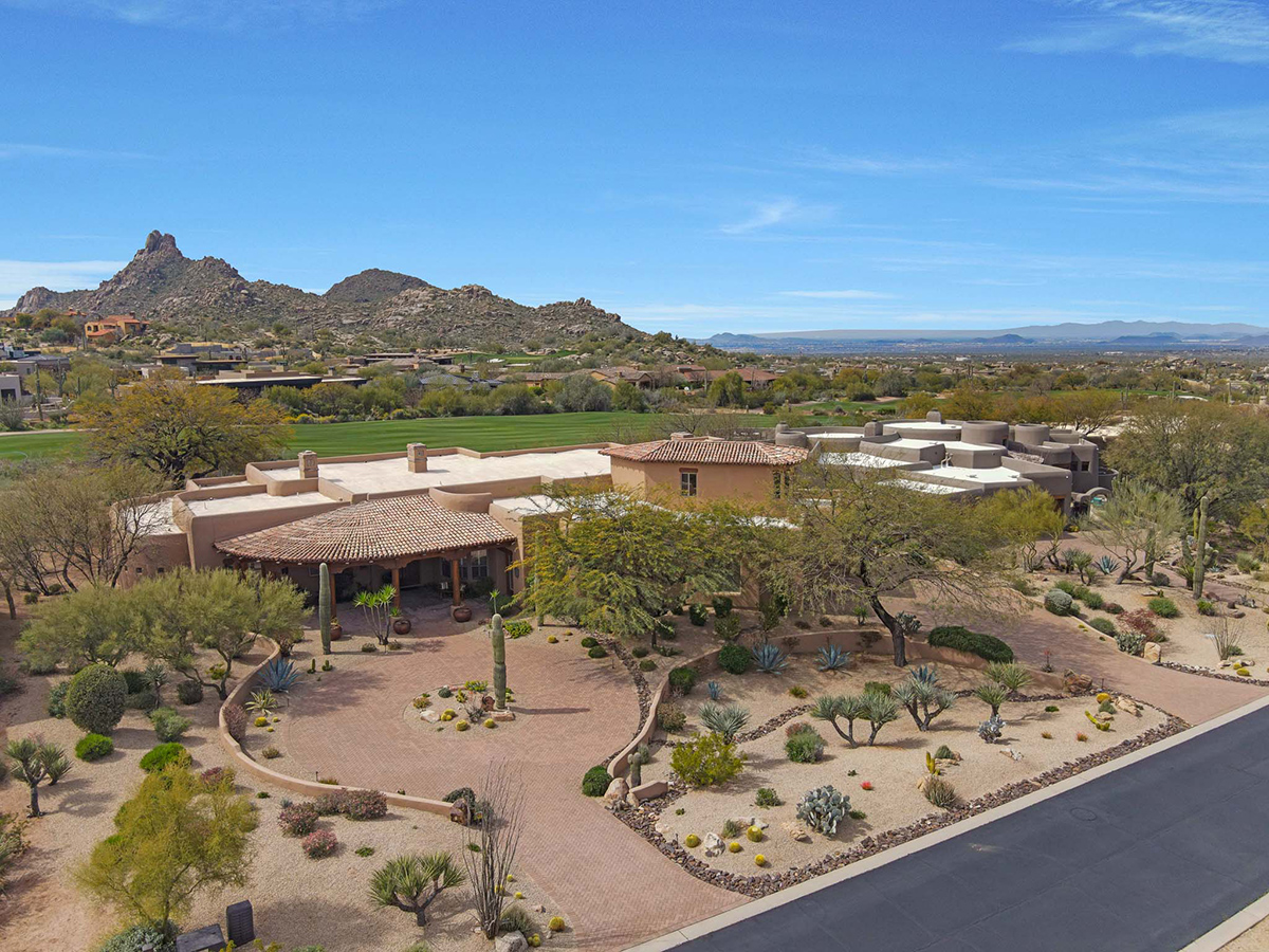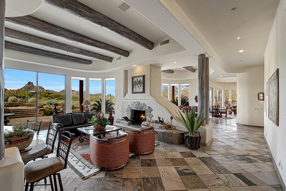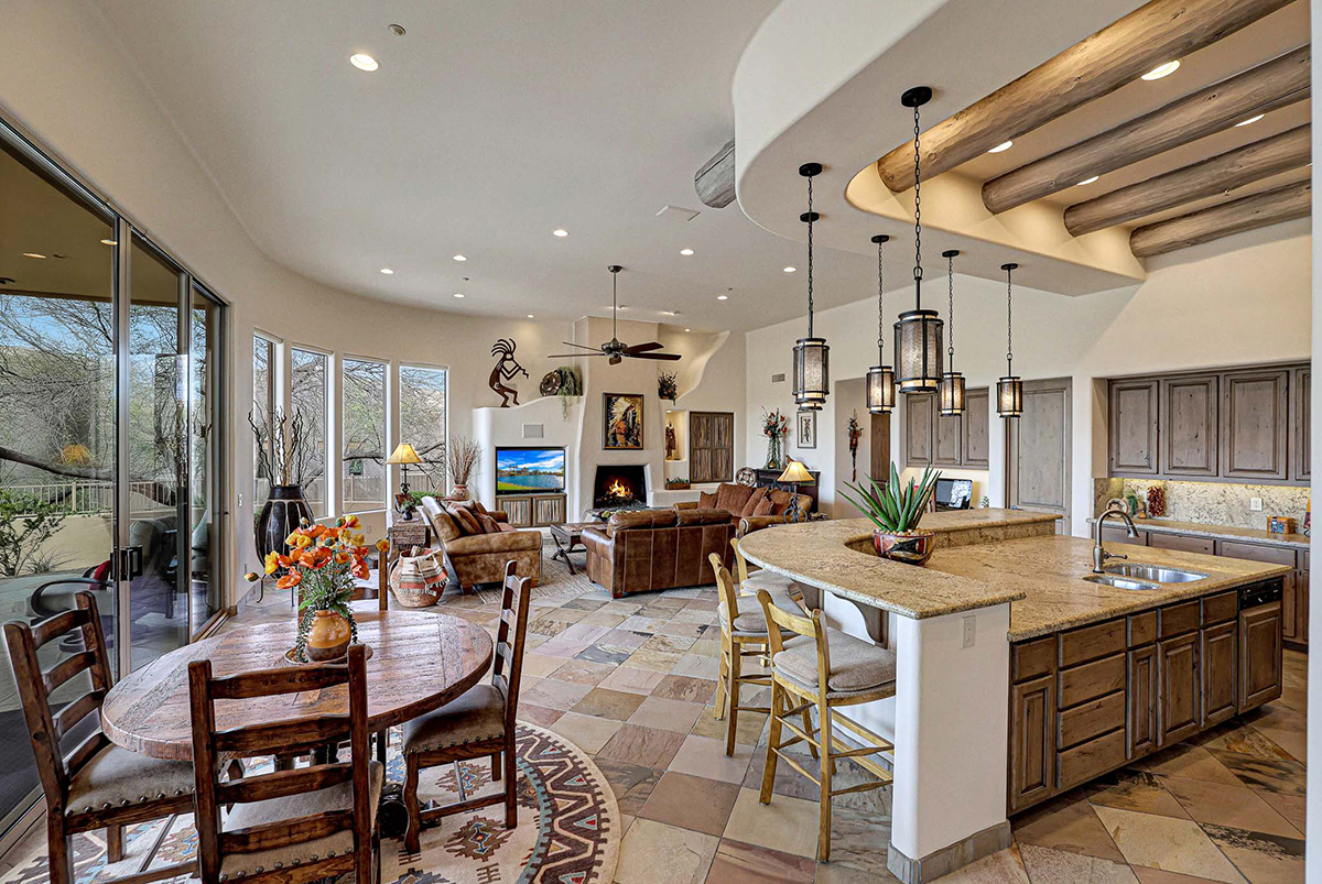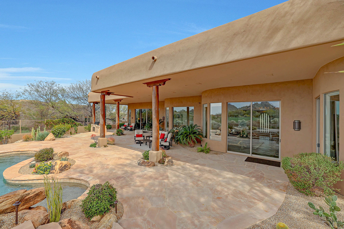 As soon as you step inside take note of the direct view of Pinnacle Peak. No interior steps on the main level. With four spacious bedrooms, each accompanied by en suite baths, along with an additional den/office and two powder baths, this home provides ample space and privacy for residents and guests alike. The upstairs bedroom suite is perfect for visiting guests as it offers its own kitchenette, private balcony, and privacy. The interior showcases meticulous attention to detail, with custom features throughout including slate stone floors and details, curved accents and beamed and latilla wood accents.
