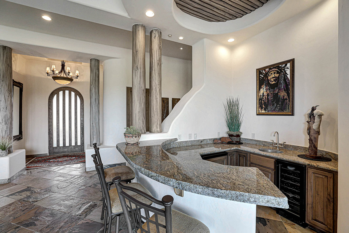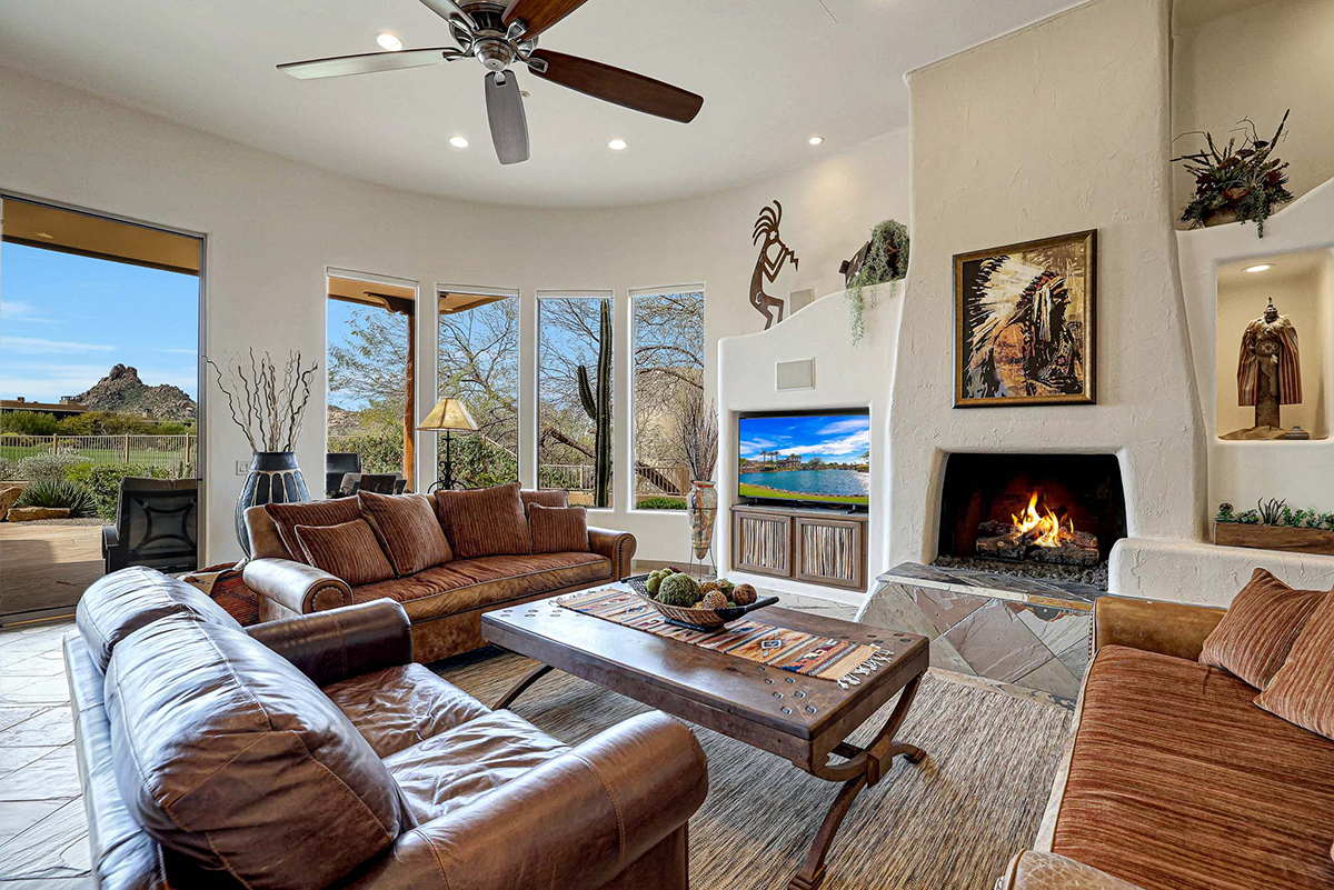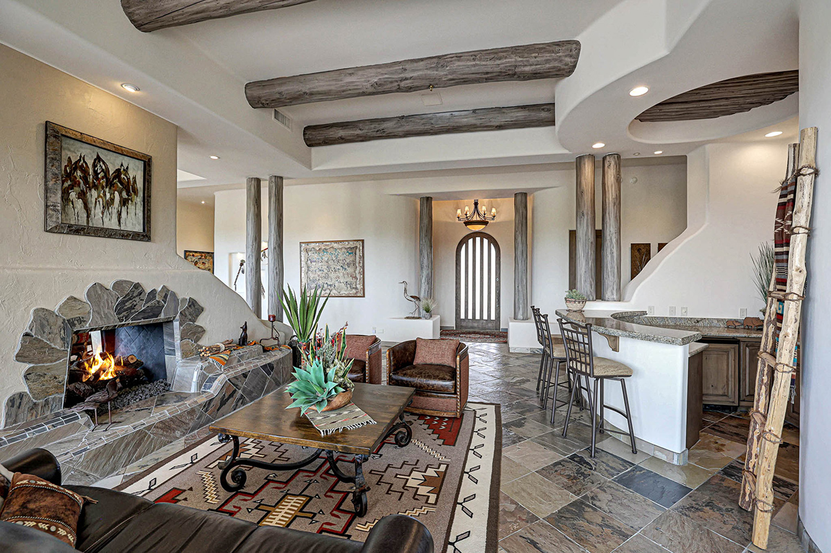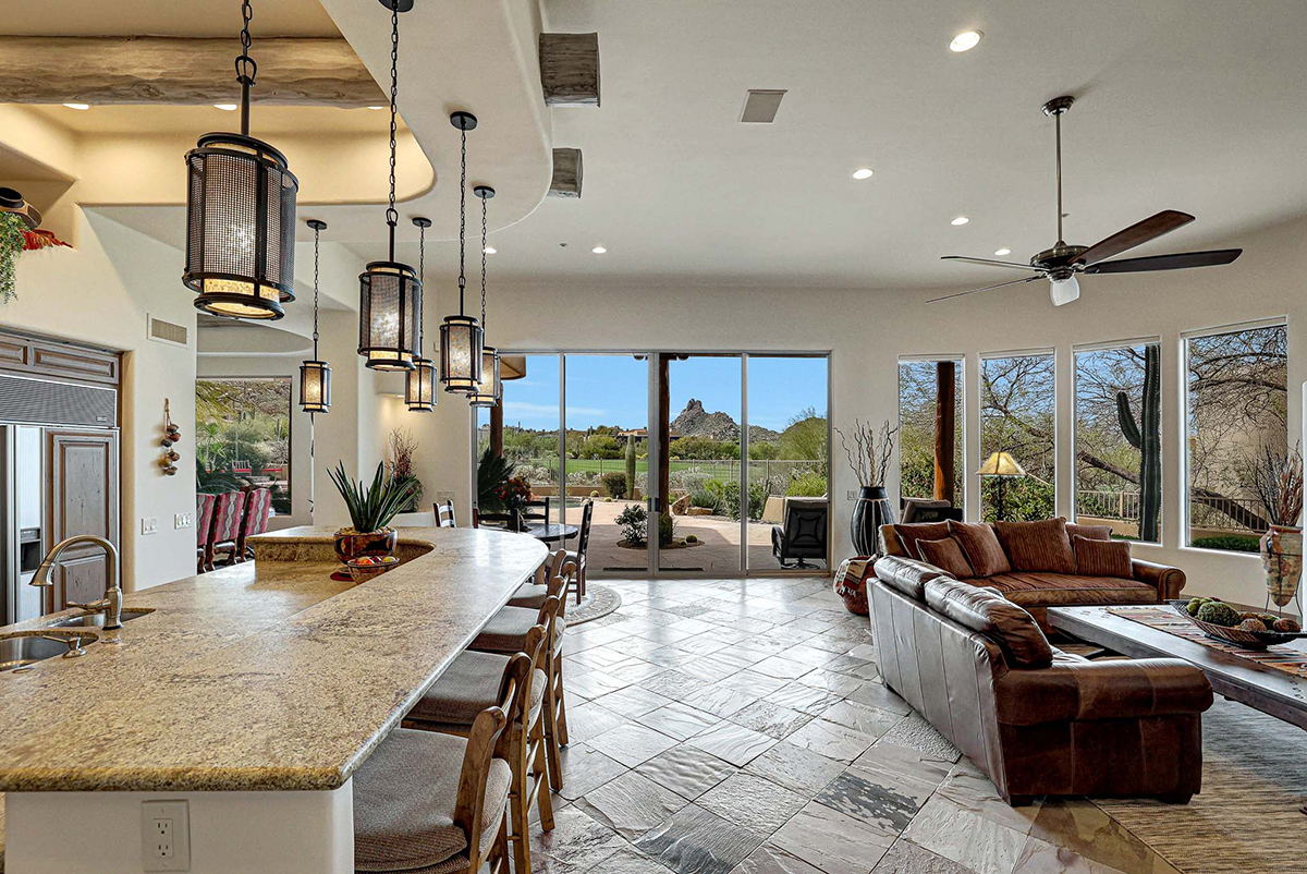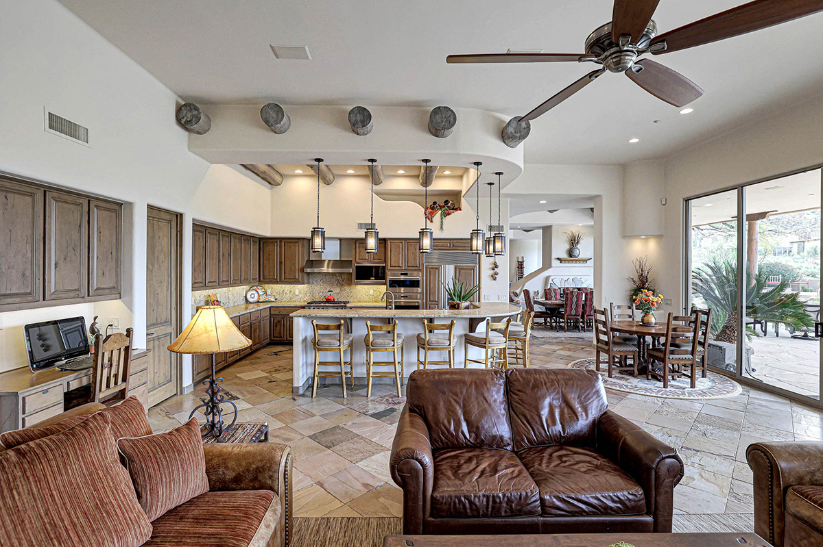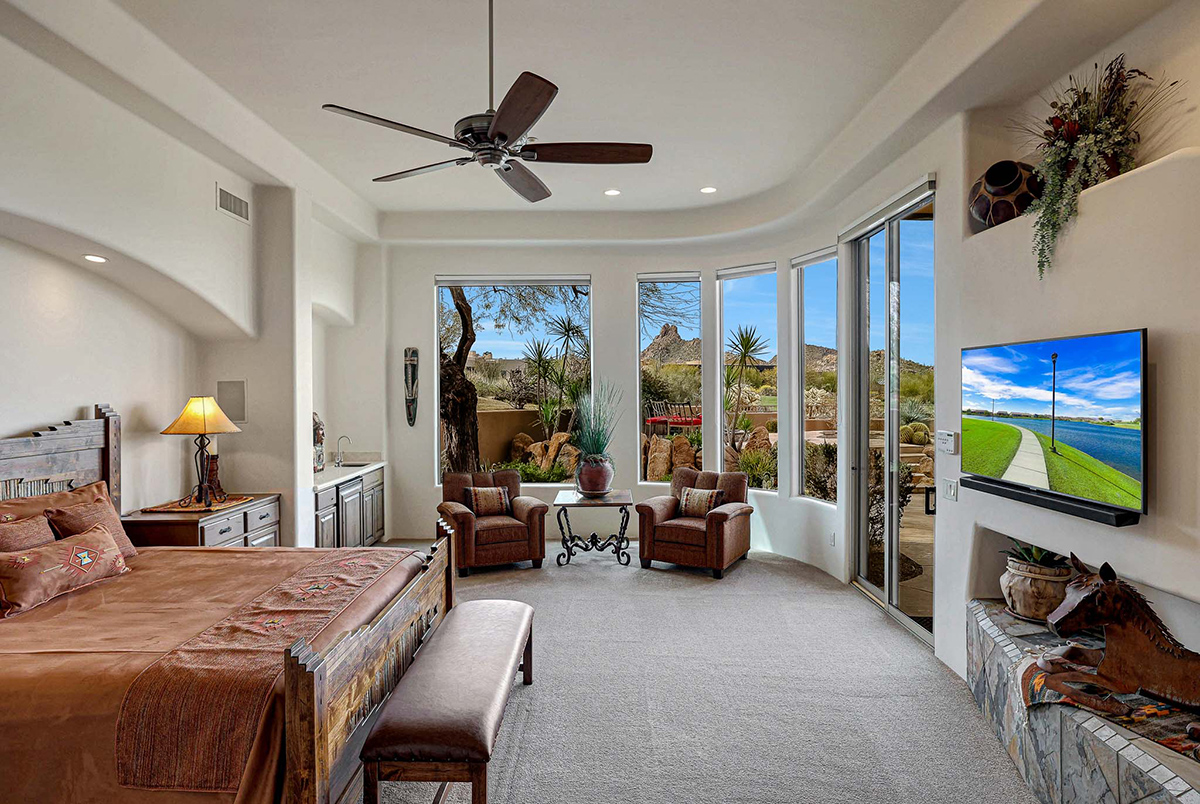 As soon as you step inside take note of the direct view of Pinnacle Peak. No interior steps on the main level. With four spacious bedrooms, each accompanied by en suite baths, along with an additional den/office and two powder baths, this home provides ample space and privacy for residents and guests alike. The upstairs bedroom suite is perfect for visiting guests as it offers its own kitchenette, private balcony, and privacy. The interior showcases meticulous attention to detail, with custom features throughout including slate stone floors and details, curved accents and beamed and latilla wood accents.