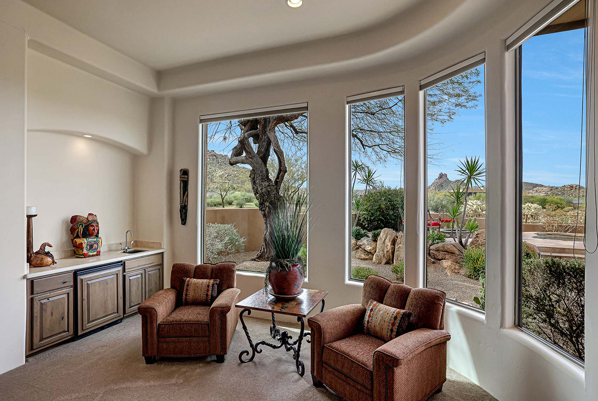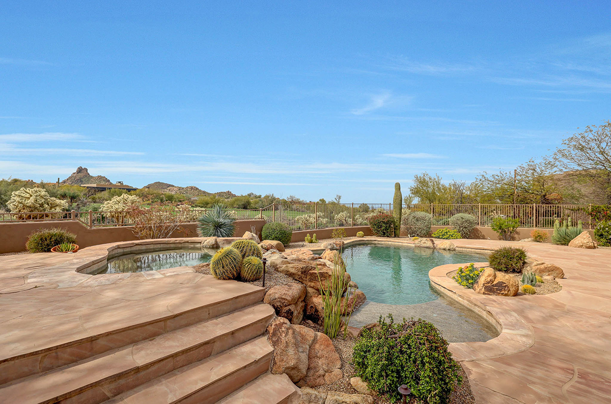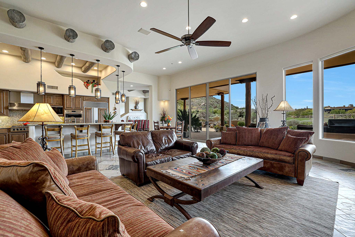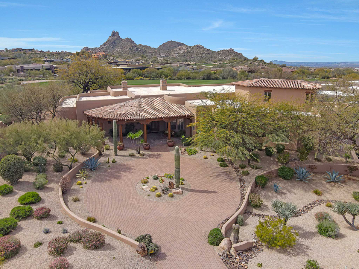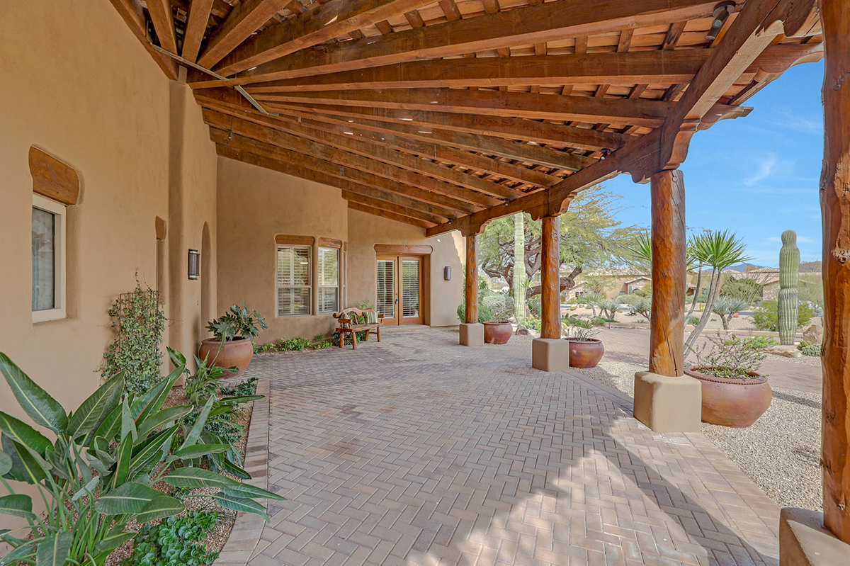 As soon as you step inside take note of the direct view of Pinnacle Peak. No interior steps on the main level. With four spacious bedrooms, each accompanied by en suite baths, along with an additional den/office and two powder baths, this home provides ample space and privacy for residents and guests alike. The upstairs bedroom suite is perfect for visiting guests as it offers its own kitchenette, private balcony, and privacy. The interior showcases meticulous attention to detail, with custom features throughout including slate stone floors and details, curved accents and beamed and latilla wood accents.