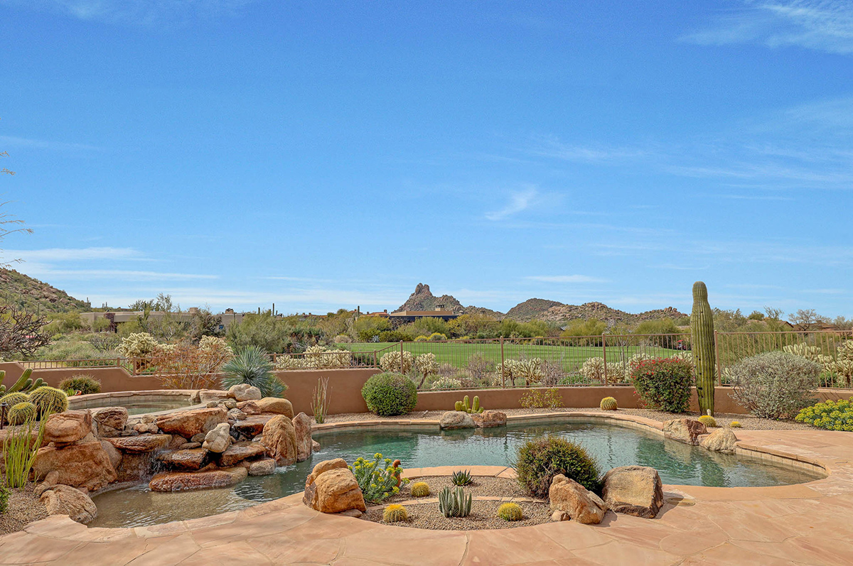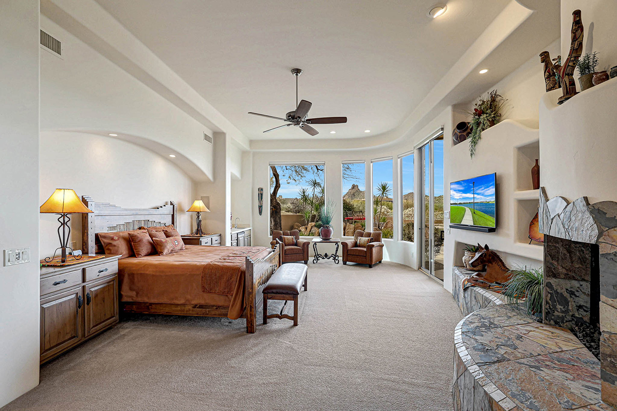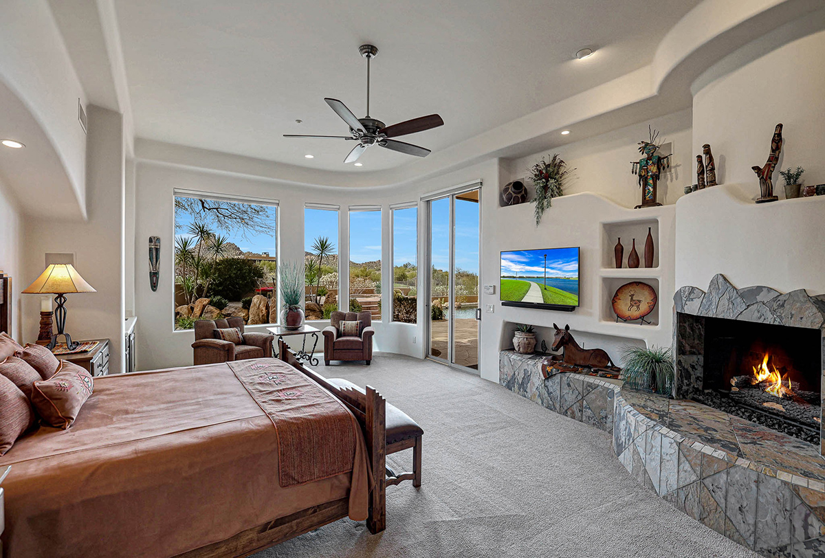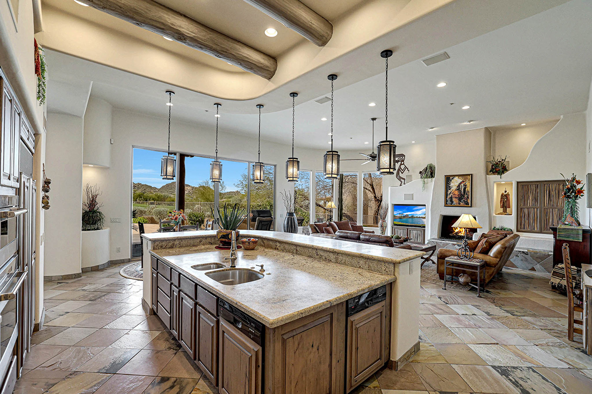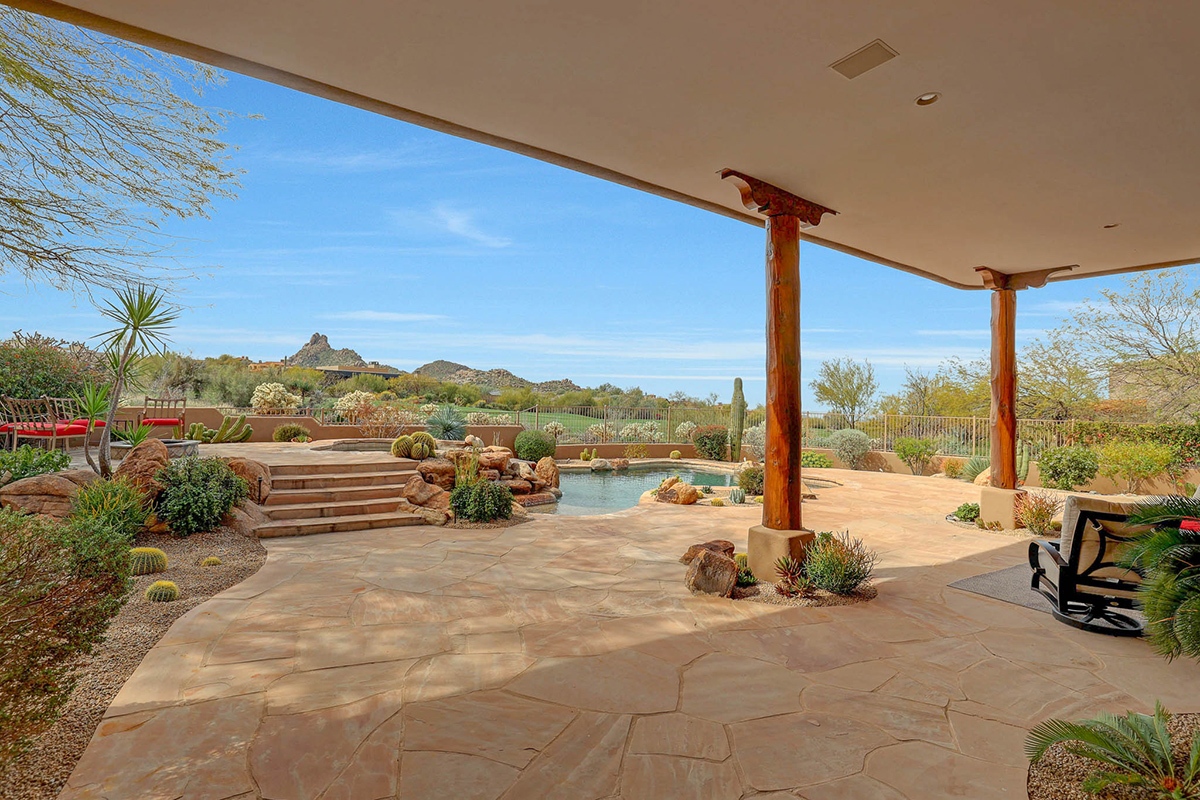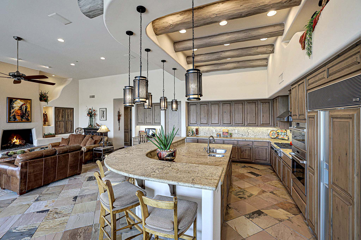 As soon as you step inside take note of the direct view of Pinnacle Peak. No interior steps on the main level. With four spacious bedrooms, each accompanied by en suite baths, along with an additional den/office and two powder baths, this home provides ample space and privacy for residents and guests alike. The upstairs bedroom suite is perfect for visiting guests as it offers its own kitchenette, private balcony, and privacy. The interior showcases meticulous attention to detail, with custom features throughout including slate stone floors and details, curved accents and beamed and latilla wood accents.