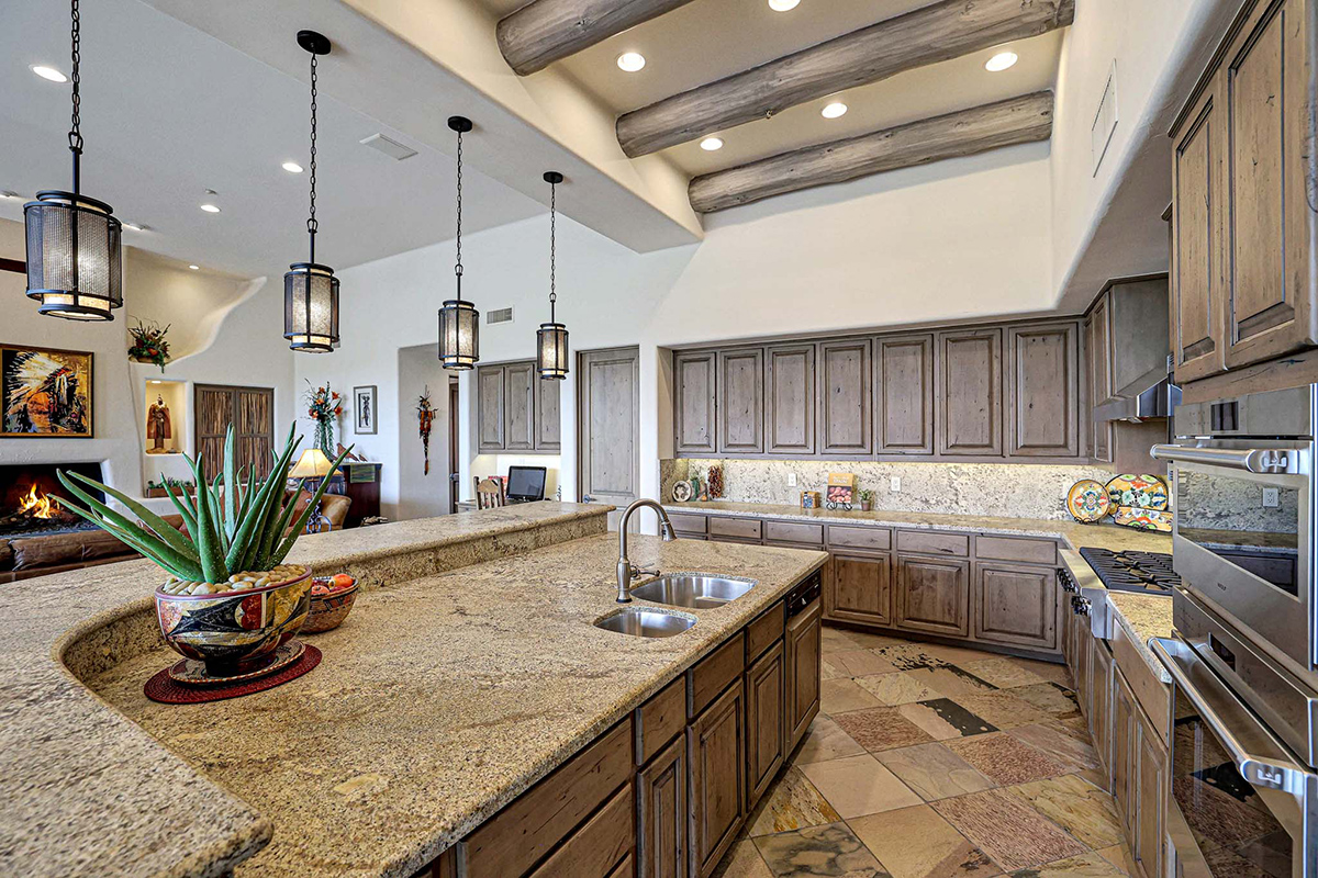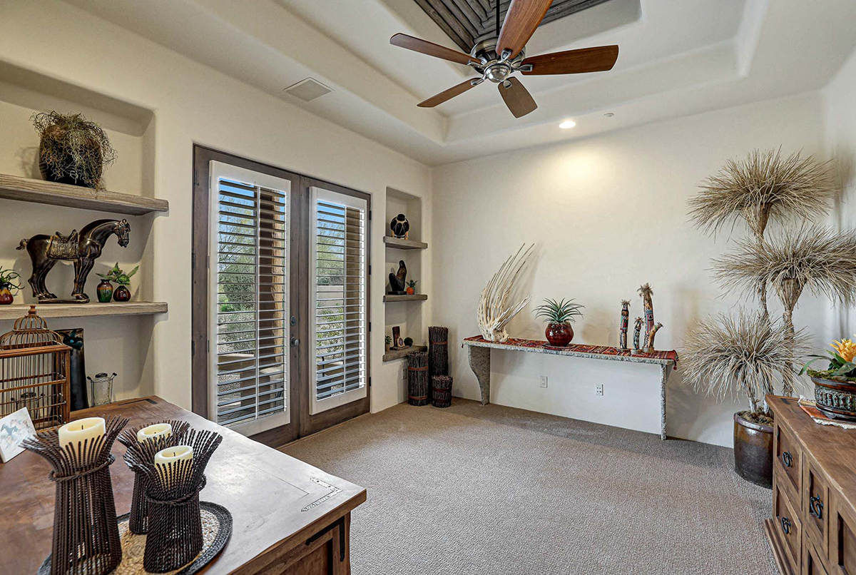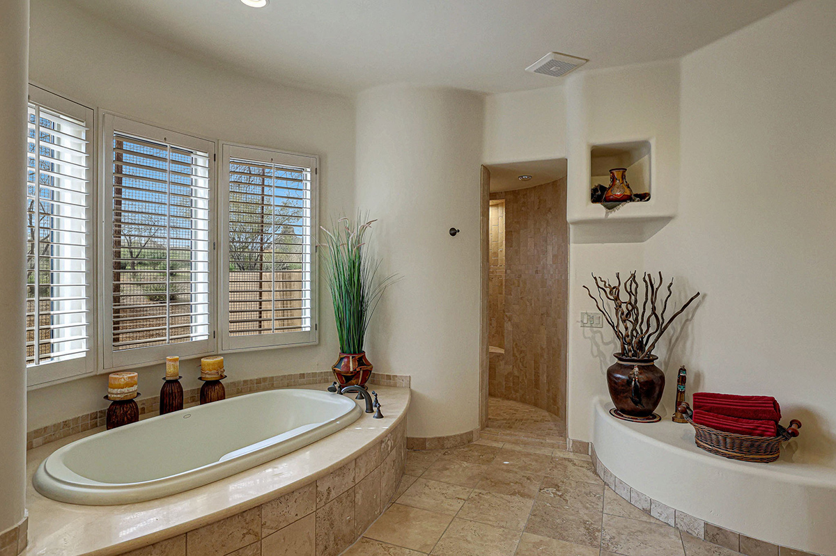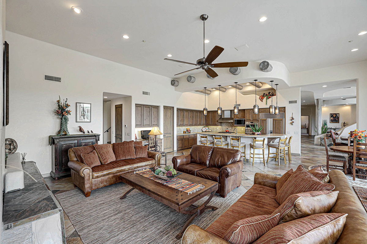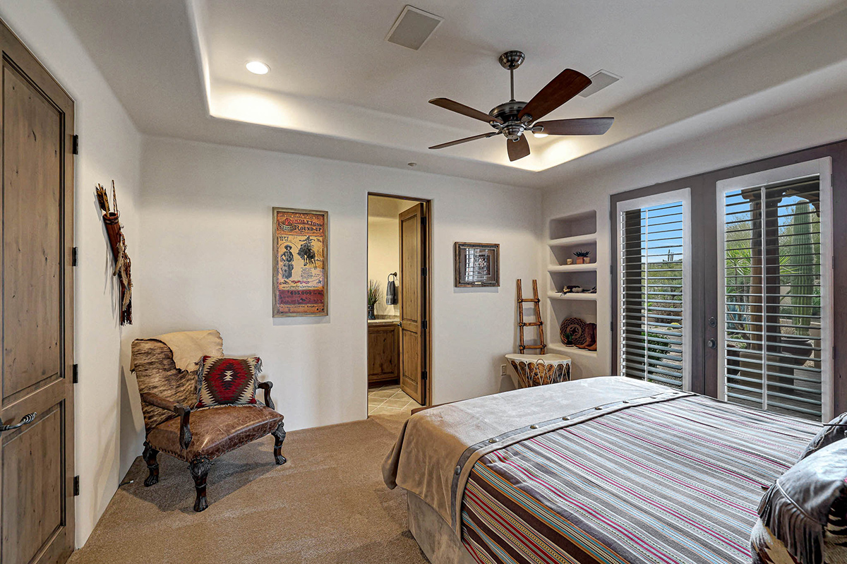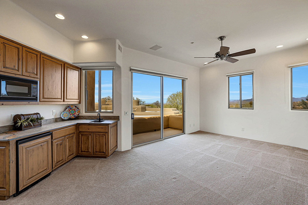 As soon as you step inside take note of the direct view of Pinnacle Peak. No interior steps on the main level. With four spacious bedrooms, each accompanied by en suite baths, along with an additional den/office and two powder baths, this home provides ample space and privacy for residents and guests alike. The upstairs bedroom suite is perfect for visiting guests as it offers its own kitchenette, private balcony, and privacy. The interior showcases meticulous attention to detail, with custom features throughout including slate stone floors and details, curved accents and beamed and latilla wood accents.