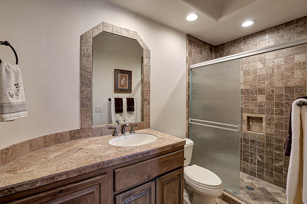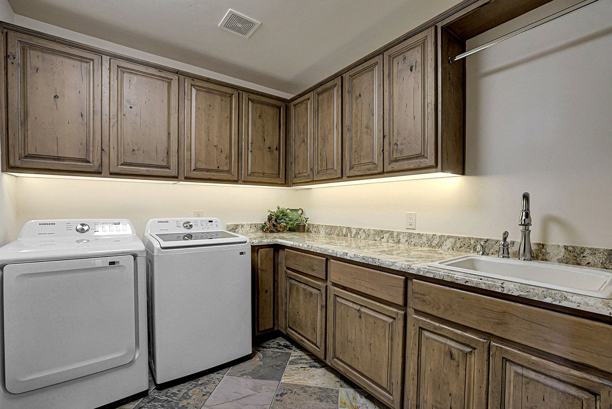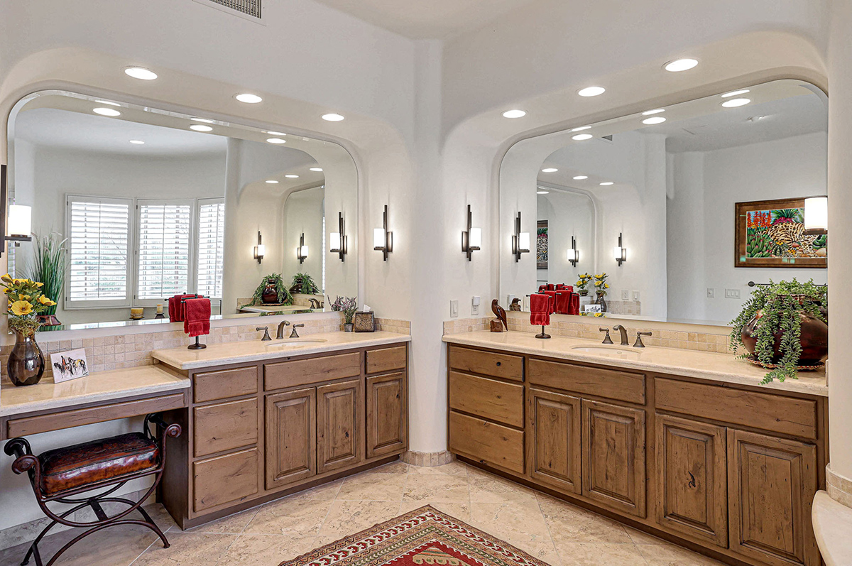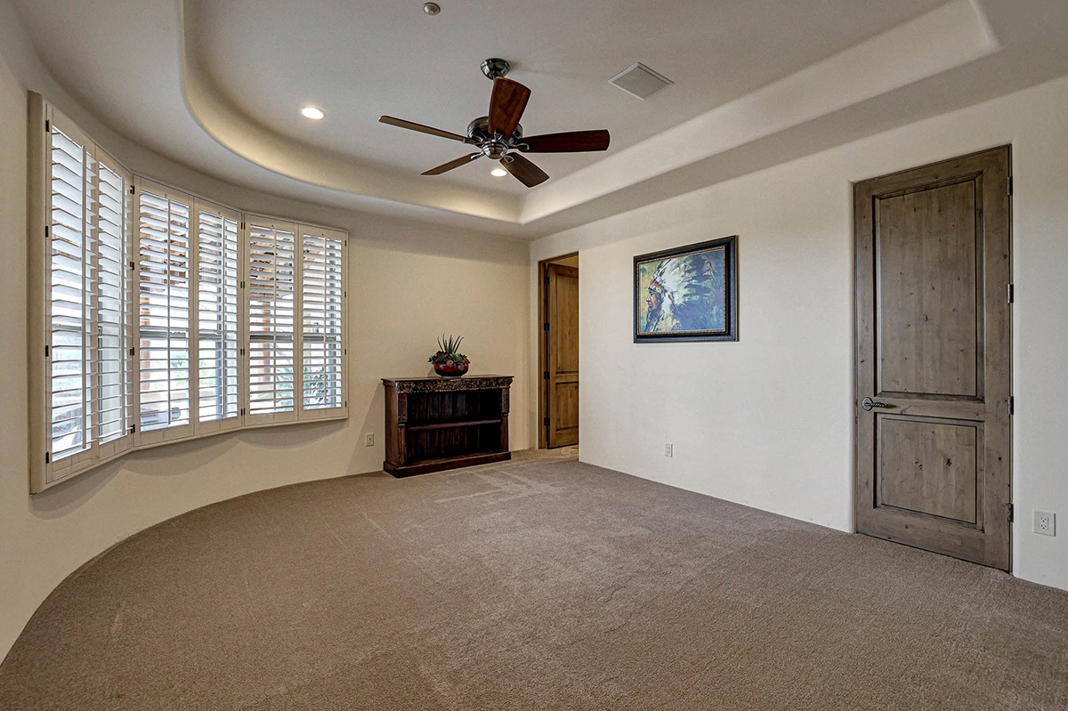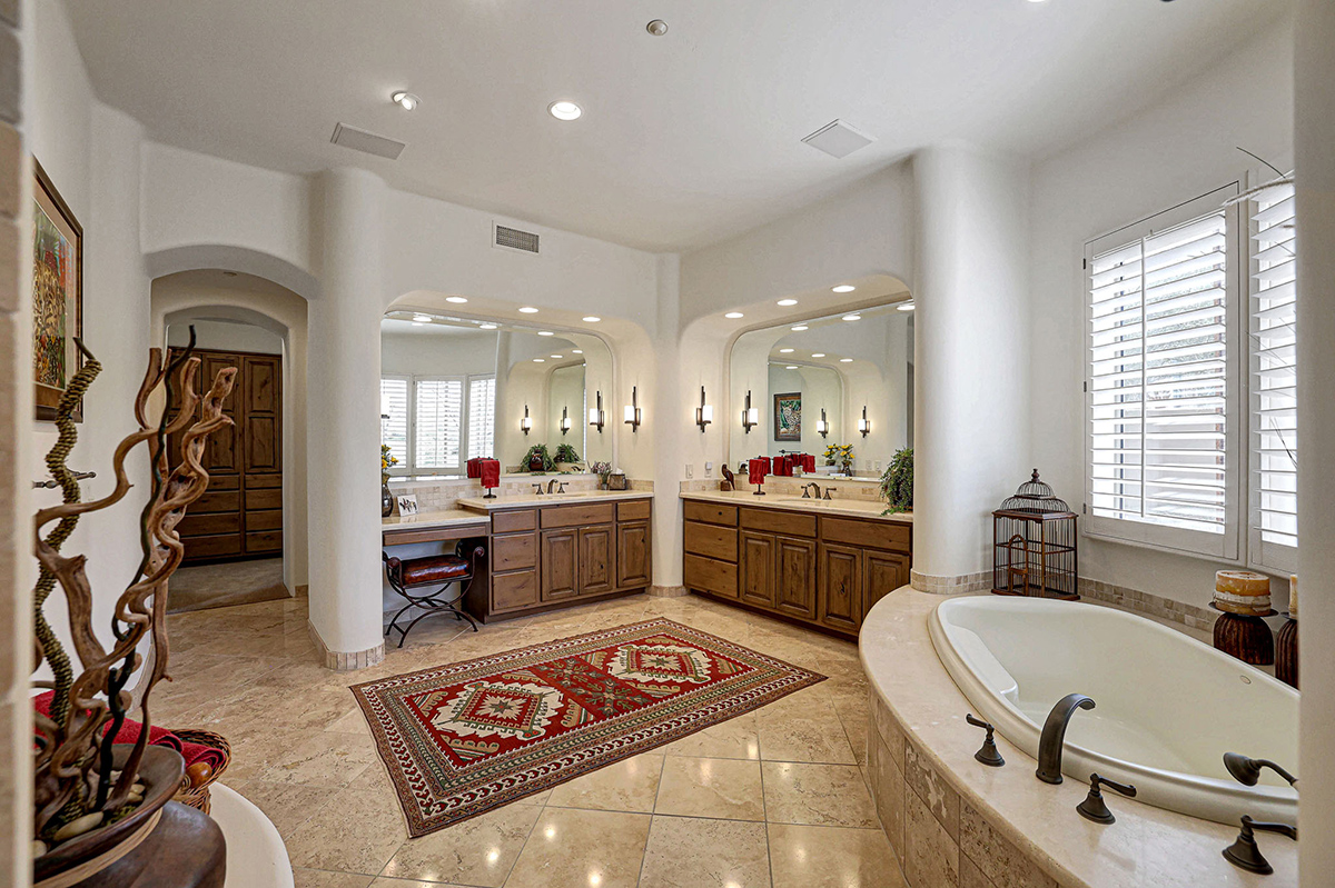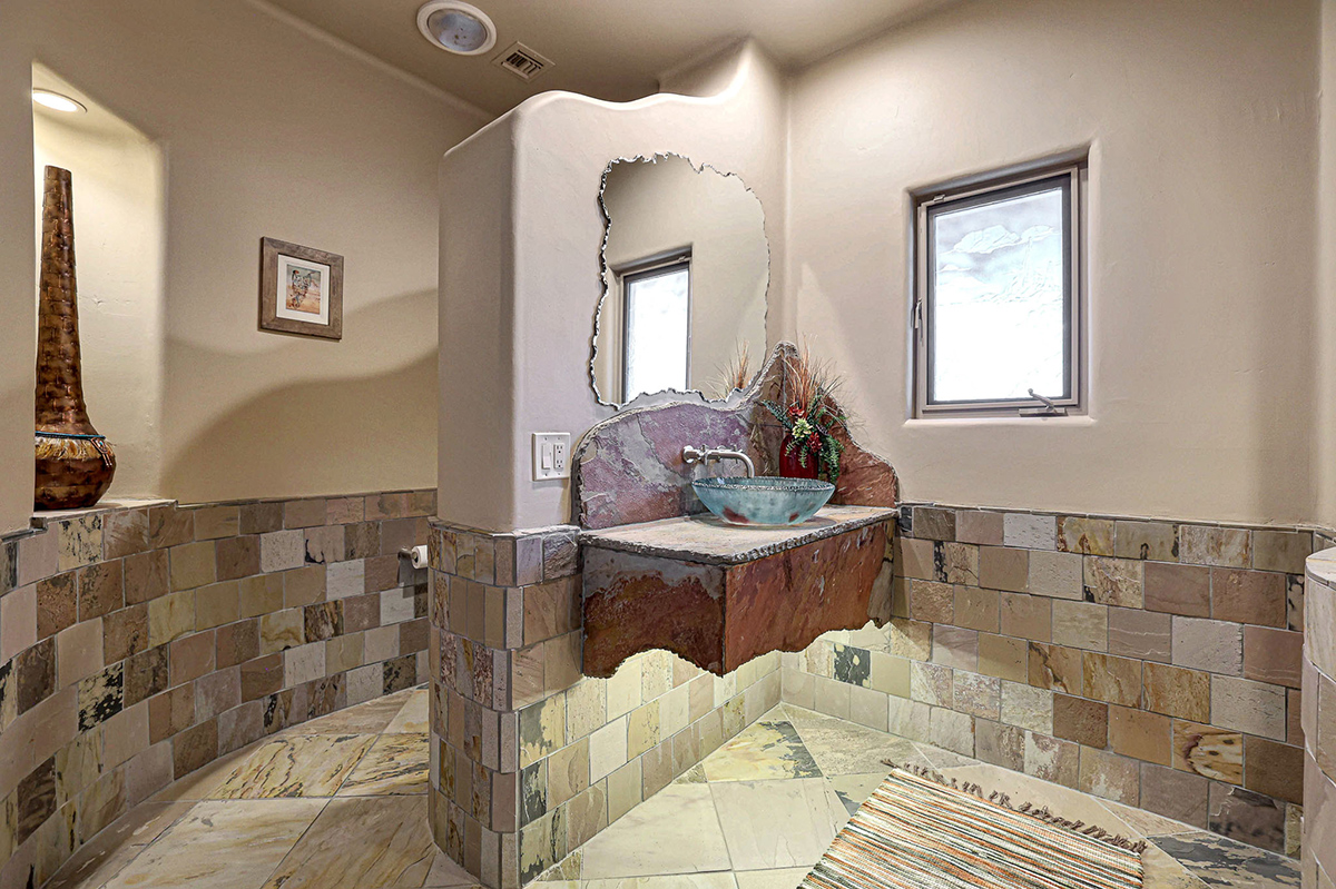 As soon as you step inside take note of the direct view of Pinnacle Peak. No interior steps on the main level. With four spacious bedrooms, each accompanied by en suite baths, along with an additional den/office and two powder baths, this home provides ample space and privacy for residents and guests alike. The upstairs bedroom suite is perfect for visiting guests as it offers its own kitchenette, private balcony, and privacy. The interior showcases meticulous attention to detail, with custom features throughout including slate stone floors and details, curved accents and beamed and latilla wood accents.