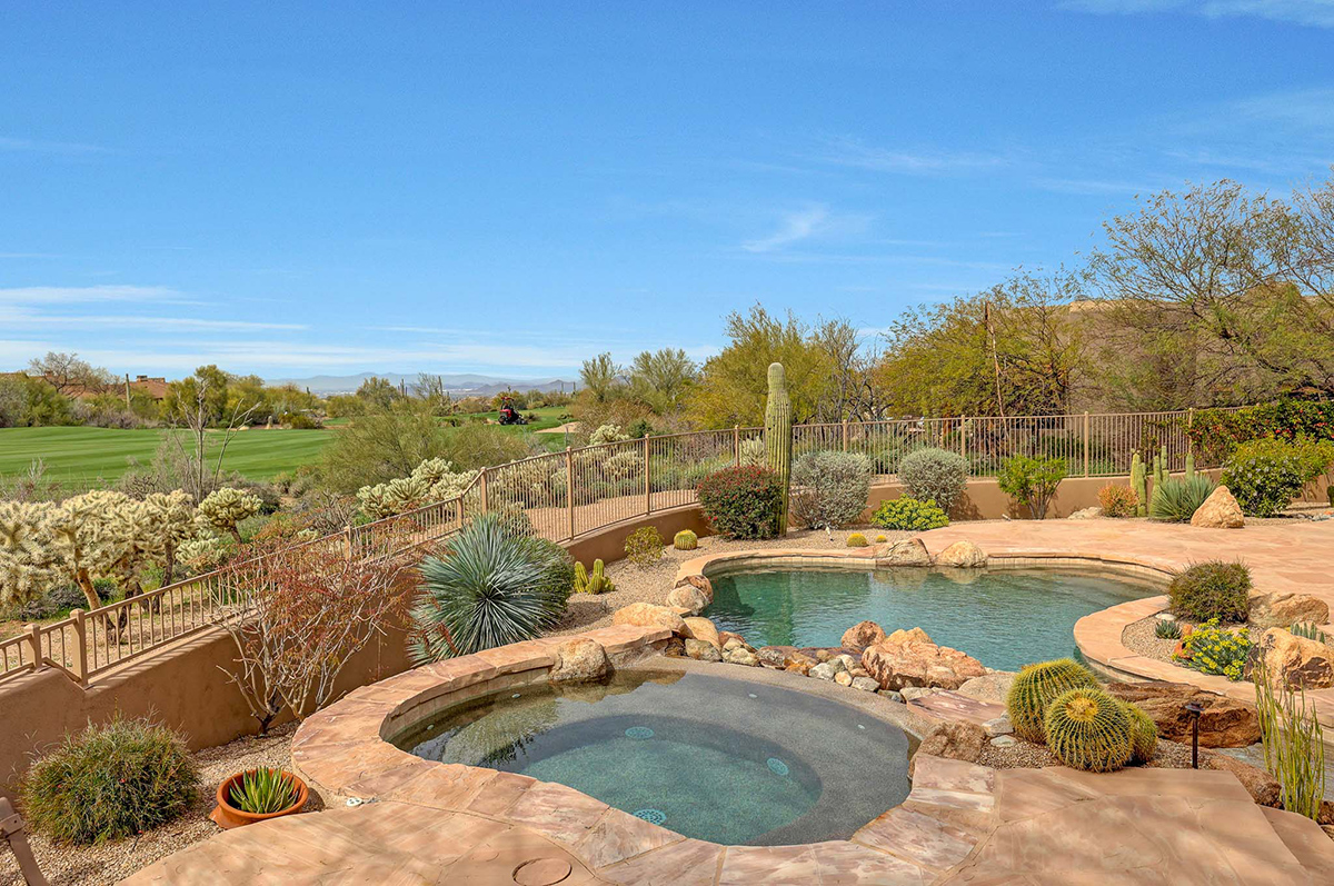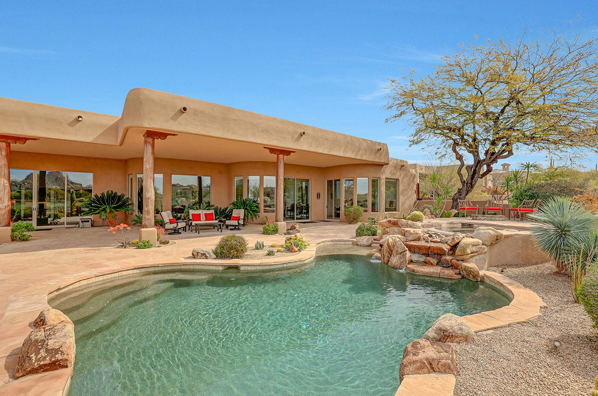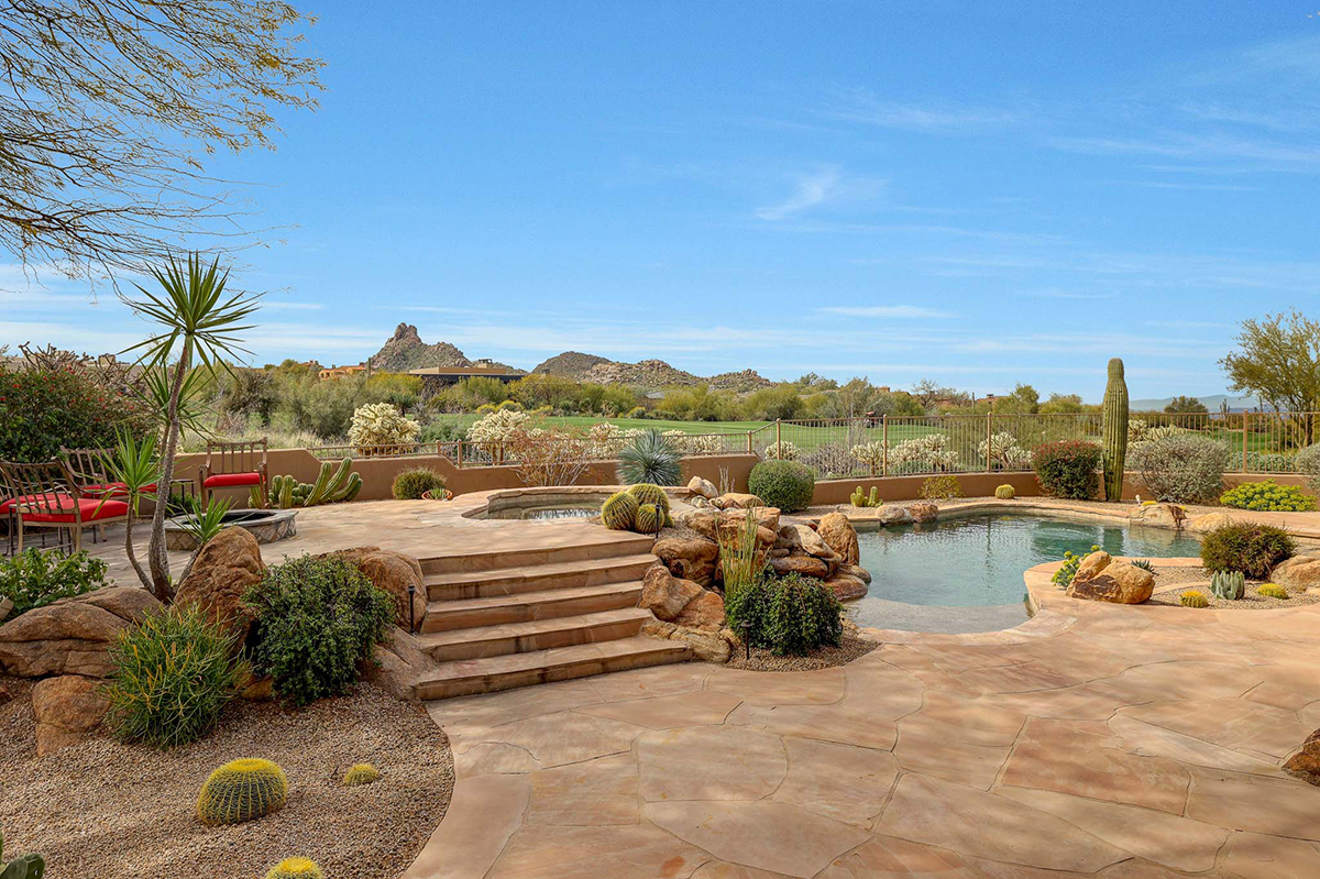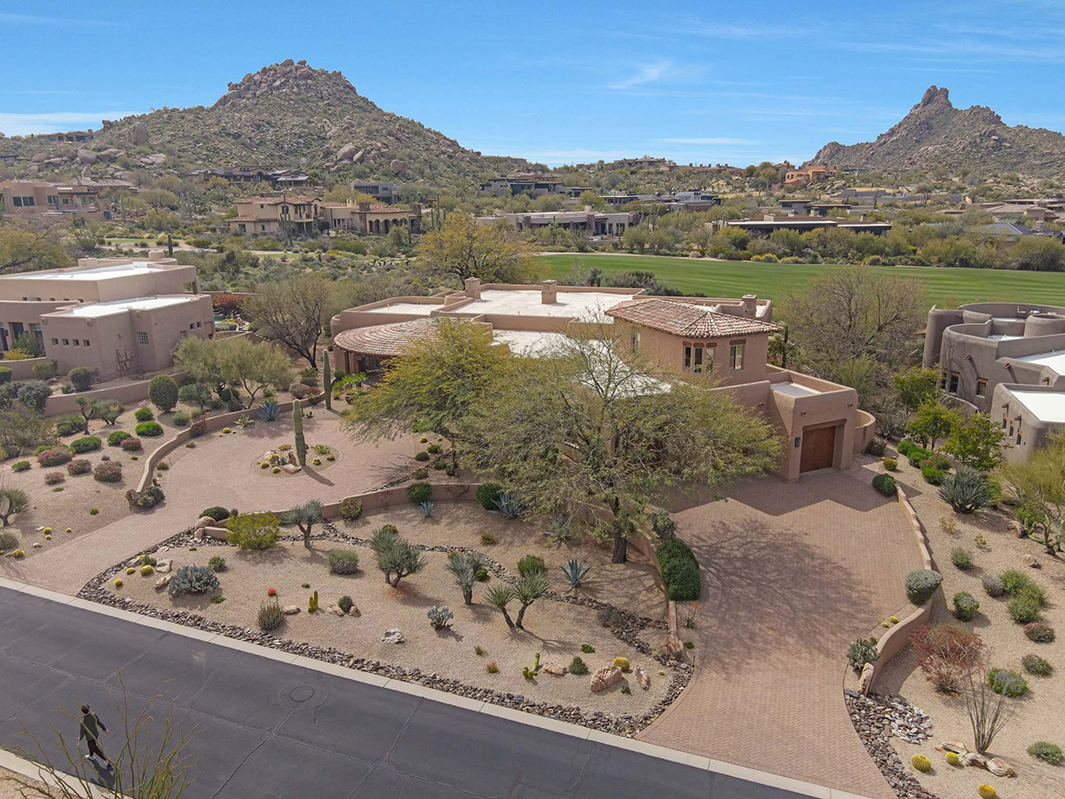 Located in the gated community of Pinnacle Canyon at Troon North, this stunning custom Southwest-inspired estate offers an unparalleled living experience. Situated along the 17th fairway of the Monument course at Troon North Golf Club, the residence boasts breathtaking panoramic views of the golf course, Pinnacle Peak, and captivating sunsets, along with sparkling city lights. Spanning across the landscaped grounds, the property features amenities designed for luxurious living and entertaining. The property comes fully furnished, including all accessories, included in the asking price.