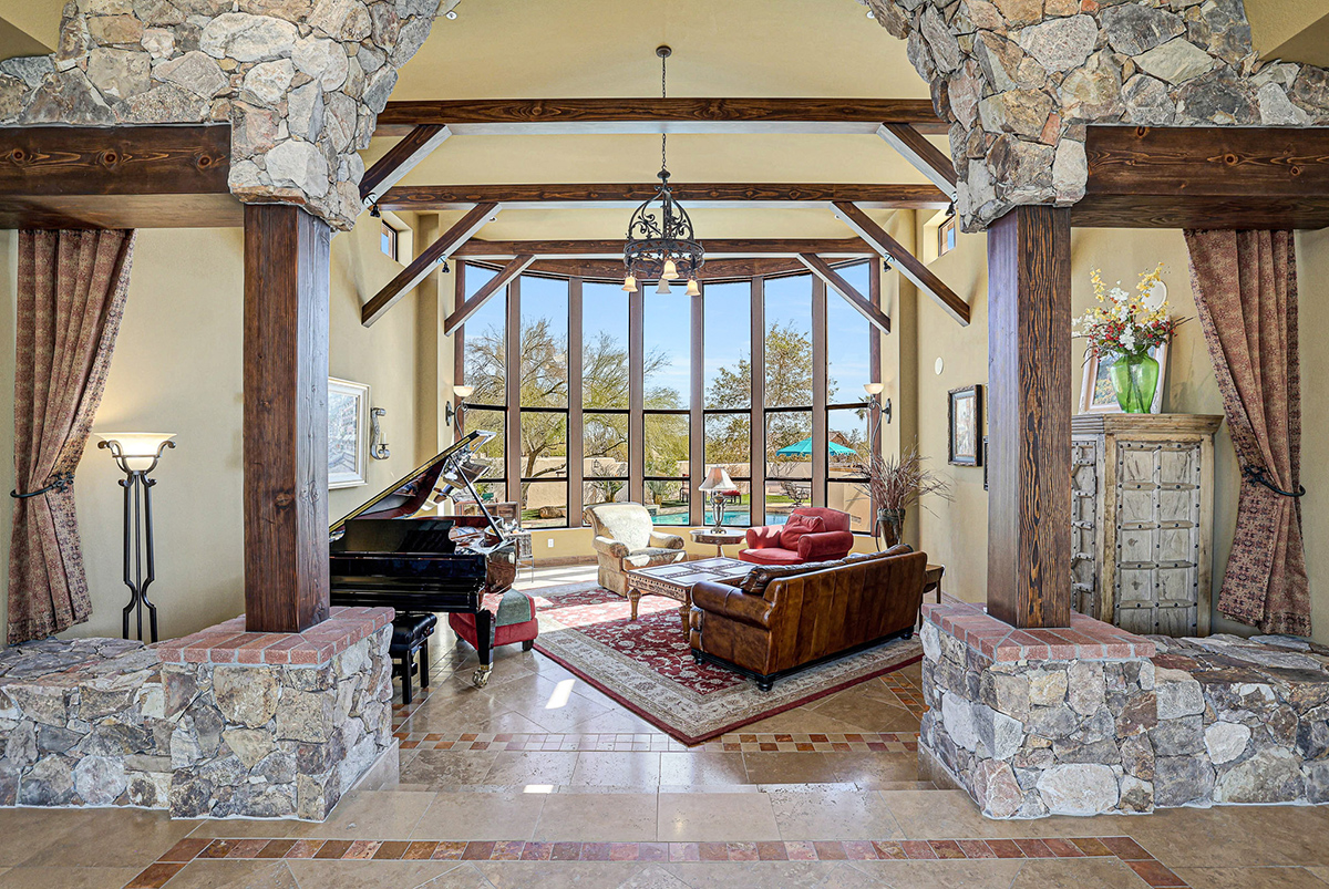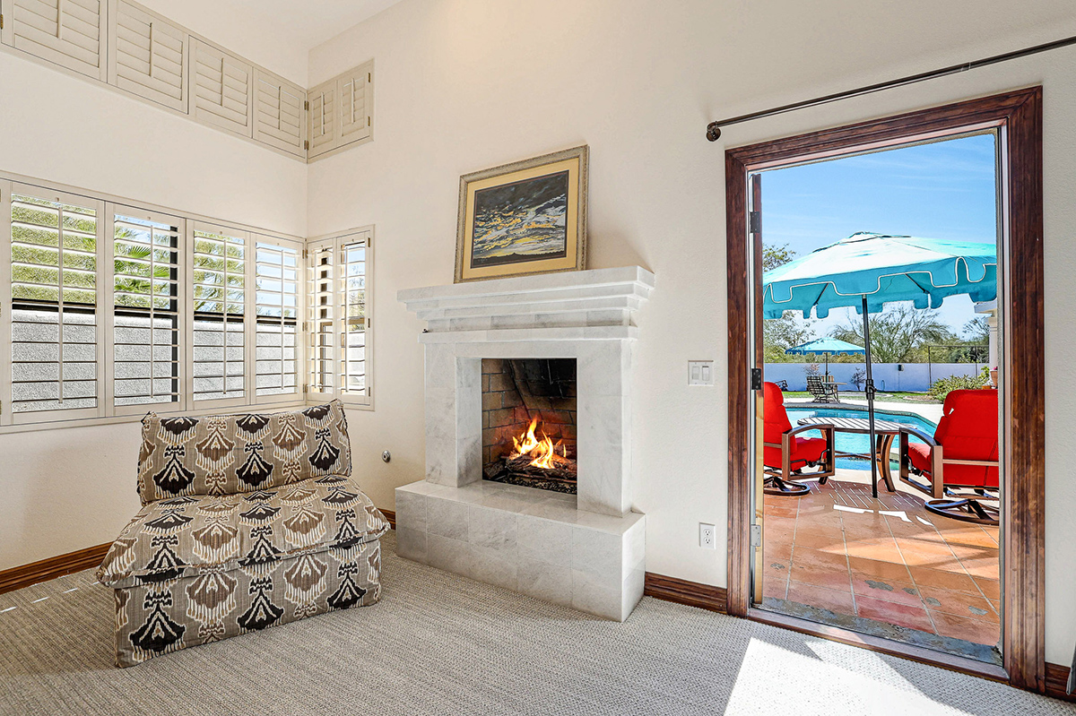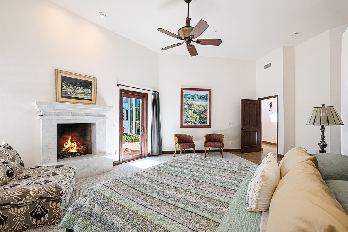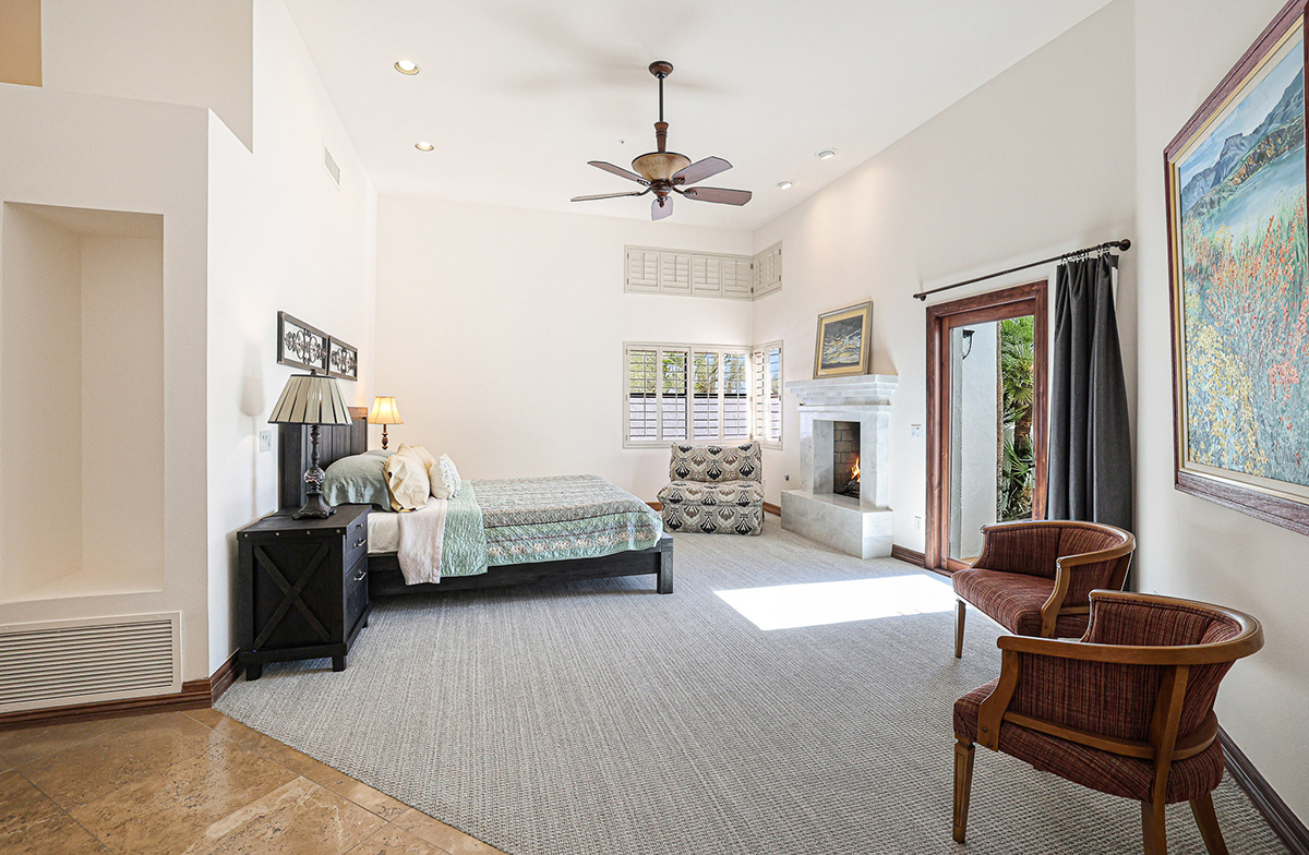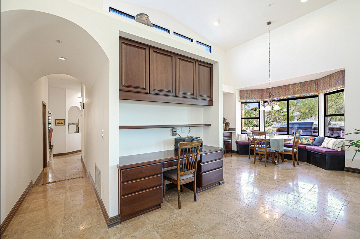 Upon entering, take note of the quality found throughout including the beamed ceilings, stone accents, floor-to-ceiling, and clerestory windows. The primary suite has exterior access to a private patio, spa, and a fireplace, providing a tranquil retreat. The primary bath has a large soaking tub, dual vanities, and travertine surfaces. Adjacent to the primary suite is the office with floor-to-ceiling wood bookshelves, a hidden Murphy bed, and box beam ceilings, next to a full bathroom.