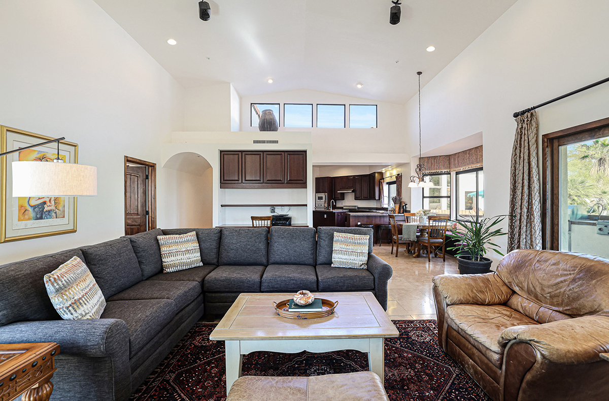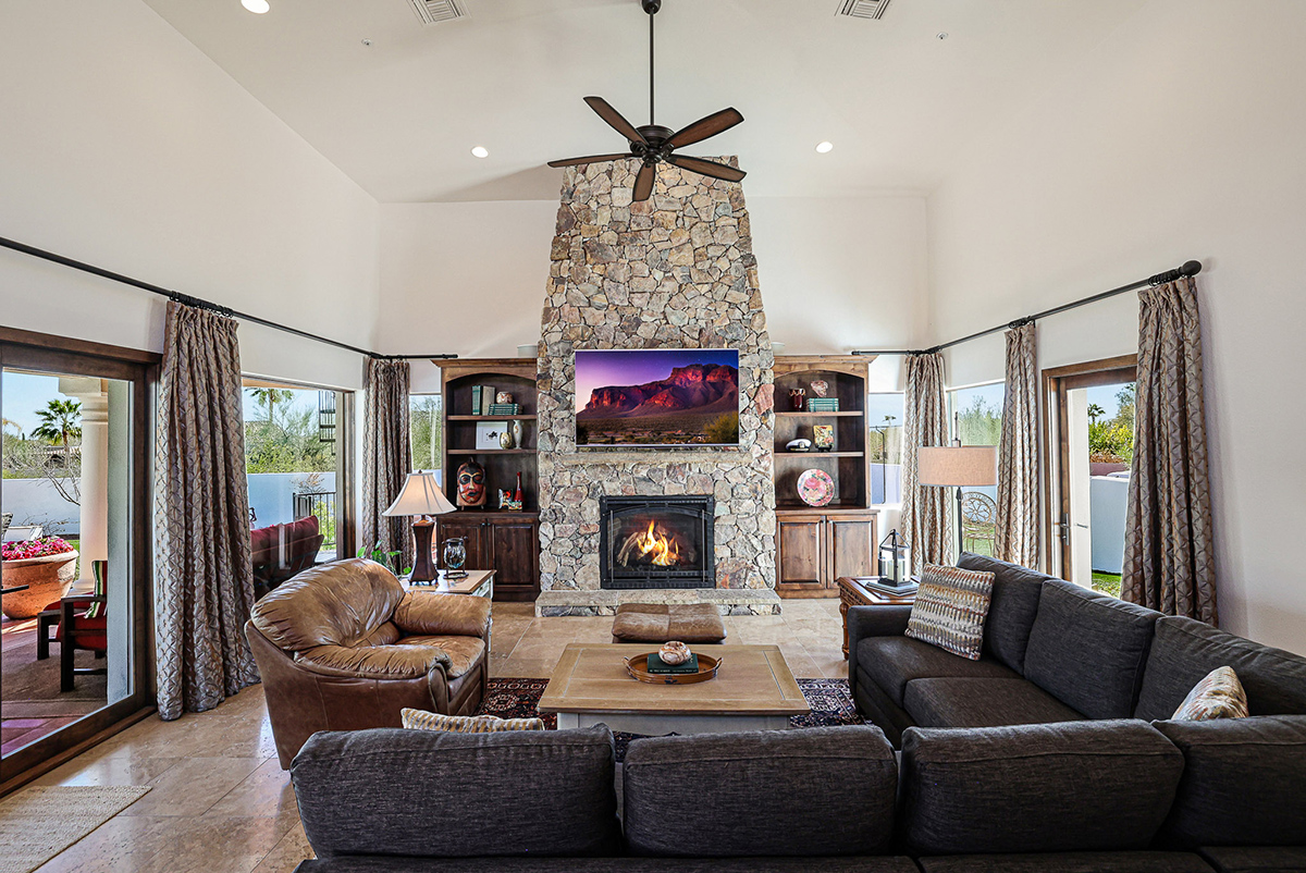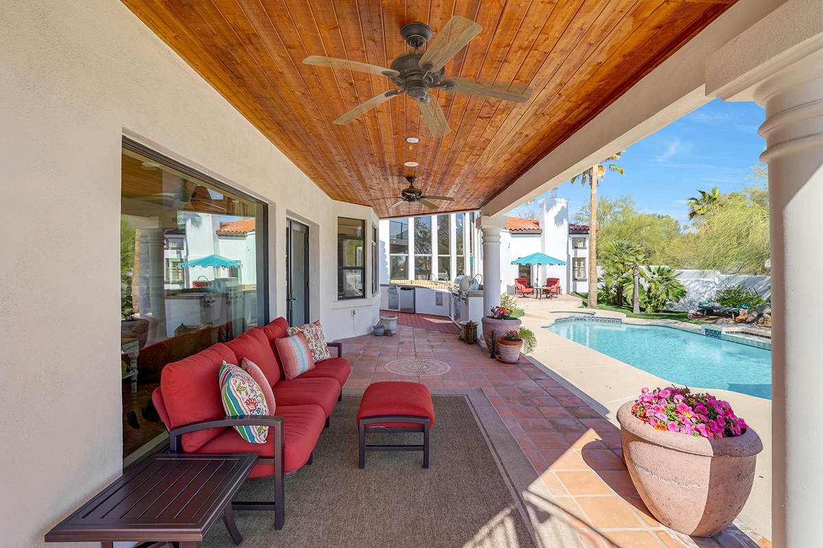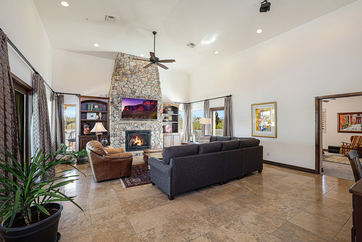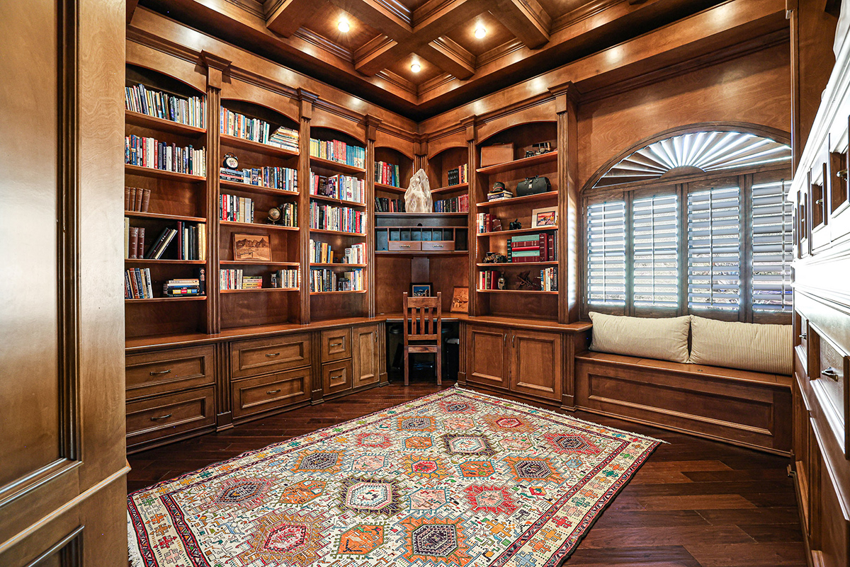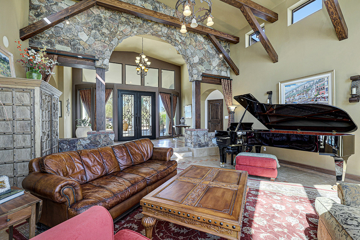 Upon entering, take note of the quality found throughout including the beamed ceilings, stone accents, floor-to-ceiling, and clerestory windows. The primary suite has exterior access to a private patio, spa, and a fireplace, providing a tranquil retreat. The primary bath has a large soaking tub, dual vanities, and travertine surfaces. Adjacent to the primary suite is the office with floor-to-ceiling wood bookshelves, a hidden Murphy bed, and box beam ceilings, next to a full bathroom.
