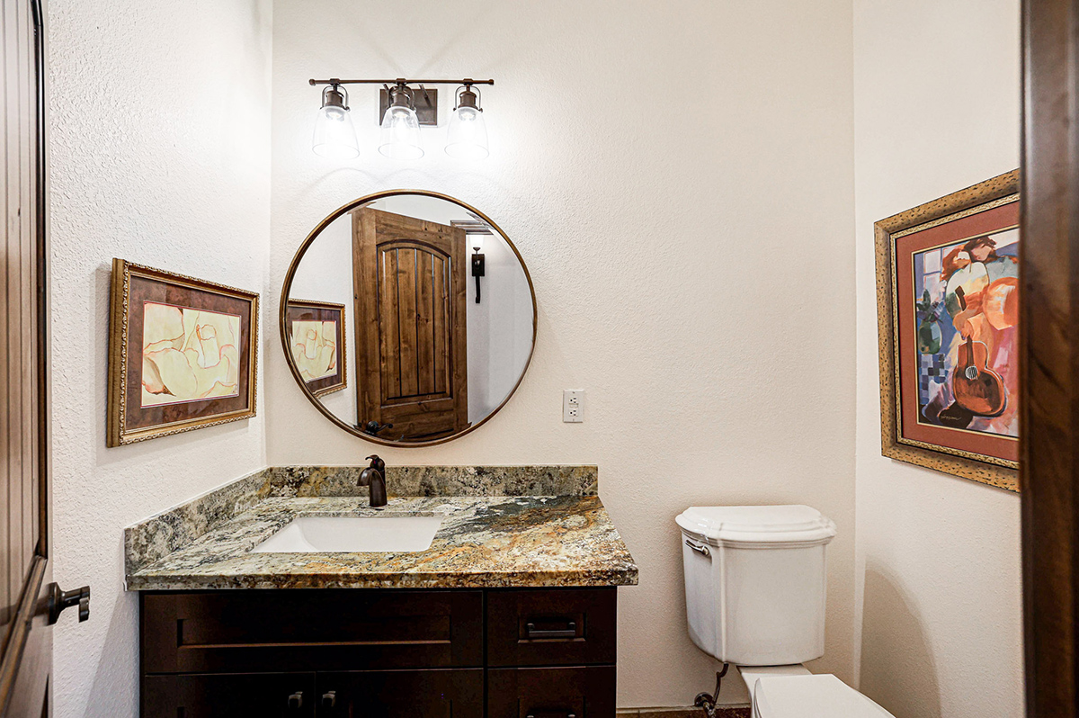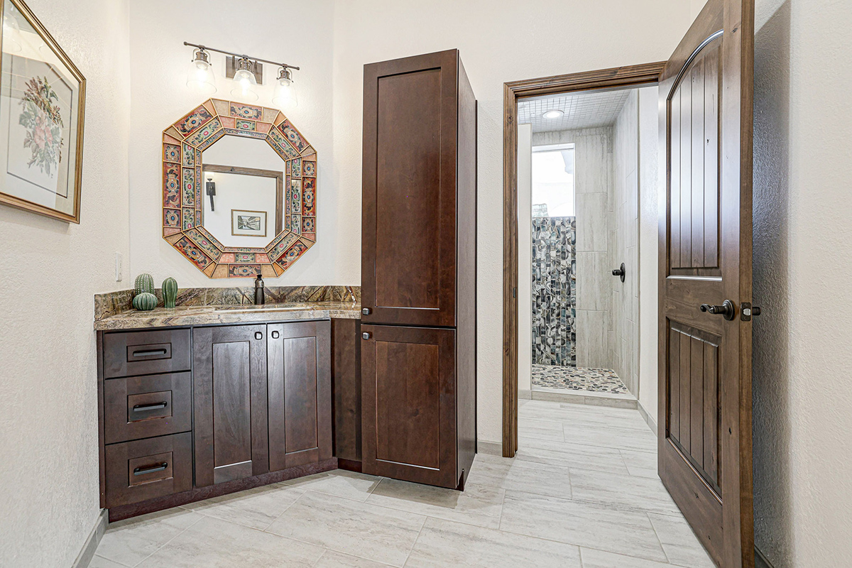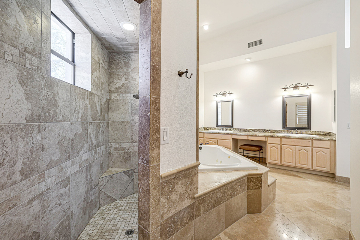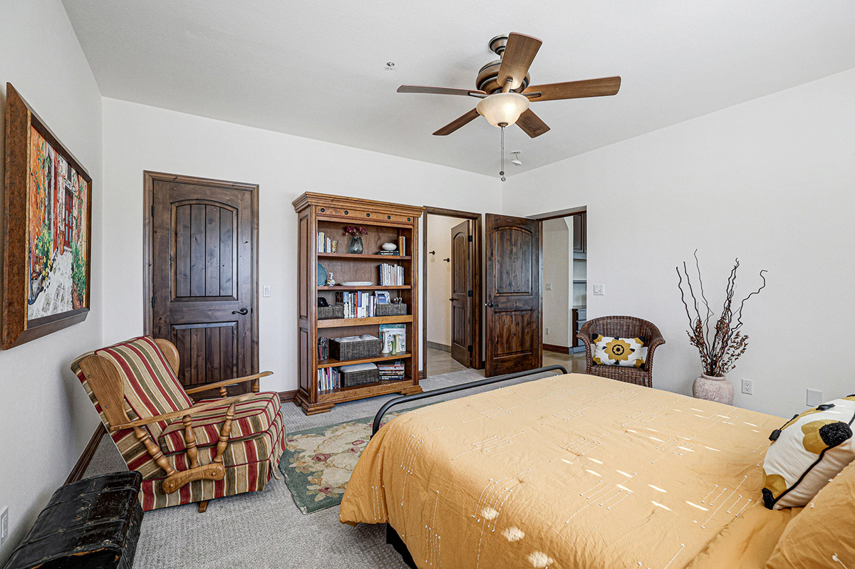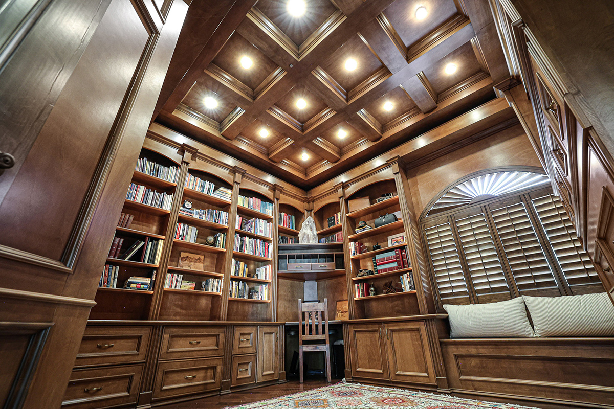 Upon entering, take note of the quality found throughout including the beamed ceilings, stone accents, floor-to-ceiling, and clerestory windows. The primary suite has exterior access to a private patio, spa, and a fireplace, providing a tranquil retreat. The primary bath has a large soaking tub, dual vanities, and travertine surfaces. Adjacent to the primary suite is the office with floor-to-ceiling wood bookshelves, a hidden Murphy bed, and box beam ceilings, next to a full bathroom.