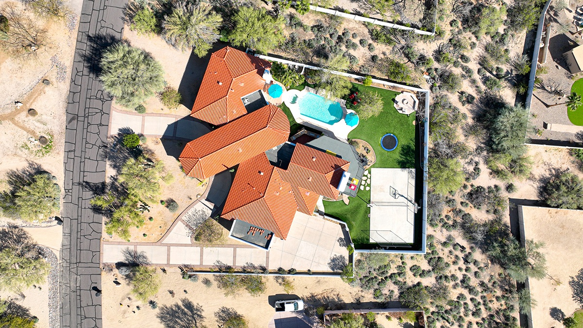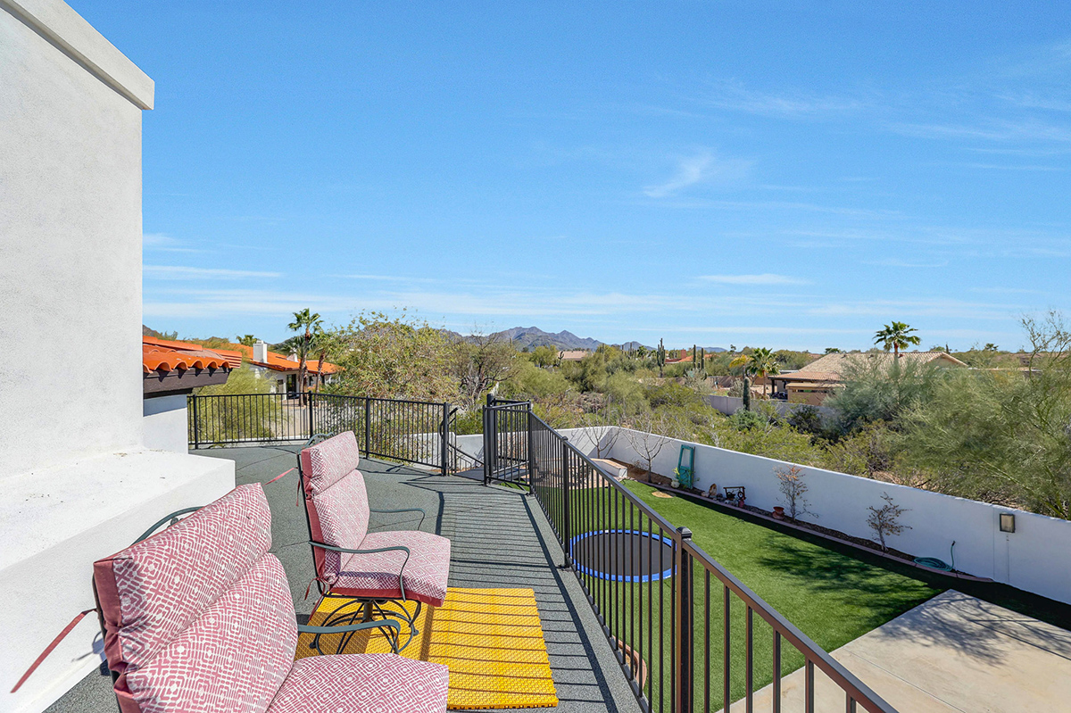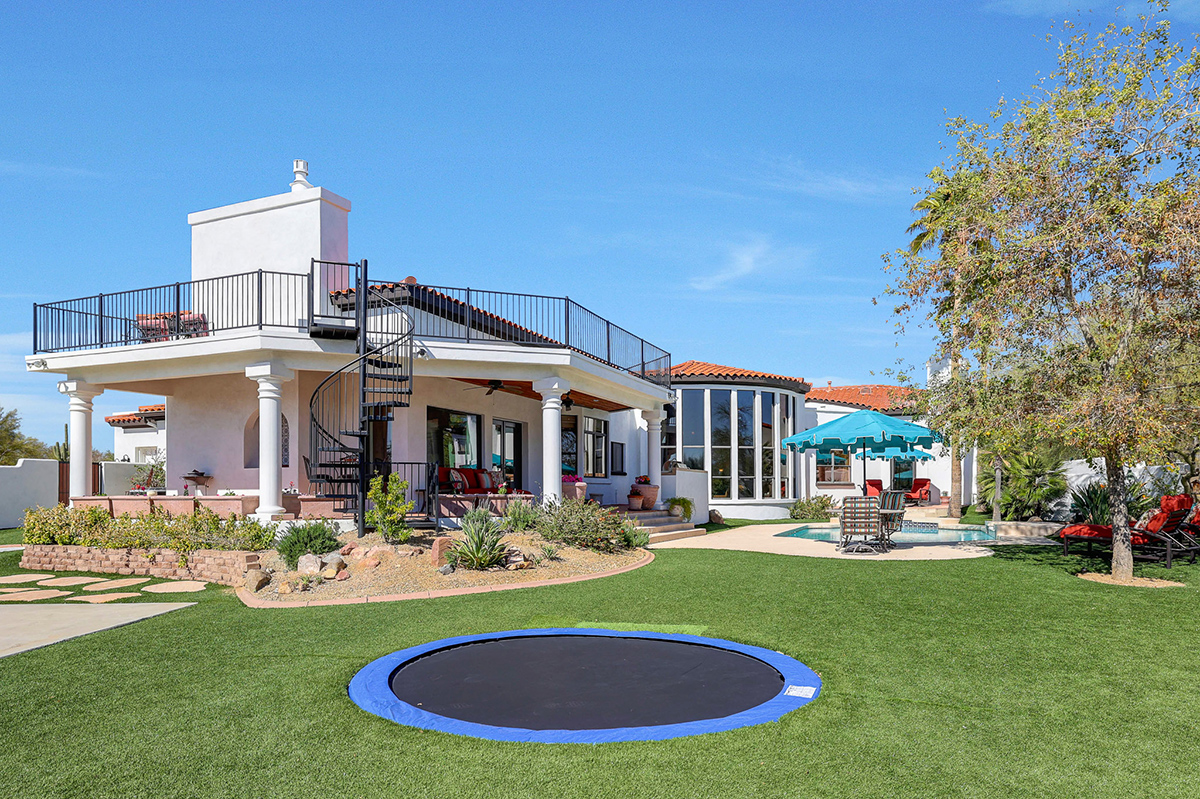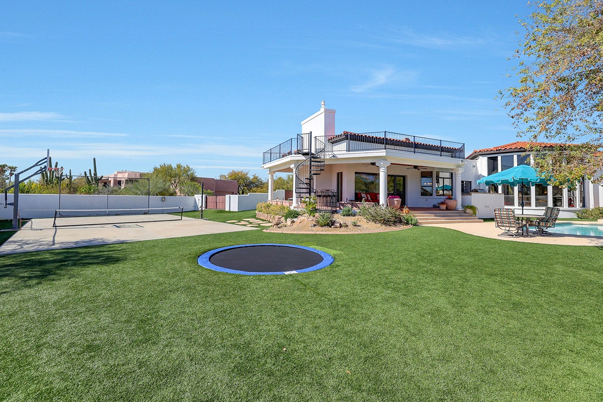 The exterior of the home has undergone recent enhancements, including new smooth stucco and paint on the house, walls, seating areas, and fire pit. The flat roof was recoated in May 2023. A pickleball court with a new net and an in ground trampoline create fun spaces. A large rooftop deck with McDowell mountain views. A sparkling pool, an elevated covered patio and an outdoor kitchen setup round out this resort-style yard.