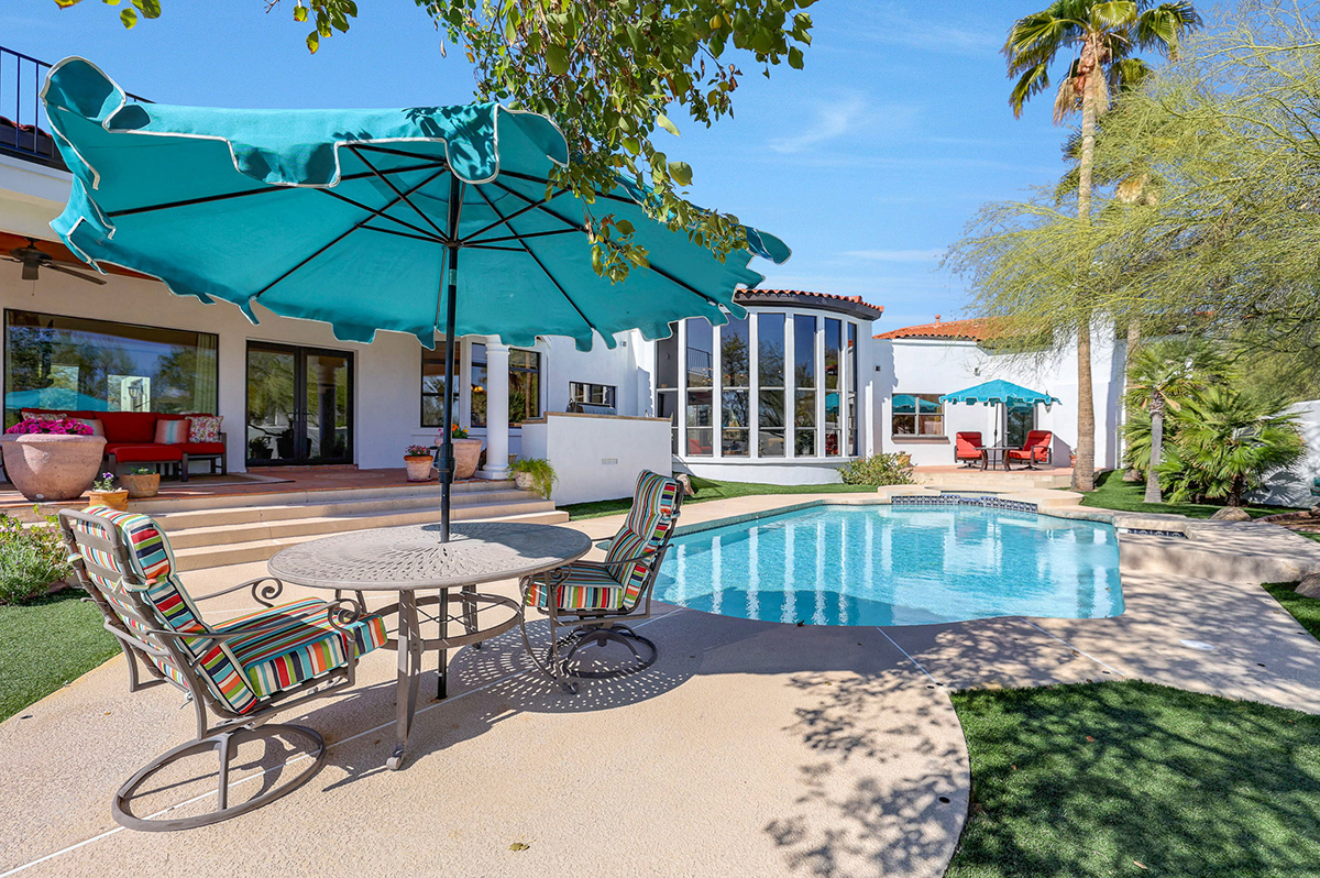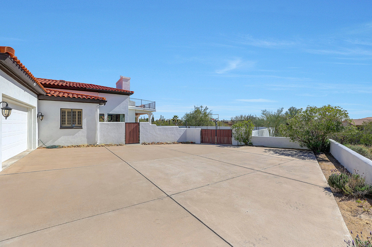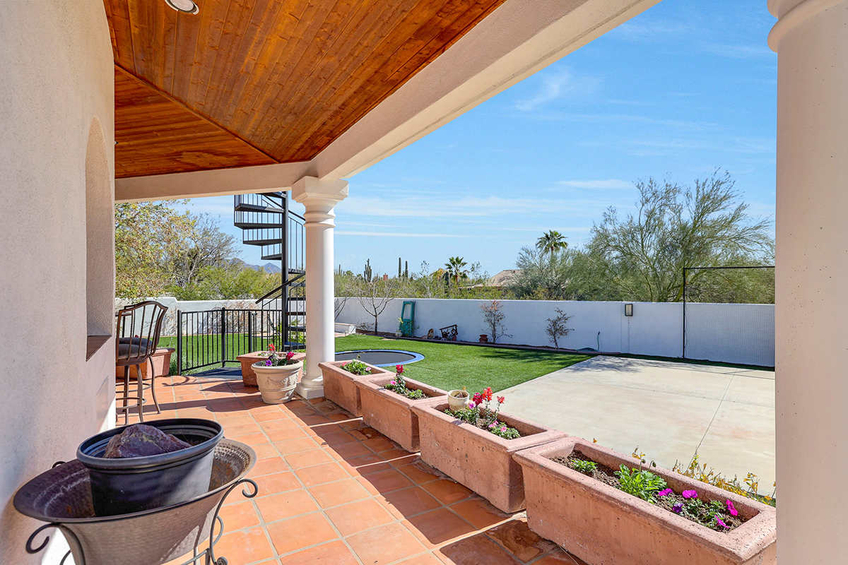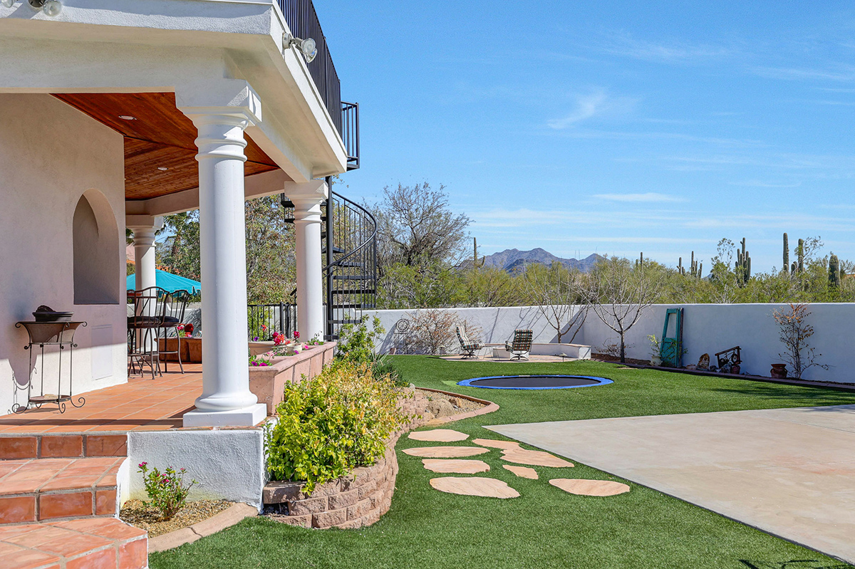 The exterior of the home has undergone recent enhancements, including new smooth stucco and paint on the house, walls, seating areas, and fire pit. The flat roof was recoated in May 2023. A pickleball court with a new net and an in ground trampoline create fun spaces. A large rooftop deck with McDowell mountain views. A sparkling pool, an elevated covered patio and an outdoor kitchen setup round out this resort-style yard.