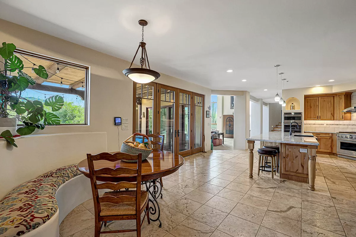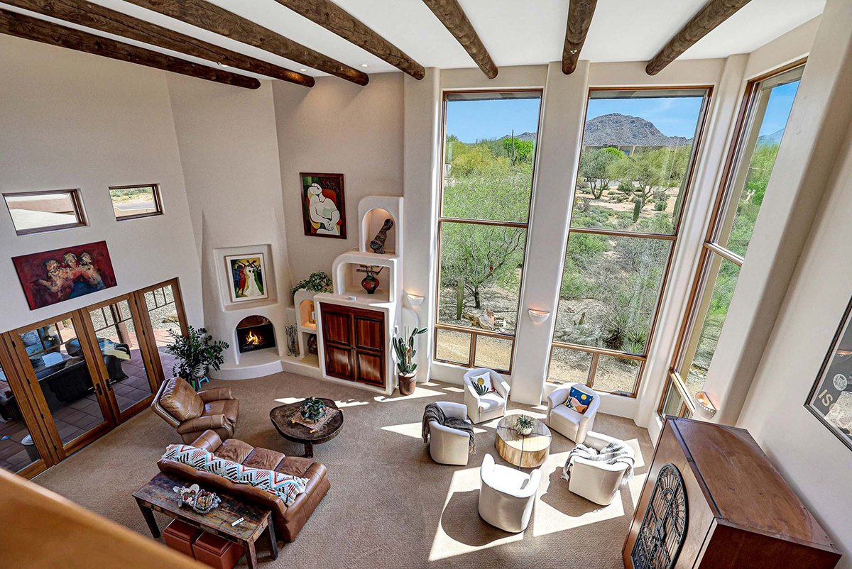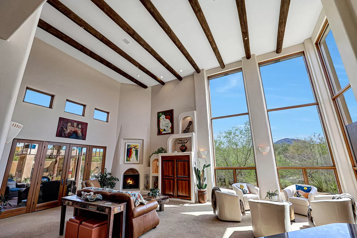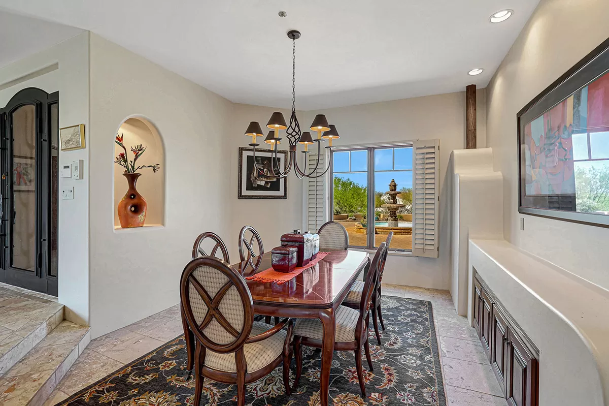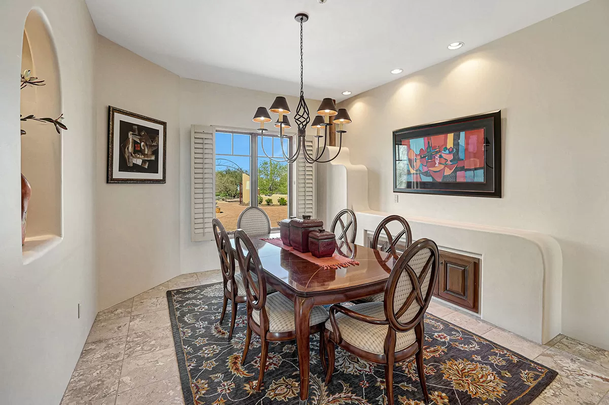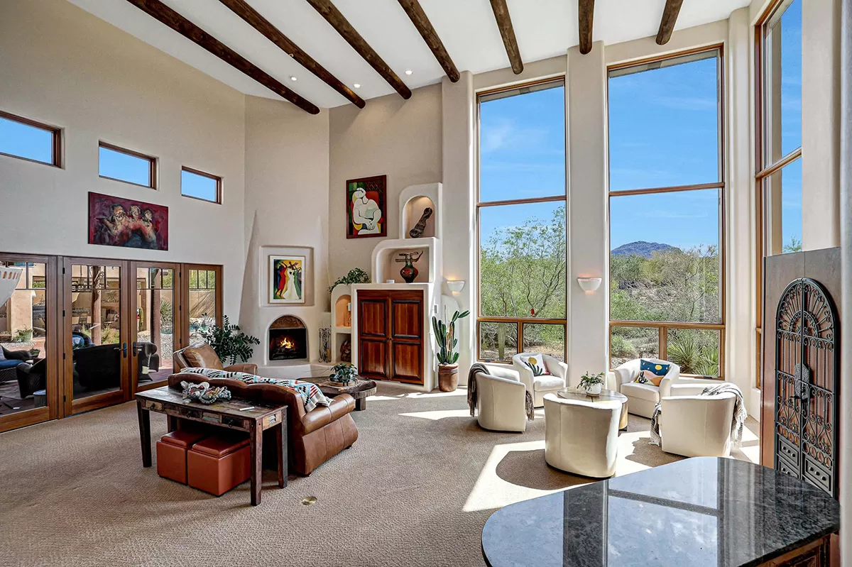 The heart of the home is the chef’s dream kitchen, boasting custom cabinets, quartzite countertops, stainless steel appliances, and a large center island with seating. Enjoy meals in the charming eat-in breakfast nook or entertain guests in the private formal dining room with direct access to the kitchen. Relax and unwind in the expansive living room with soaring beamed ceilings, a kiva fireplace, and floor-to-ceiling picture windows framing panoramic views of the McDowell Mountains.