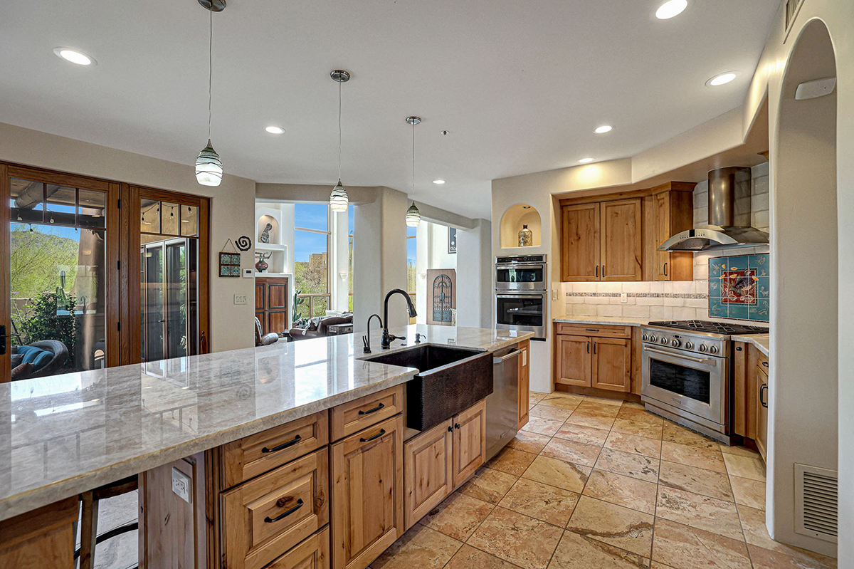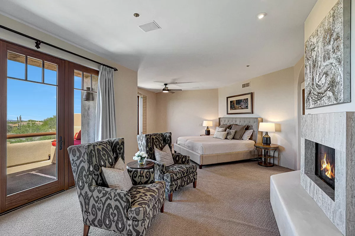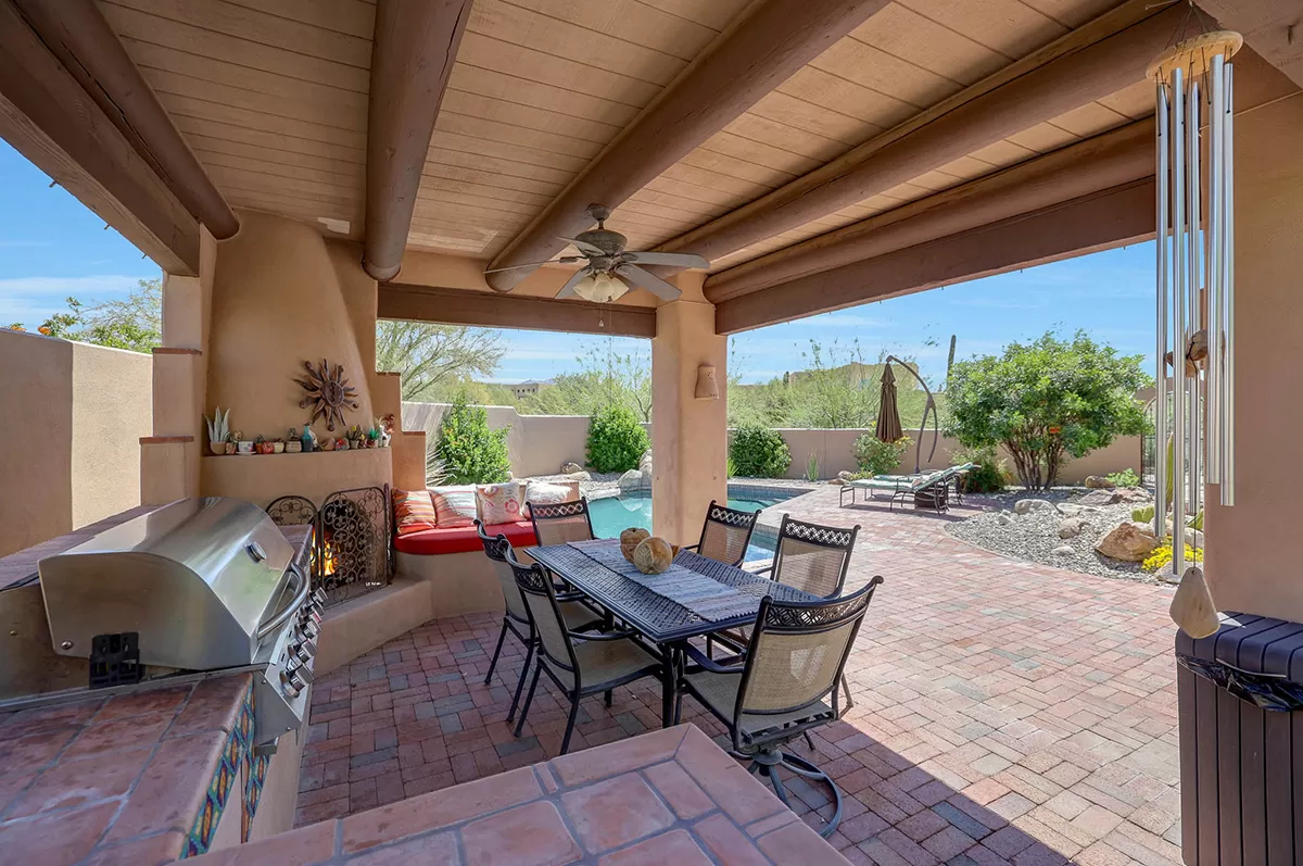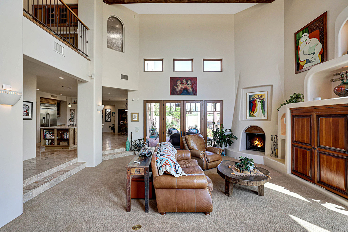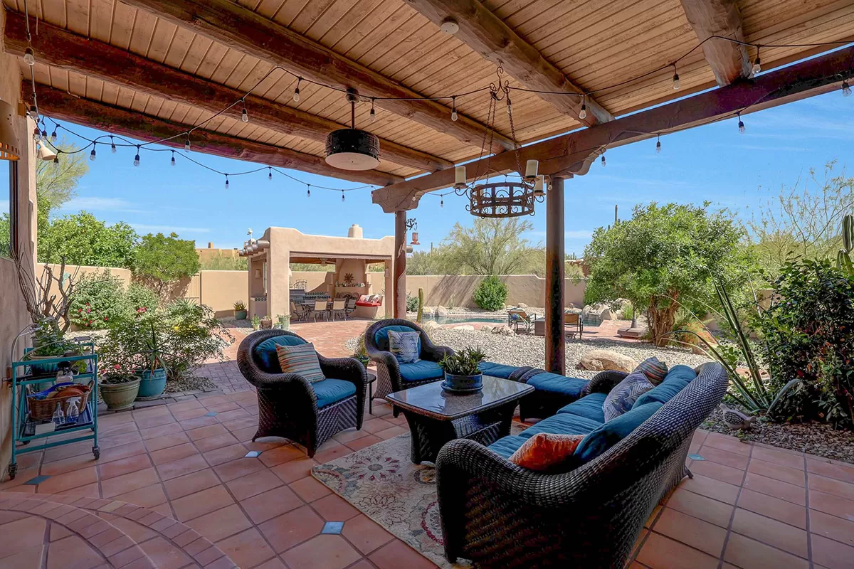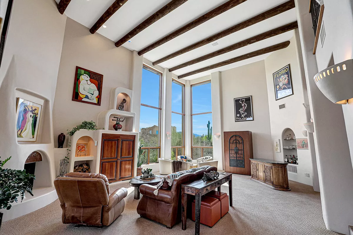 The heart of the home is the chef’s dream kitchen, boasting custom cabinets, quartzite countertops, stainless steel appliances, and a large center island with seating. Enjoy meals in the charming eat-in breakfast nook or entertain guests in the private formal dining room with direct access to the kitchen. Relax and unwind in the expansive living room with soaring beamed ceilings, a kiva fireplace, and floor-to-ceiling picture windows framing panoramic views of the McDowell Mountains.