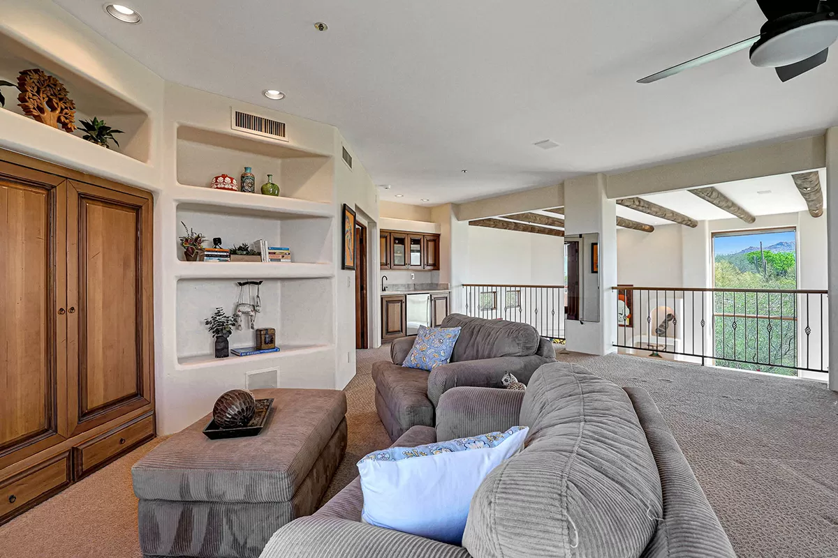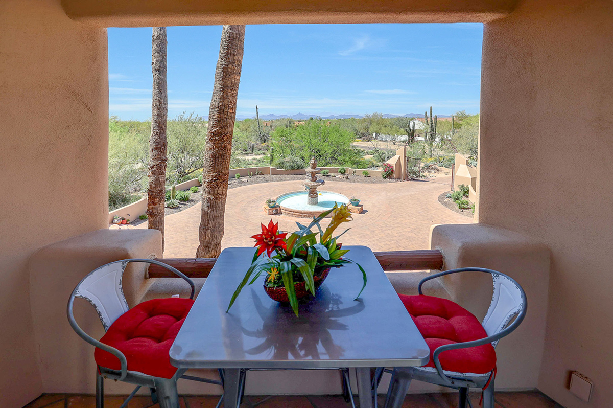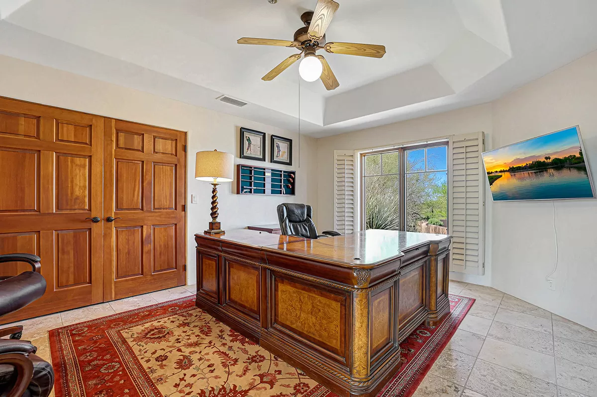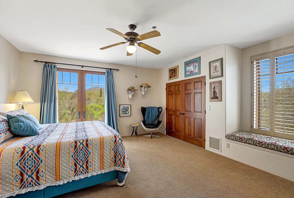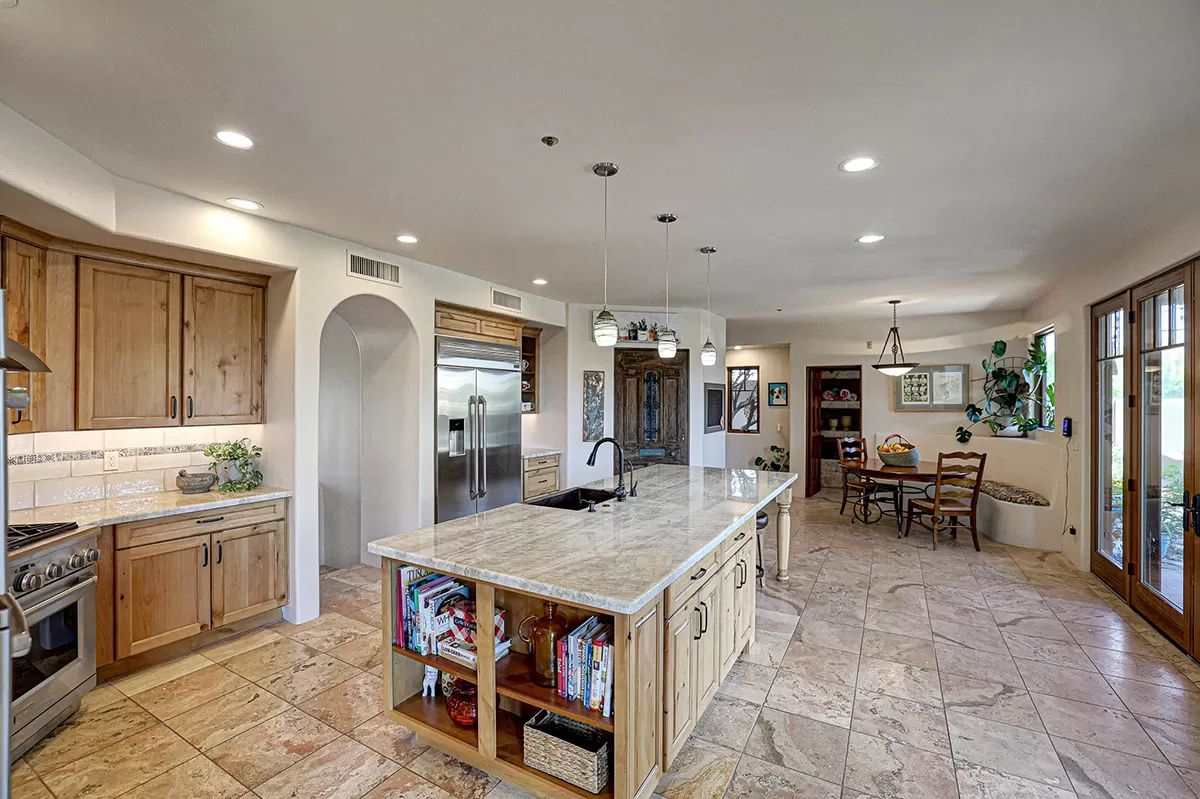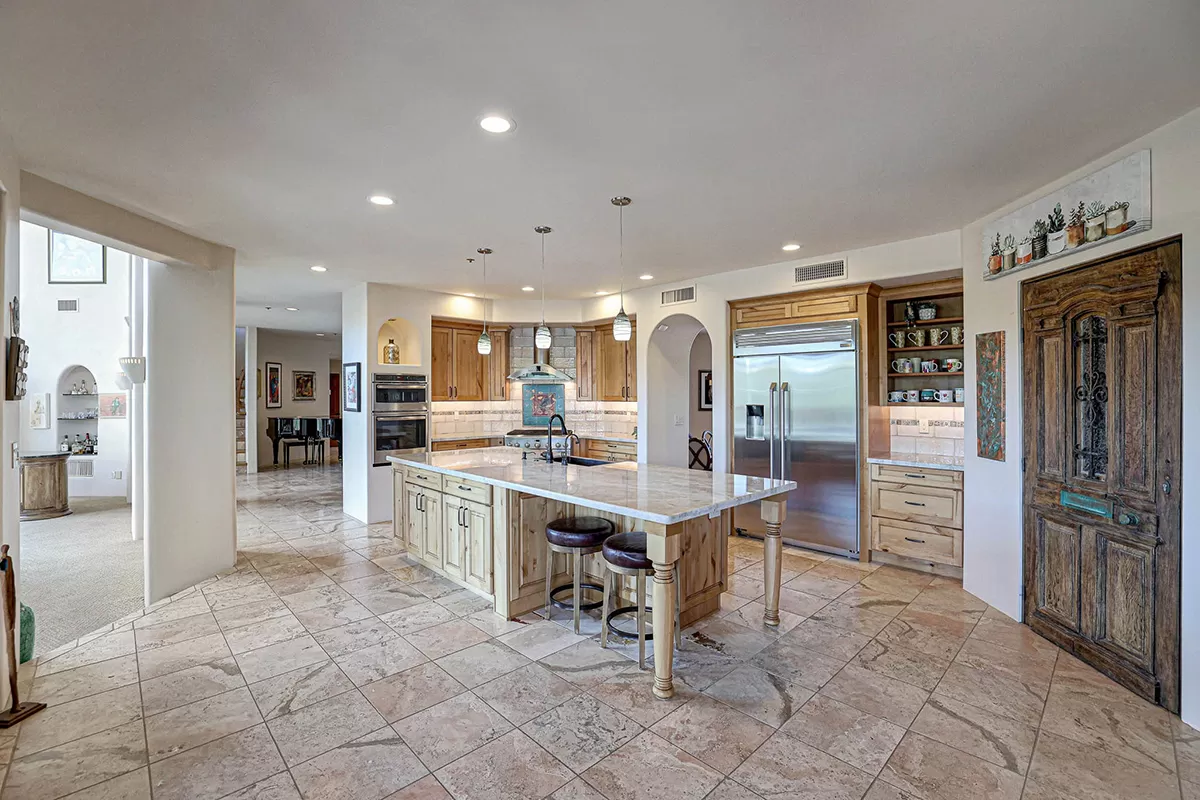 The heart of the home is the chef’s dream kitchen, boasting custom cabinets, quartzite countertops, stainless steel appliances, and a large center island with seating. Enjoy meals in the charming eat-in breakfast nook or entertain guests in the private formal dining room with direct access to the kitchen. Relax and unwind in the expansive living room with soaring beamed ceilings, a kiva fireplace, and floor-to-ceiling picture windows framing panoramic views of the McDowell Mountains.