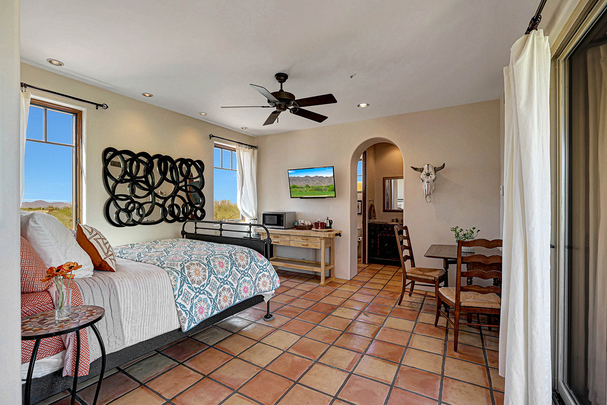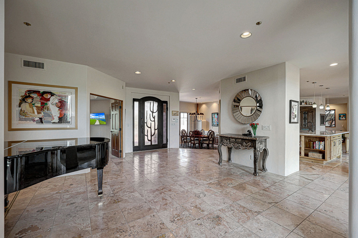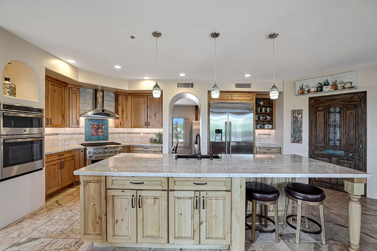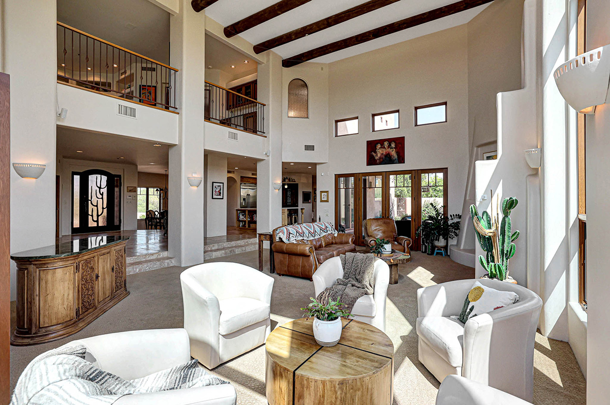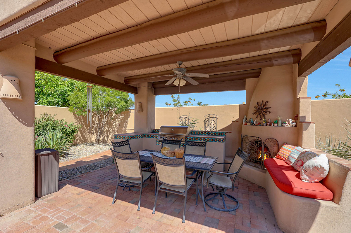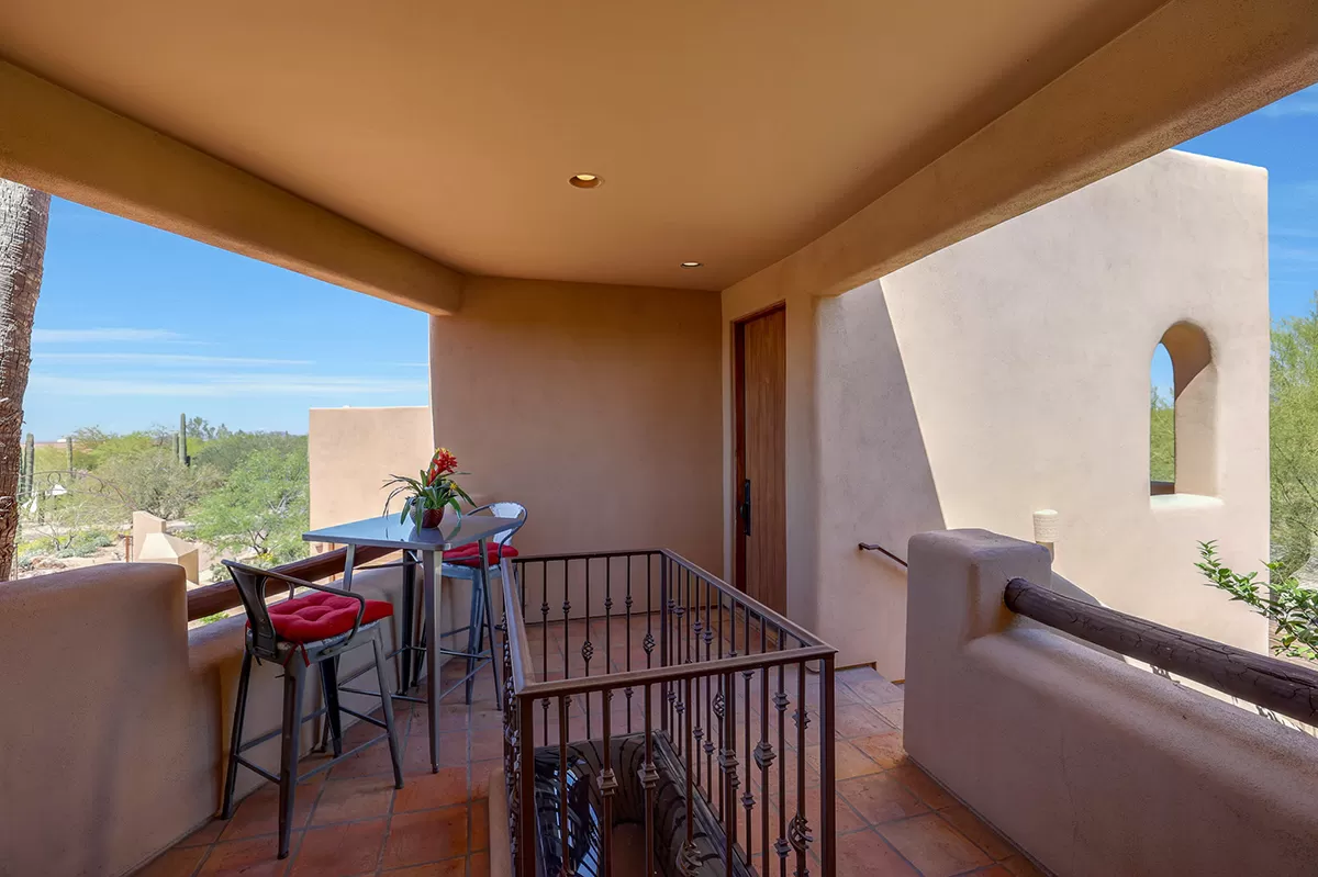 The heart of the home is the chef’s dream kitchen, boasting custom cabinets, quartzite countertops, stainless steel appliances, and a large center island with seating. Enjoy meals in the charming eat-in breakfast nook or entertain guests in the private formal dining room with direct access to the kitchen. Relax and unwind in the expansive living room with soaring beamed ceilings, a kiva fireplace, and floor-to-ceiling picture windows framing panoramic views of the McDowell Mountains.