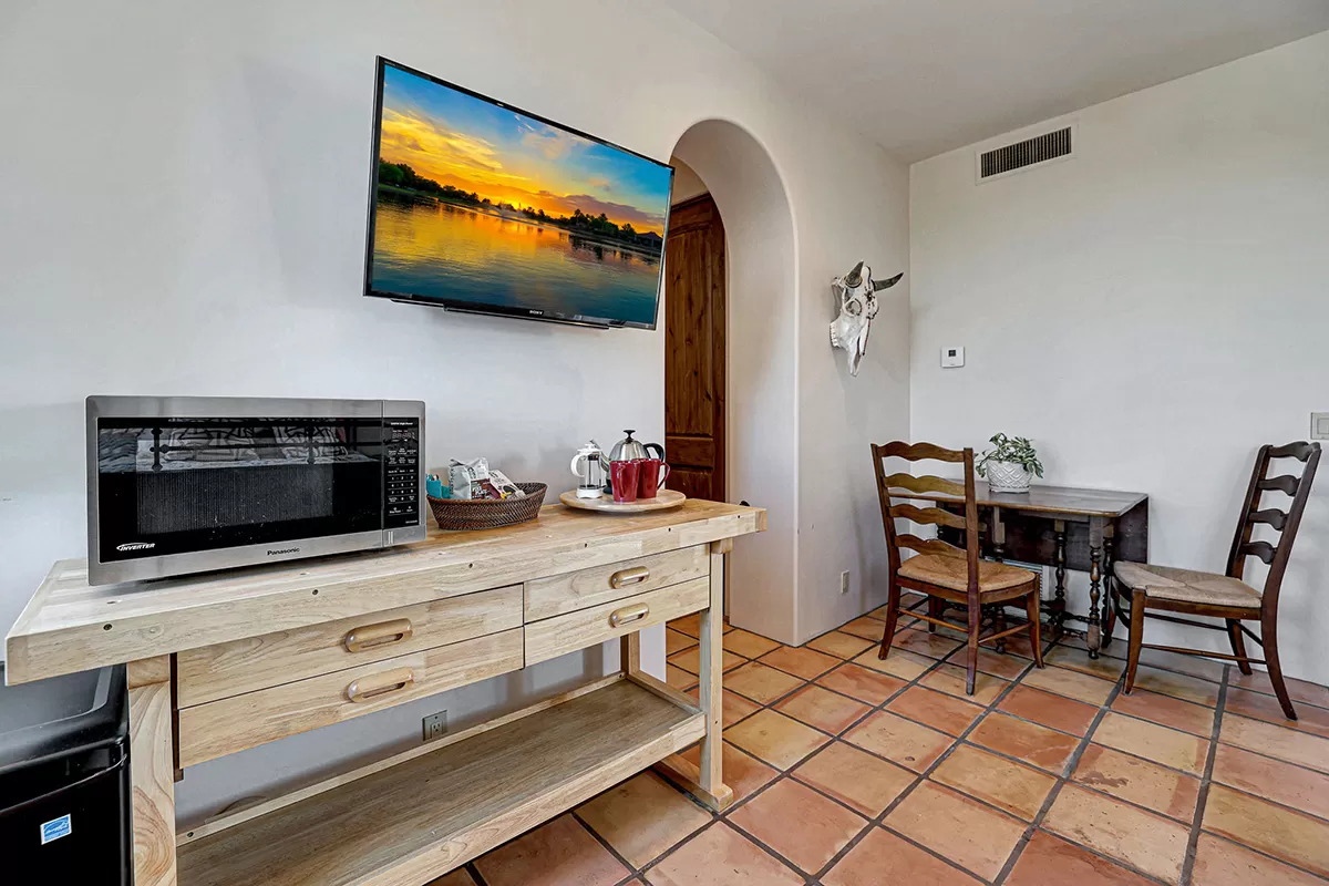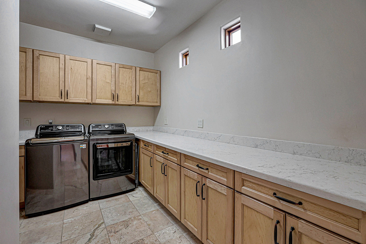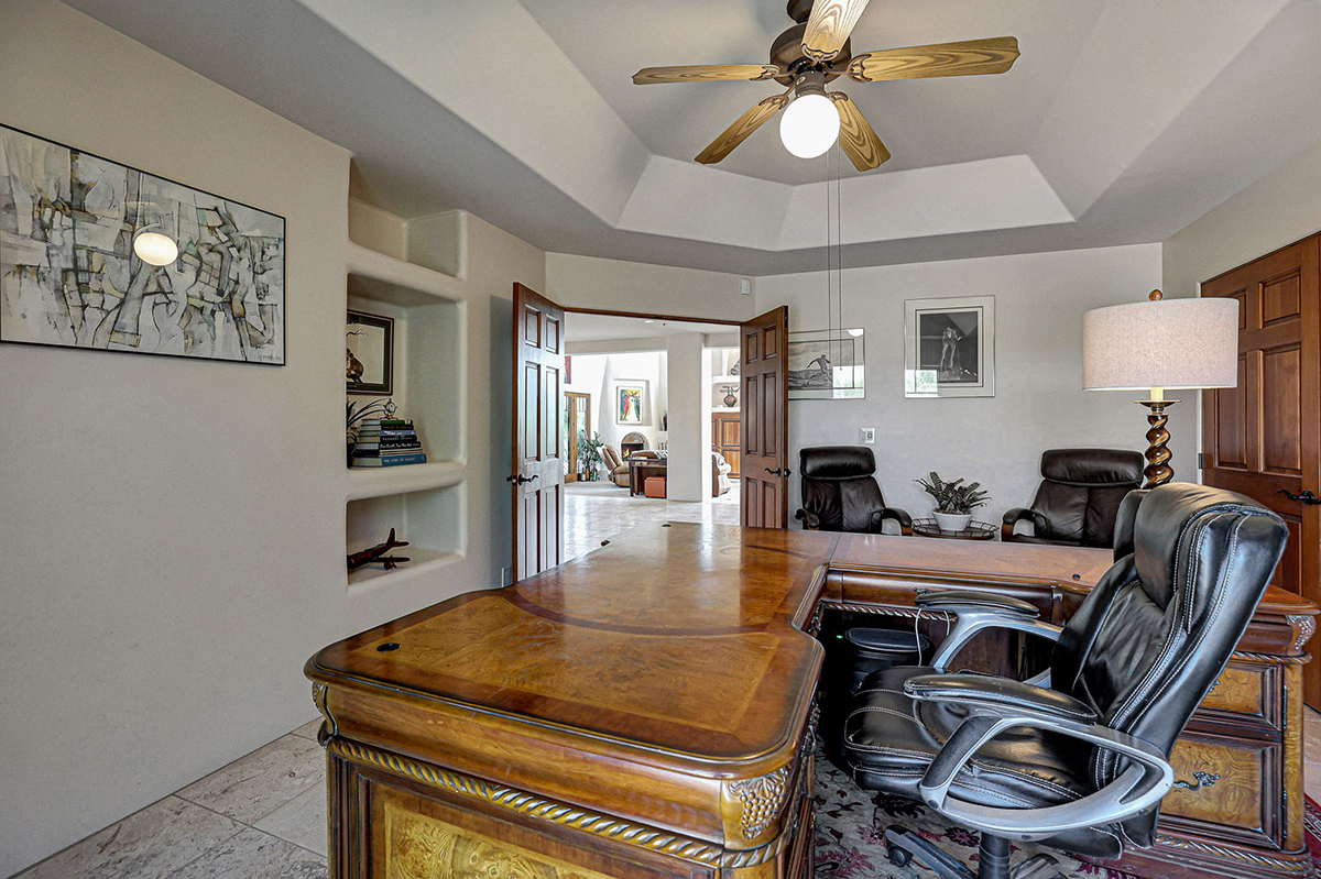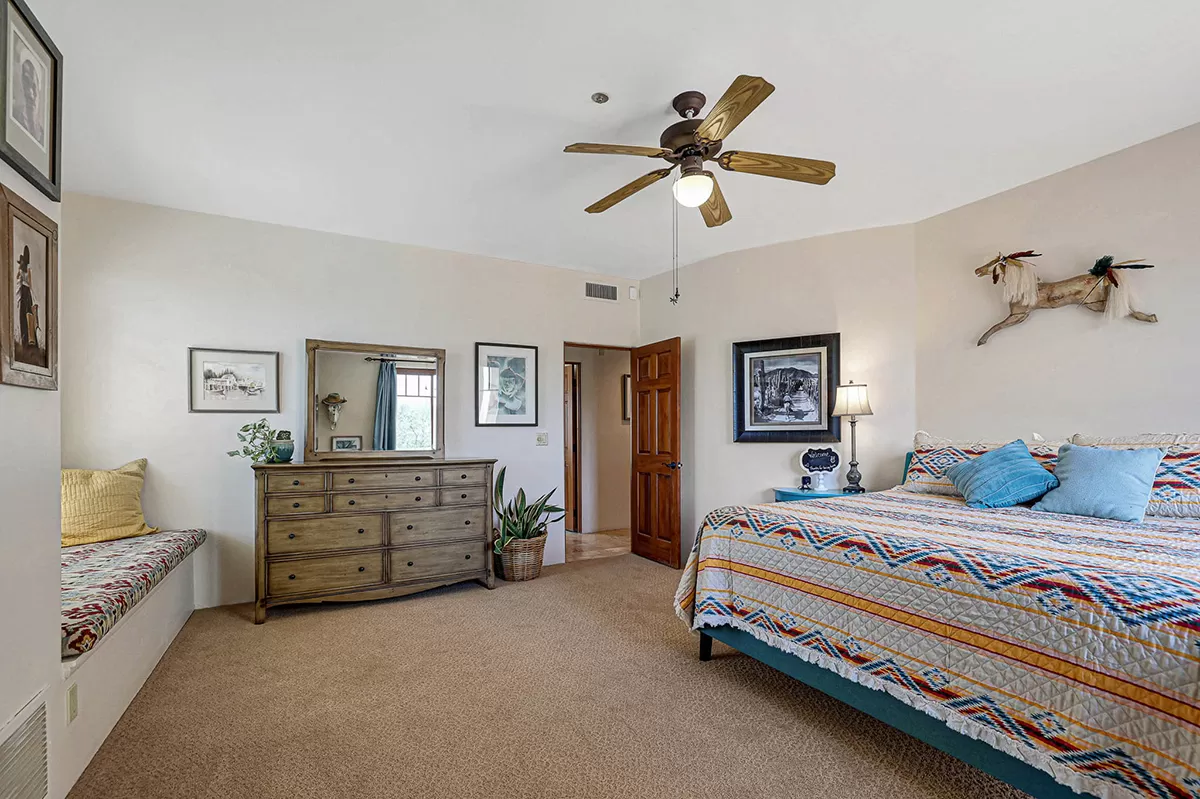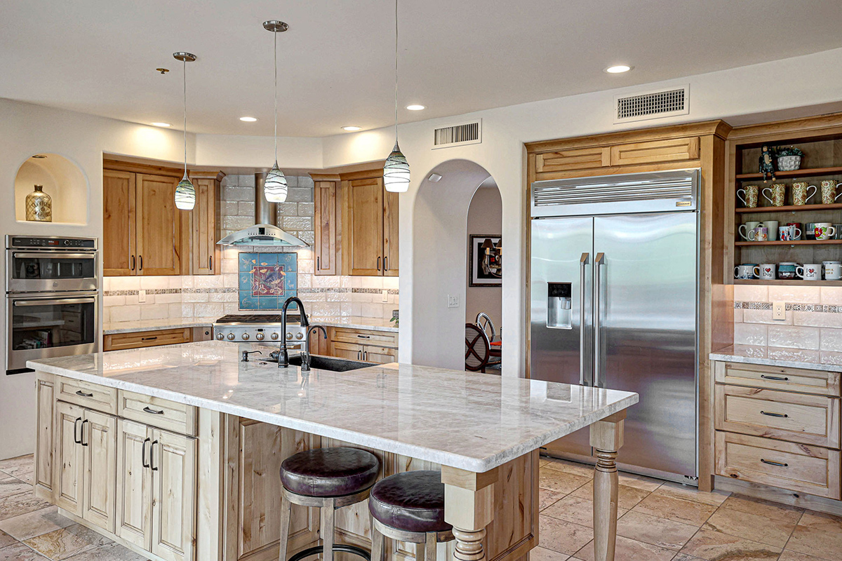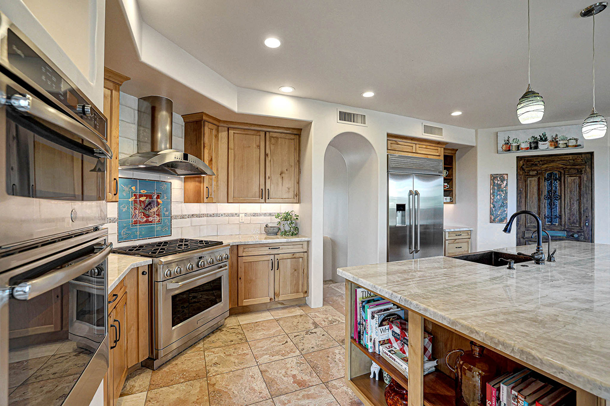 The heart of the home is the chef’s dream kitchen, boasting custom cabinets, quartzite countertops, stainless steel appliances, and a large center island with seating. Enjoy meals in the charming eat-in breakfast nook or entertain guests in the private formal dining room with direct access to the kitchen. Relax and unwind in the expansive living room with soaring beamed ceilings, a kiva fireplace, and floor-to-ceiling picture windows framing panoramic views of the McDowell Mountains.