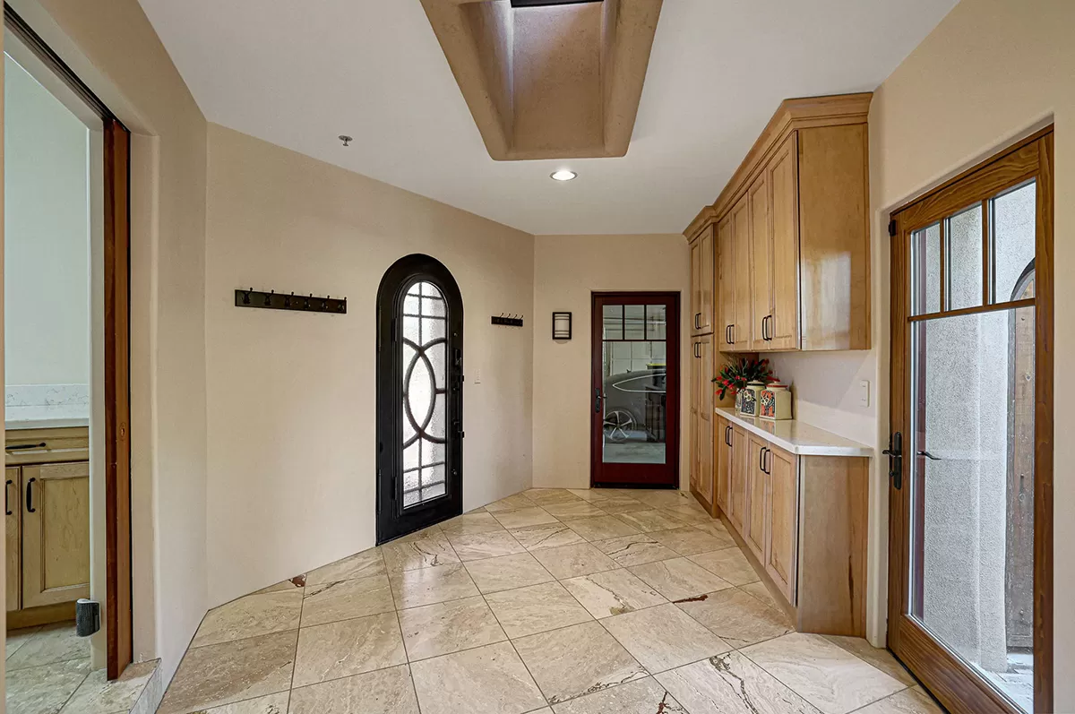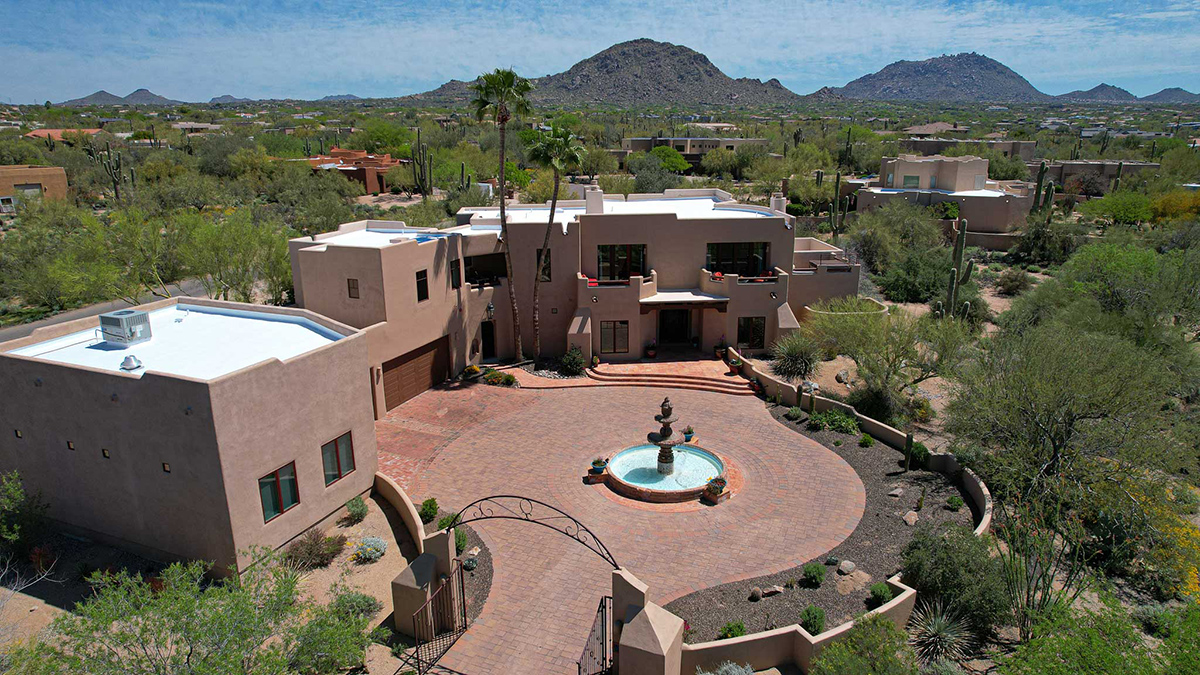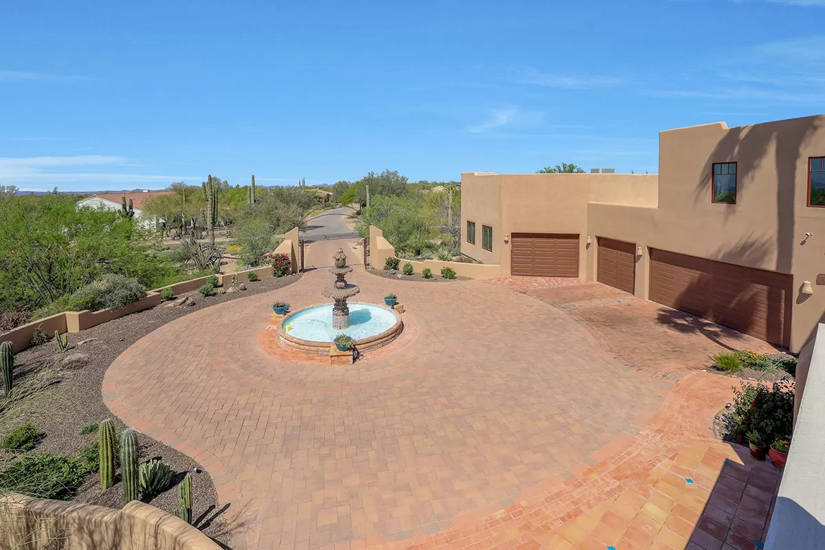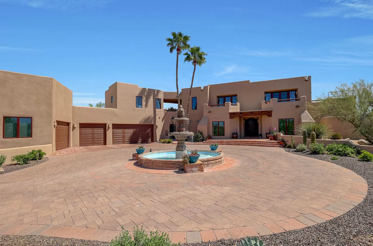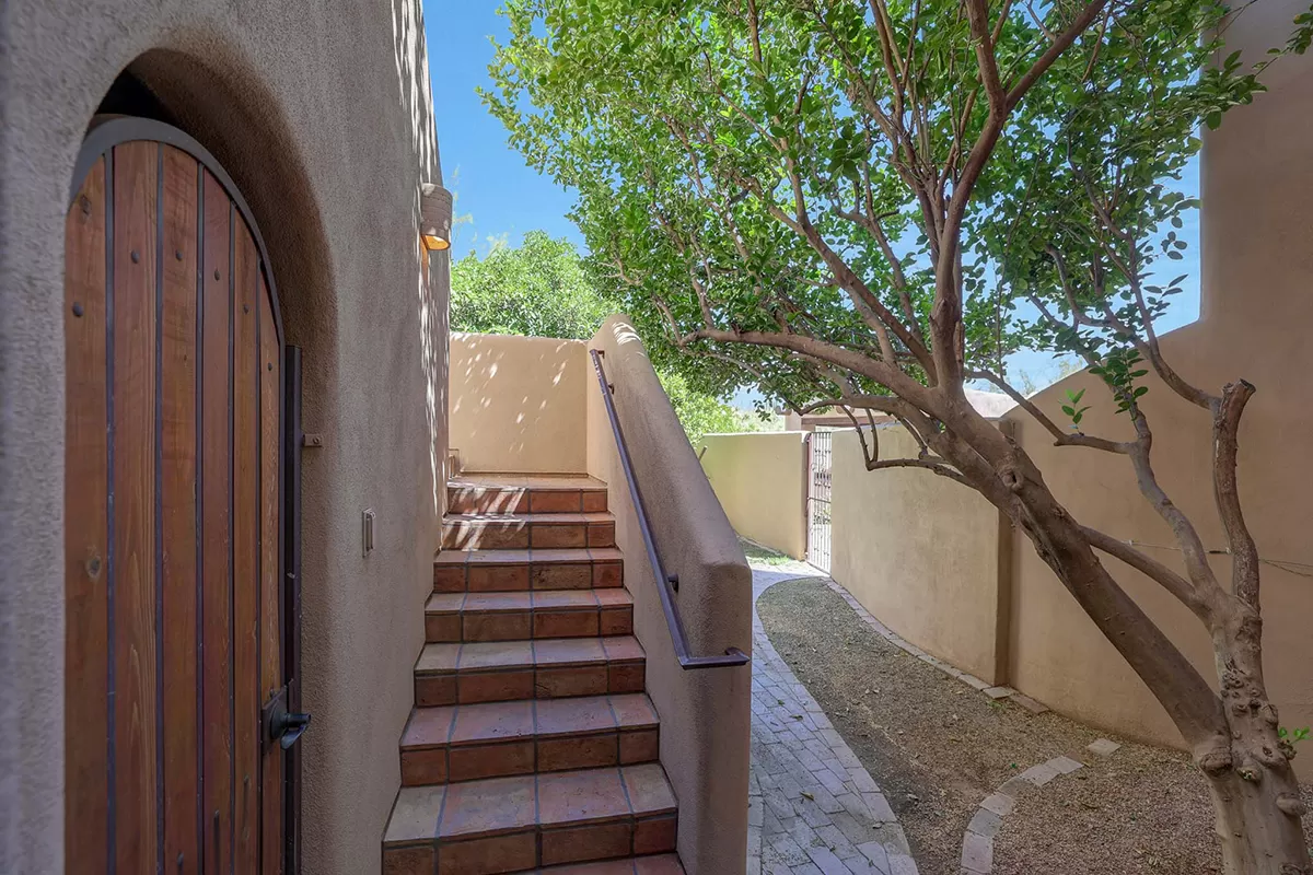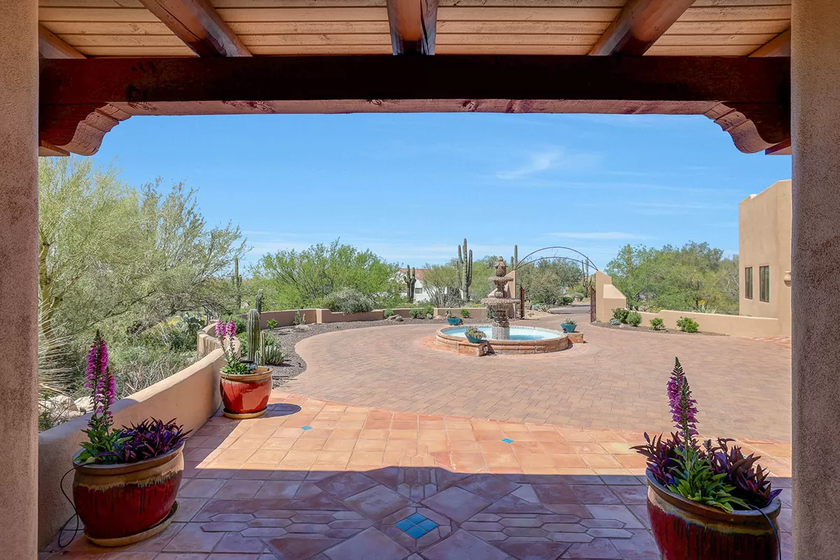 As you enter through the gated motor court adorned with a centerpiece fountain, you’ll be captivated by the charm of the Territorial architecture, featuring smooth stucco, wood beam accents, and wood casement style windows and doors.