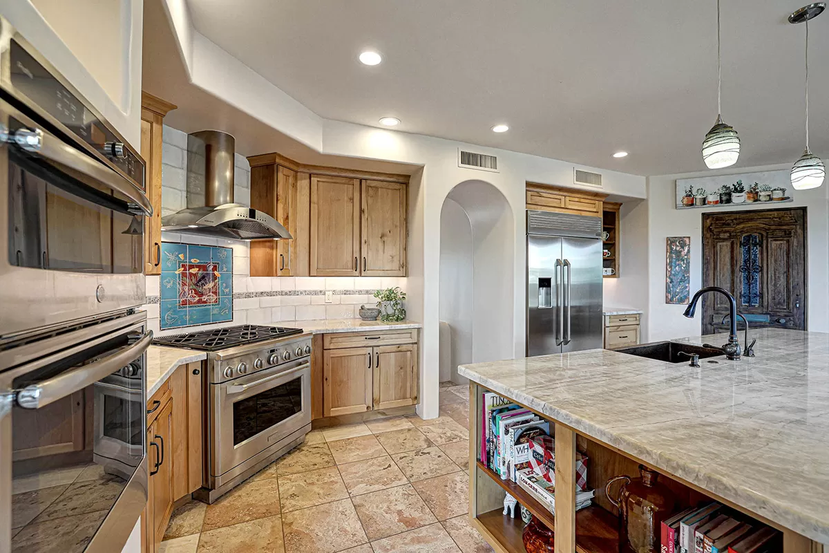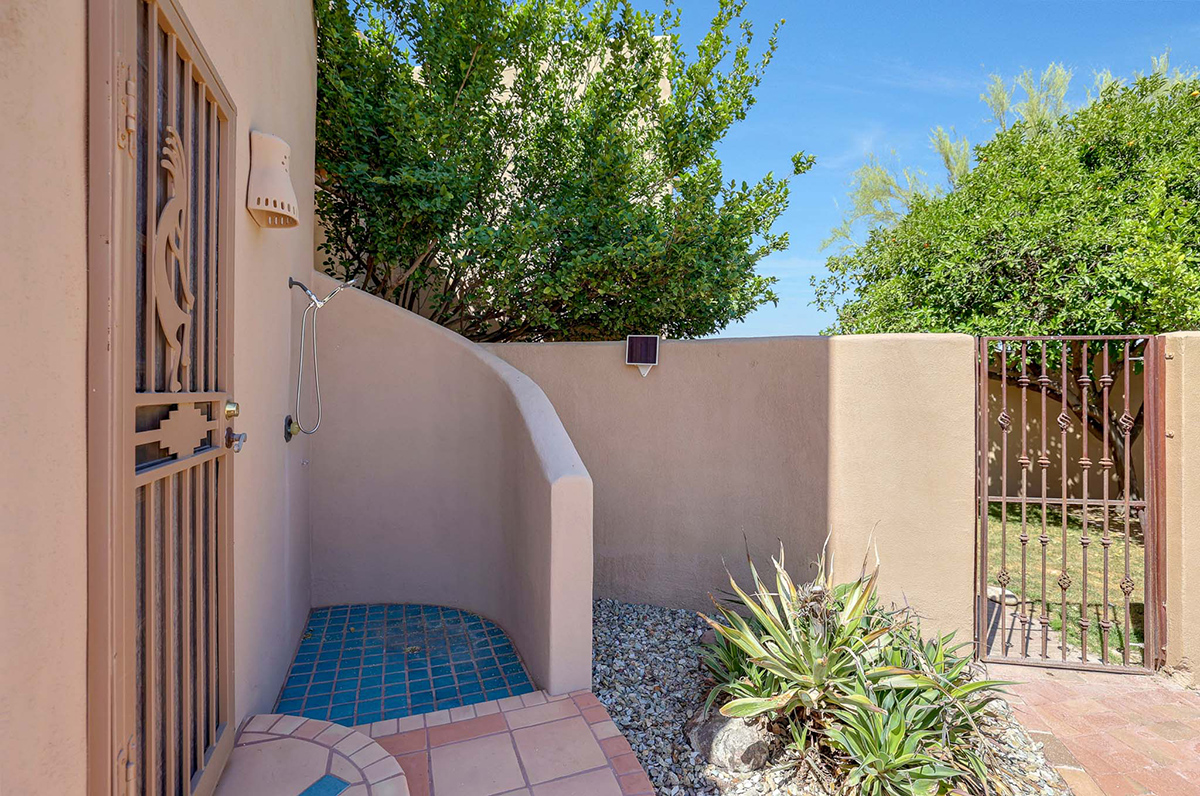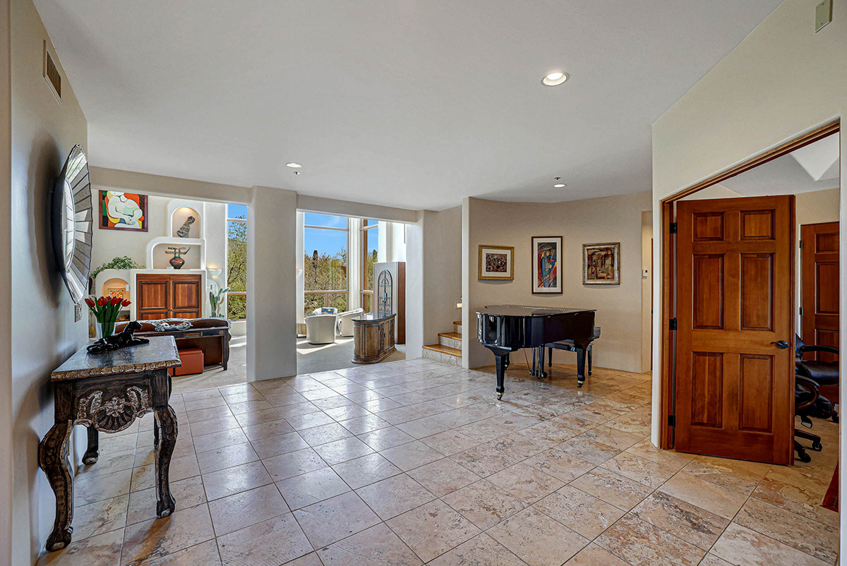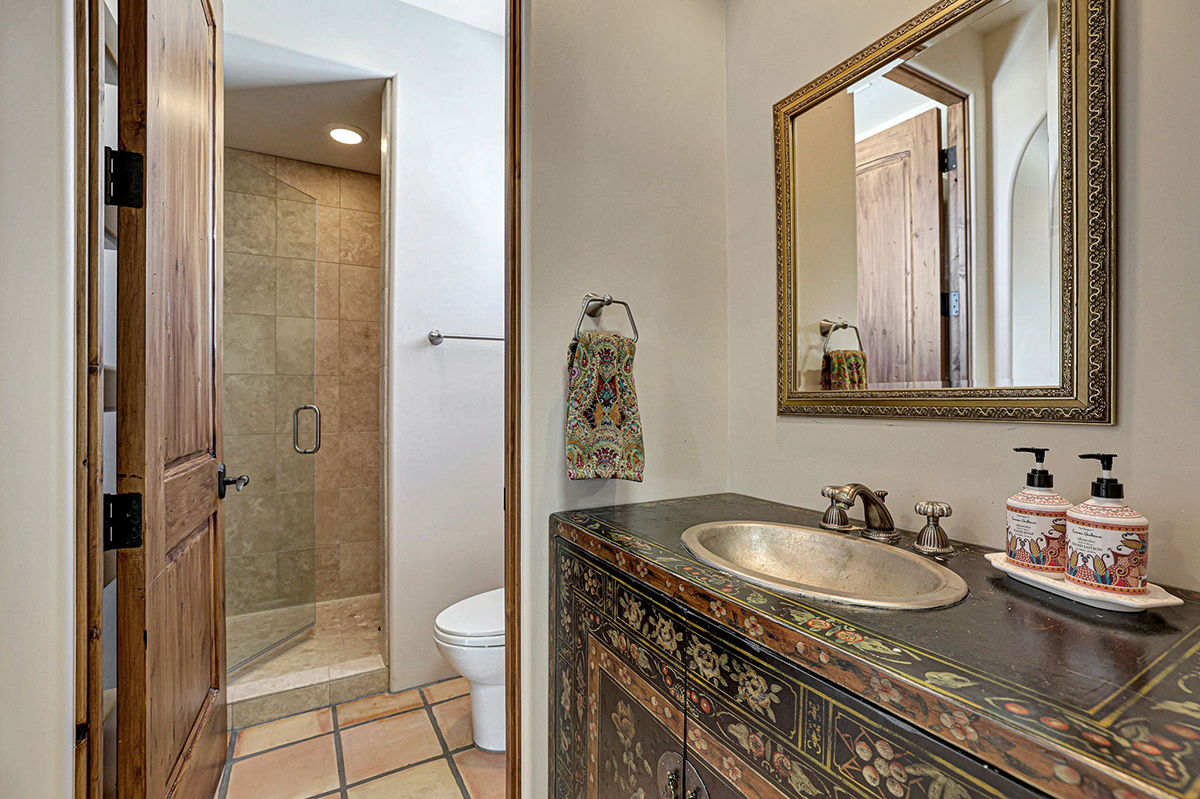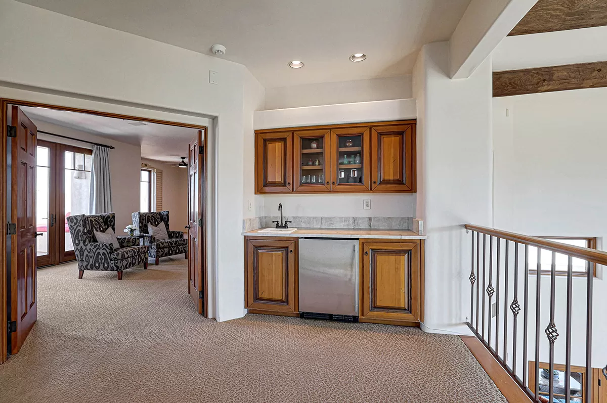 As you enter through the gated motor court adorned with a centerpiece fountain, you’ll be captivated by the charm of the Territorial architecture, featuring smooth stucco, wood beam accents, and wood casement style windows and doors.