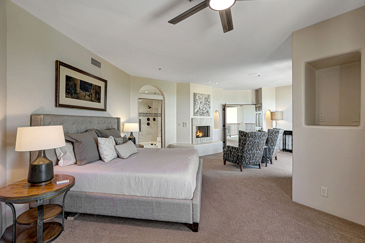 Retreat to the luxurious primary suite, complete with a sitting area, two-way fireplace, private balcony, and spa-like ensuite with a soaking tub, walk-in shower, and custom-designed closet. The upstairs primary suite opens to a private loft perfect for additional living or working space, with wet bar and beverage fridge, and two private balconies (one with a spa and fireplace) hosting city light and mountain views.