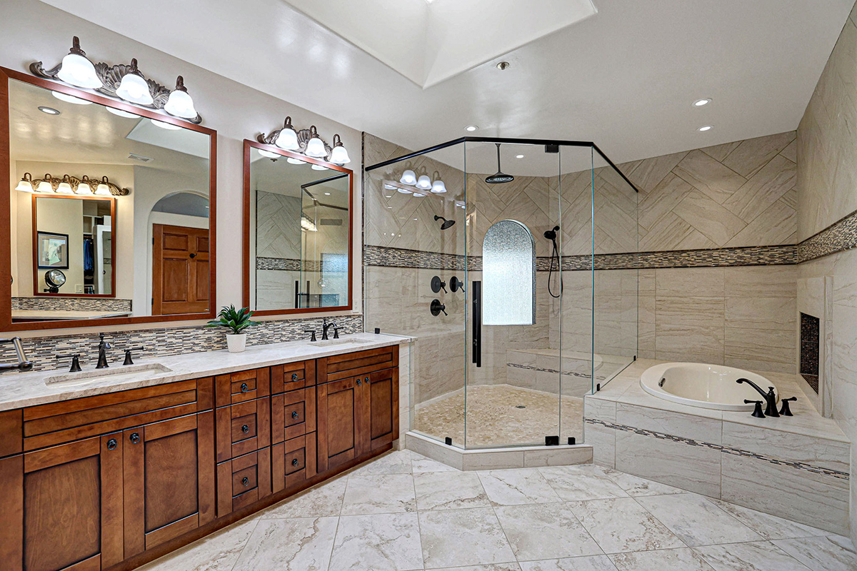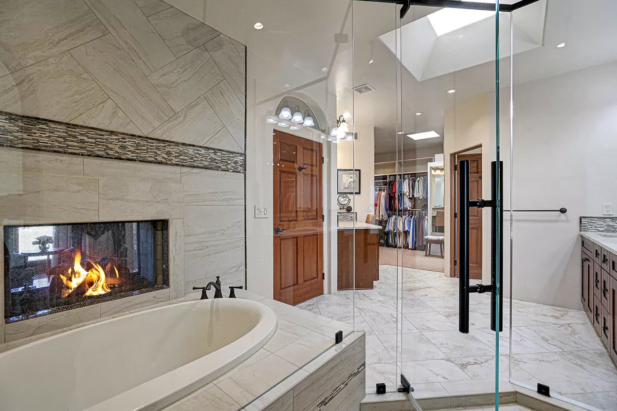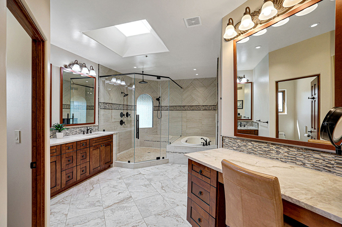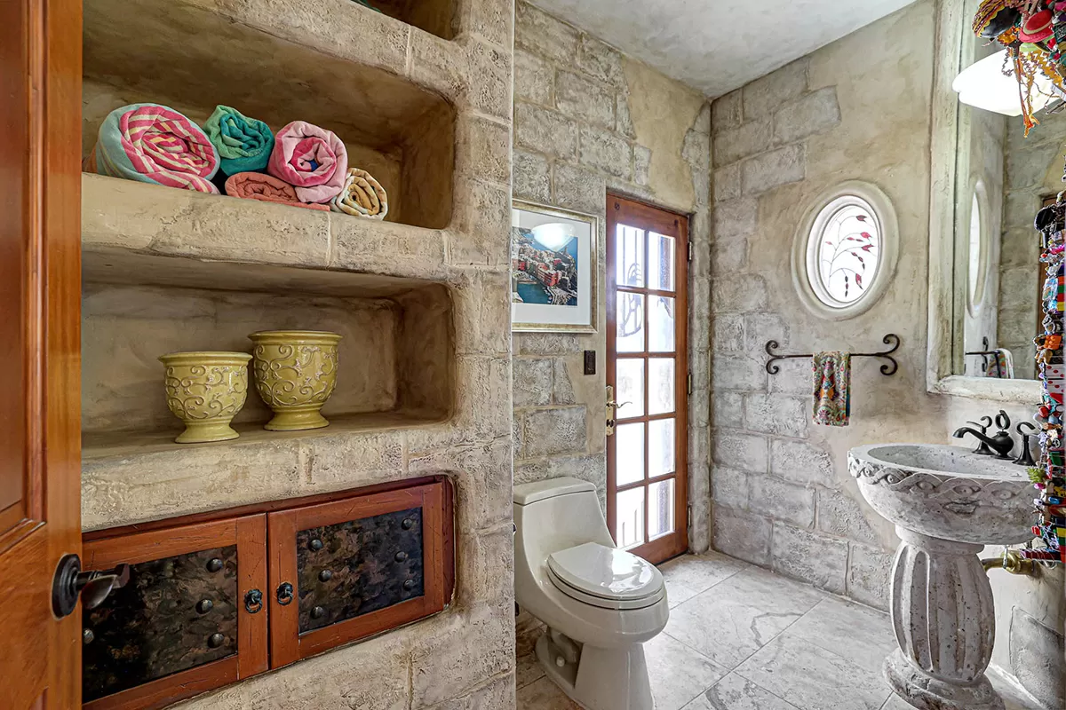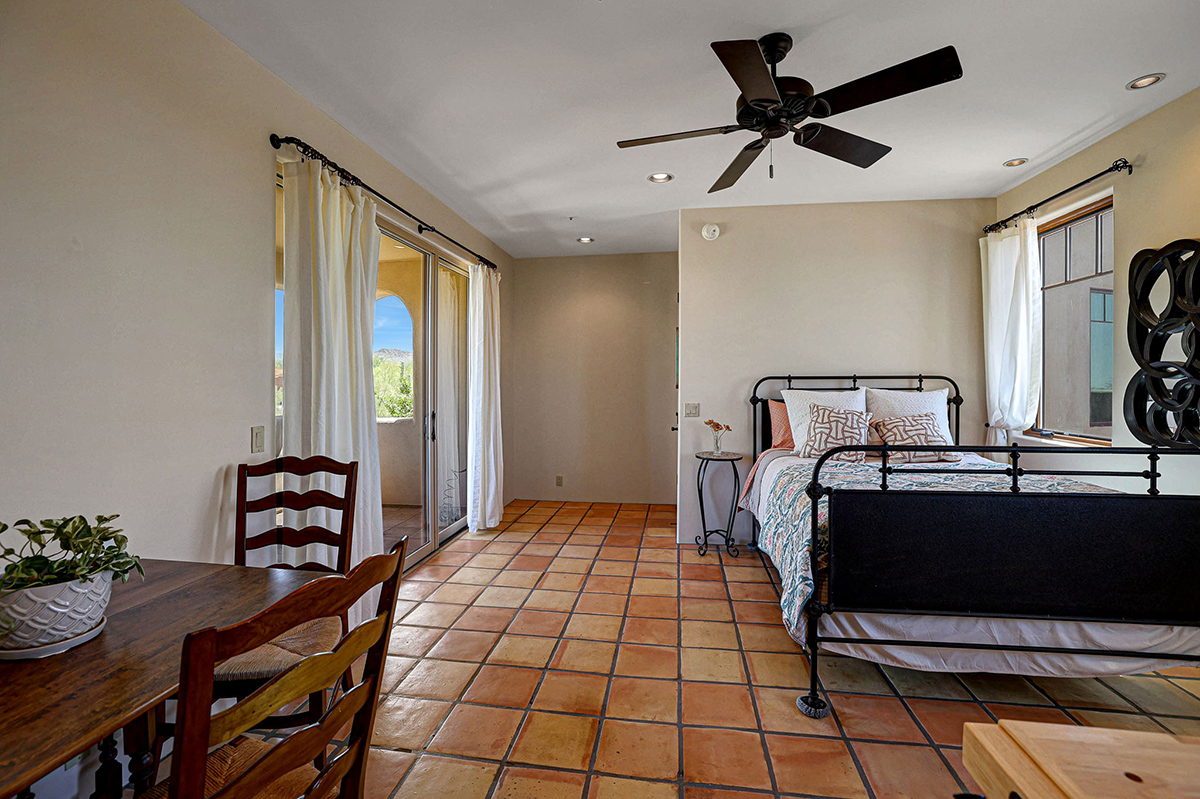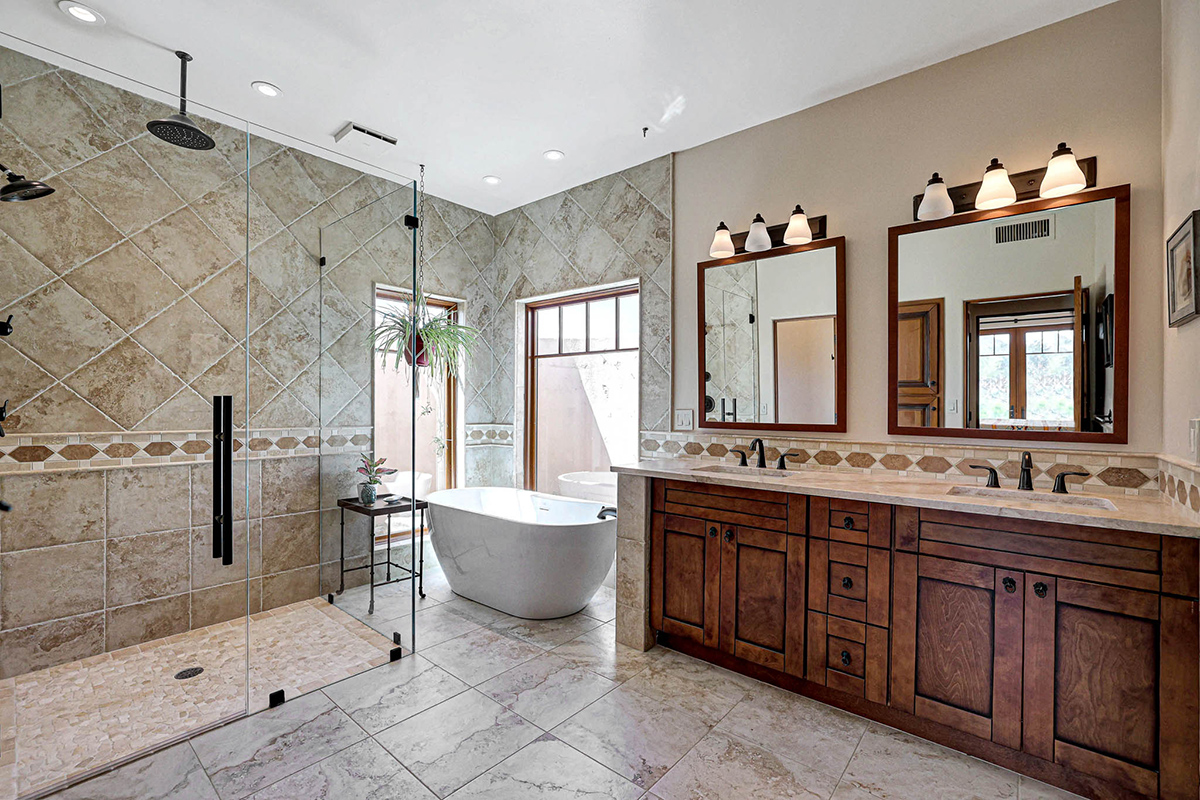 Two main house guest suites (one currently set up as an office) that share a hall bath as large as a primary with view windows overlooking exterior fountain, freestanding tub, frameless glass shower and dual vanities; attached private entry upstairs guest house with walk-in closet and two private balconies.