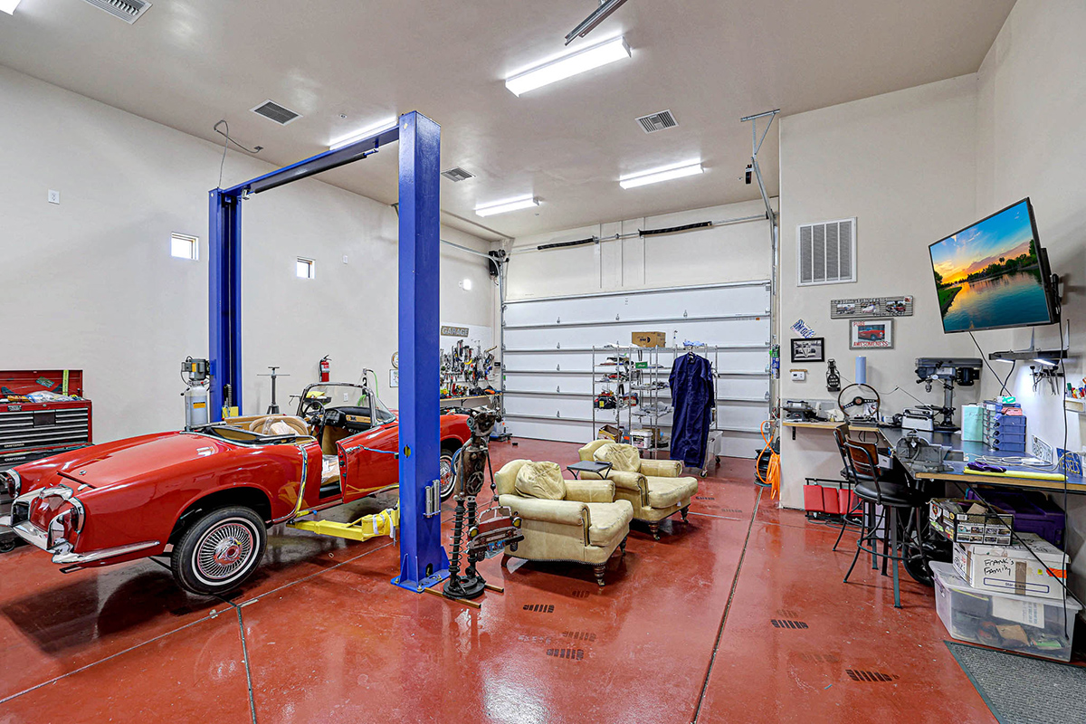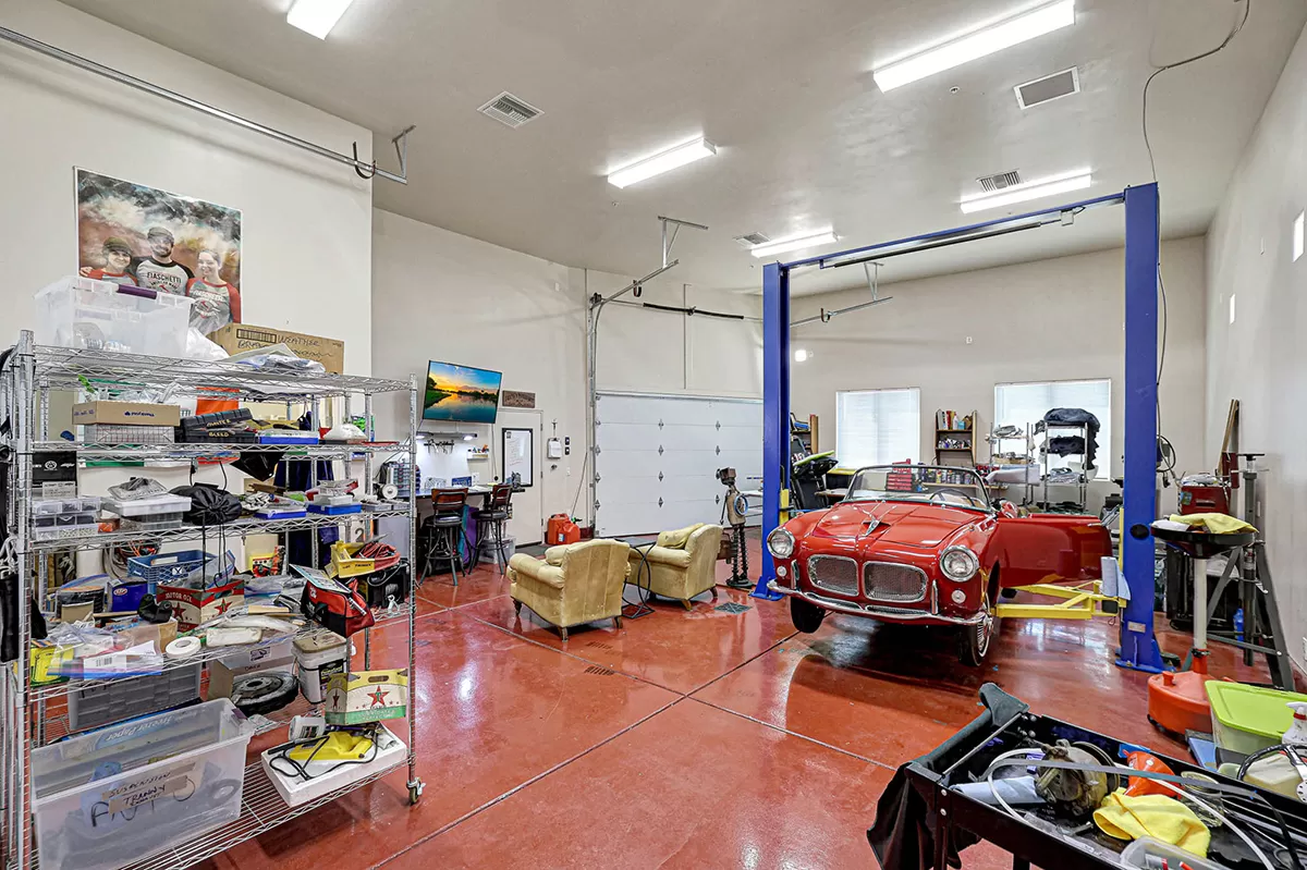Car enthusiasts will rejoice at the state-of-the-art garage with room for up to 8 cars, complete with multiple bays, soaring ceilings, epoxy floors, and a car lift. The third garage bay, with dual entrances for convenient access, offers ample space for a workshop and storage areas.