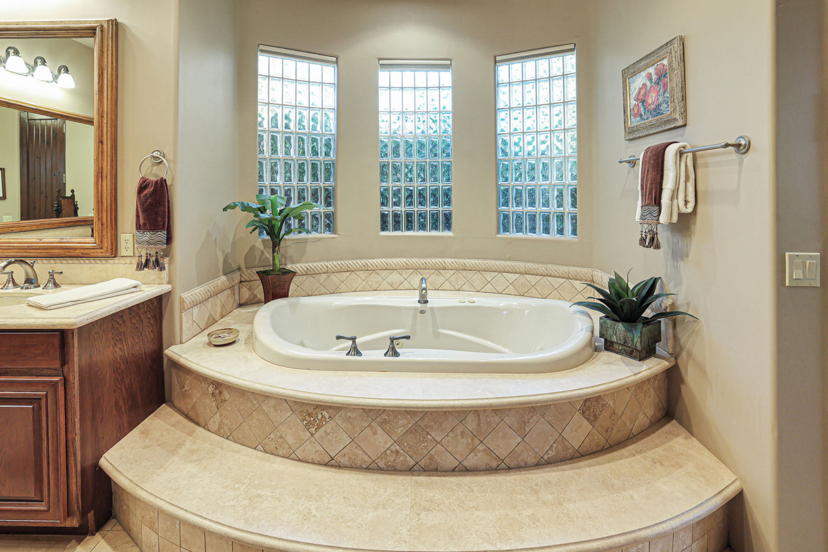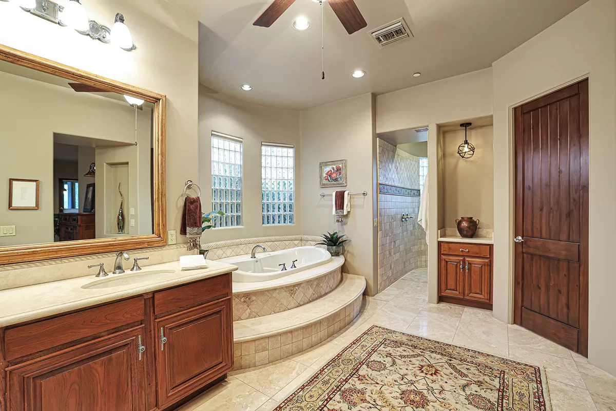 custom closet cabinetry, exterior access, jetted soaking tub, and two zero-entry