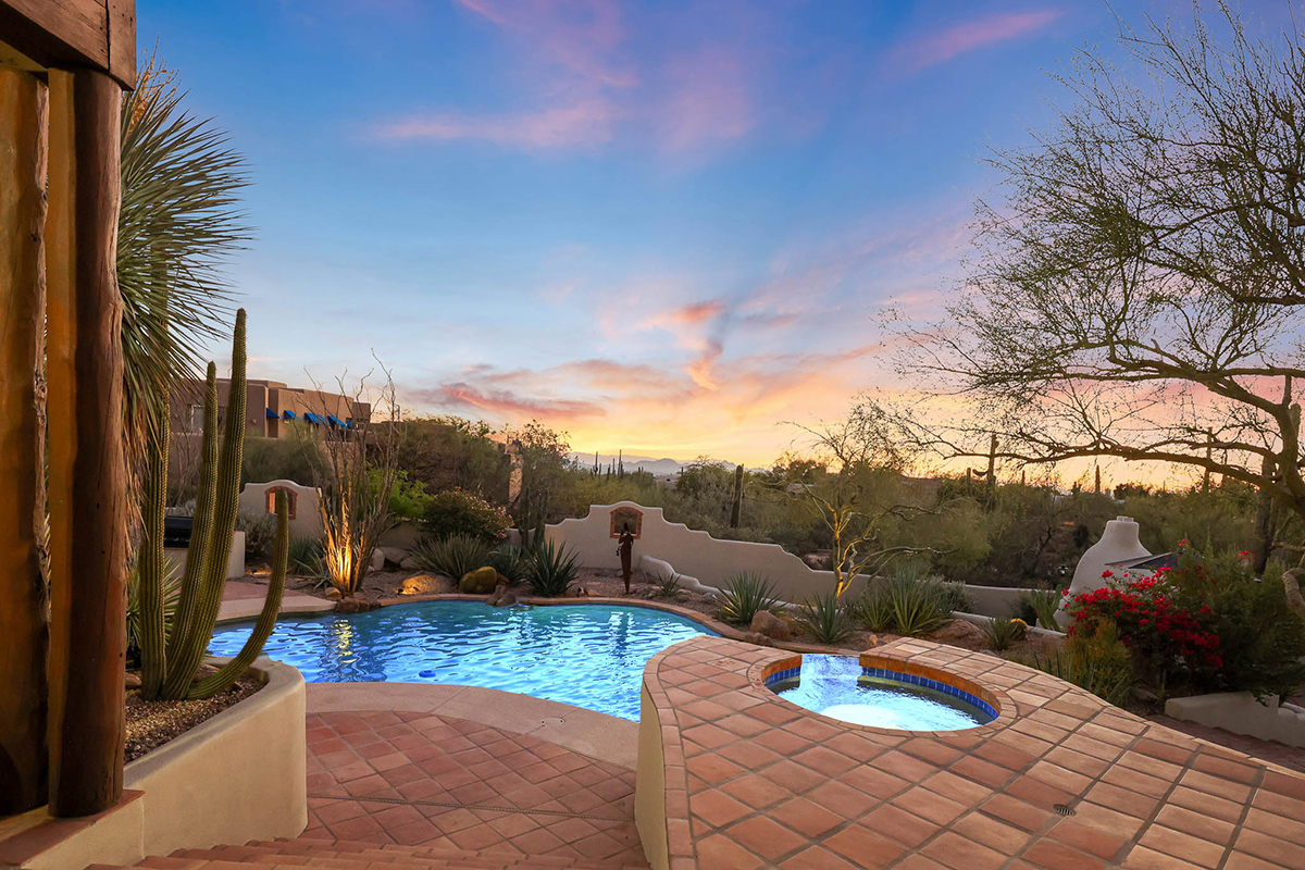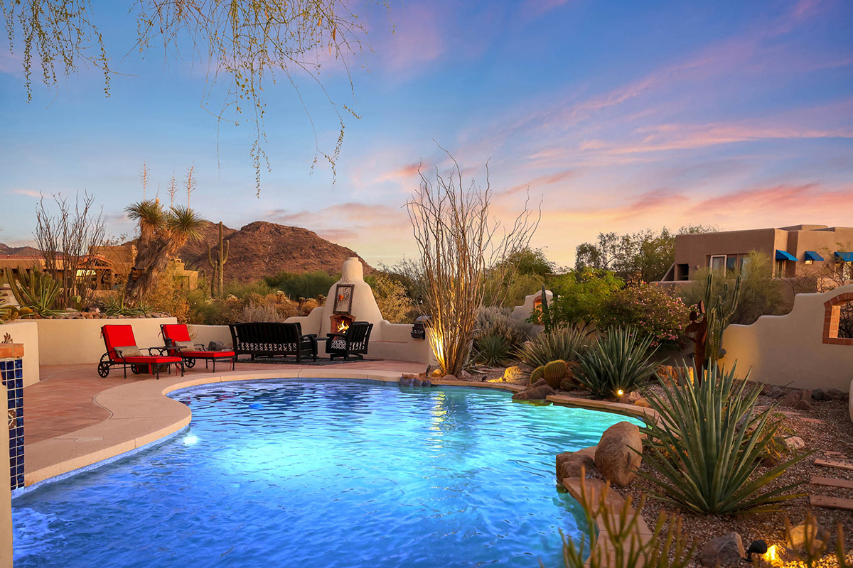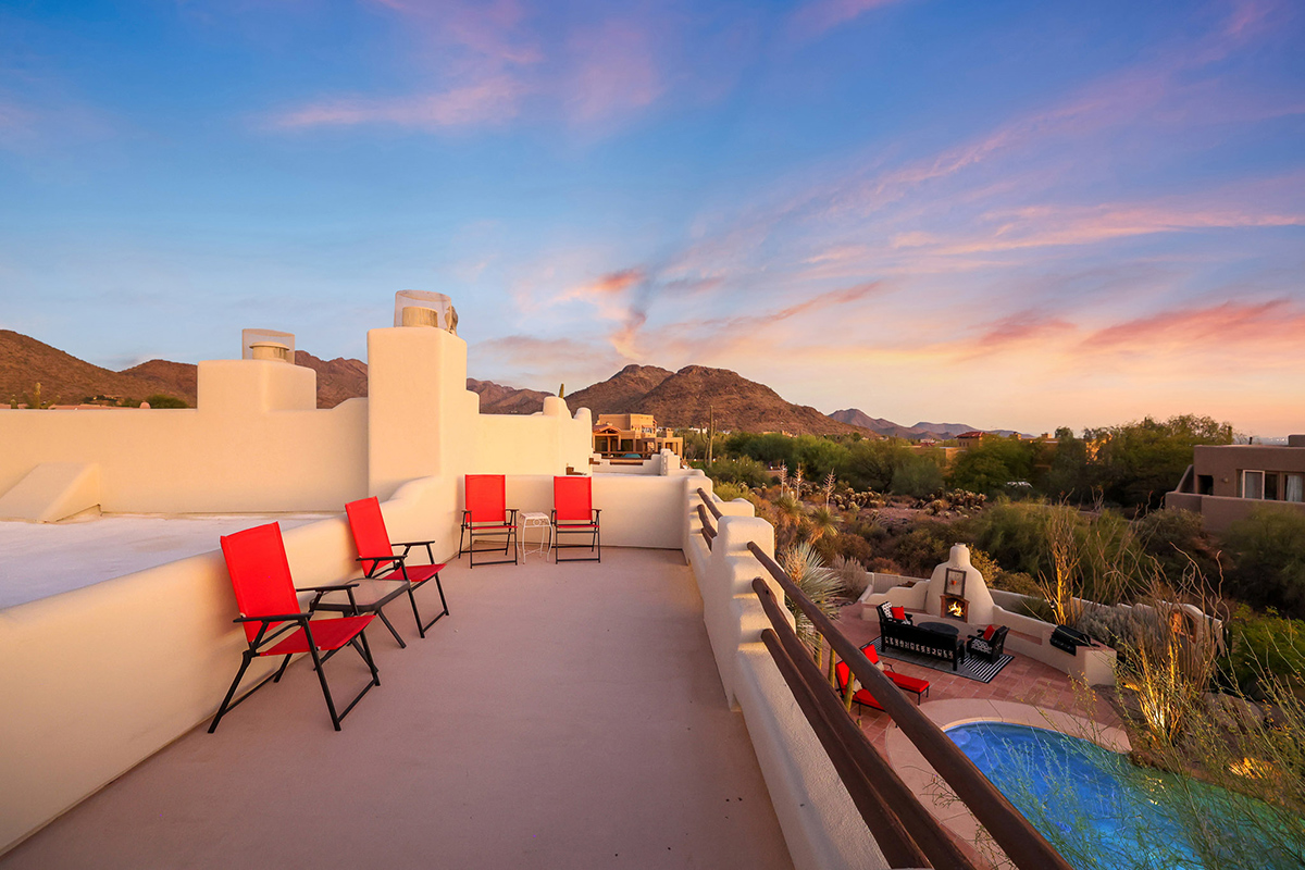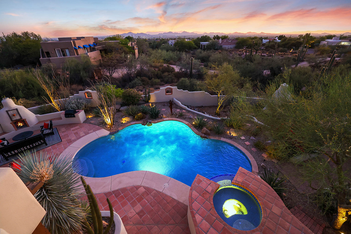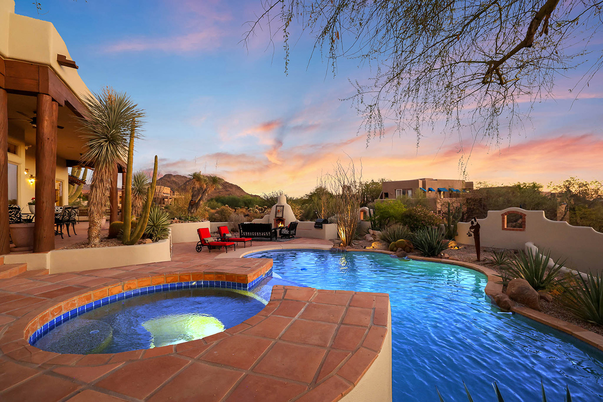 Discover the perfect blend of city light views, privacy, McDowell Mountain views, and the advantage of Non-HOA living. This home combines traditional southwest charm with a modern touch in the fresh interior and exterior paint. The backyard is a haven of relaxation, featuring a sparkling pool, a spa with a waterfall edge, a large covered patio, two cozy kiva fireplaces, raised planters, and a South-facing orientation to enjoy the breathtaking sunsets. For the ultimate panoramic experience, ascend to the rooftop view deck offering direct city light views. Saltillo tile flows from the main living areas to the exterior, creating a seamless atmosphere.