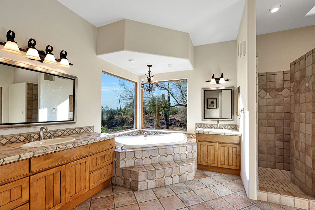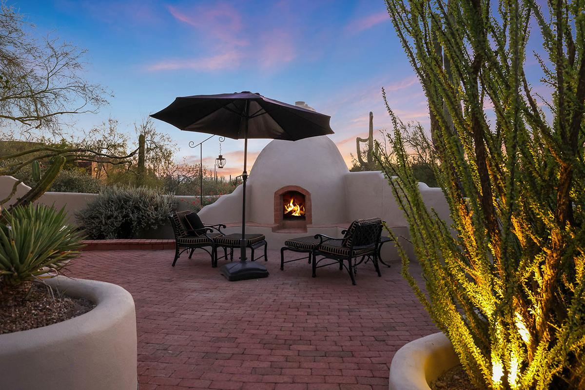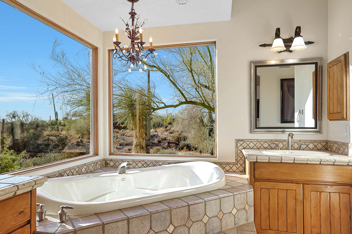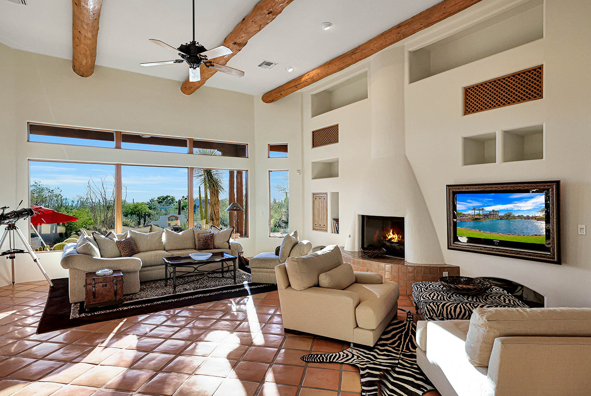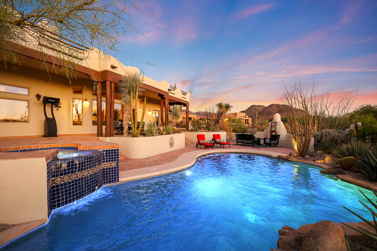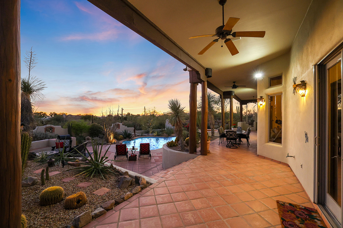 Discover the perfect blend of city light views, privacy, McDowell Mountain views, and the advantage of Non-HOA living. This home combines traditional southwest charm with a modern touch in the fresh interior and exterior paint. The backyard is a haven of relaxation, featuring a sparkling pool, a spa with a waterfall edge, a large covered patio, two cozy kiva fireplaces, raised planters, and a South-facing orientation to enjoy the breathtaking sunsets. For the ultimate panoramic experience, ascend to the rooftop view deck offering direct city light views. Saltillo tile flows from the main living areas to the exterior, creating a seamless atmosphere.