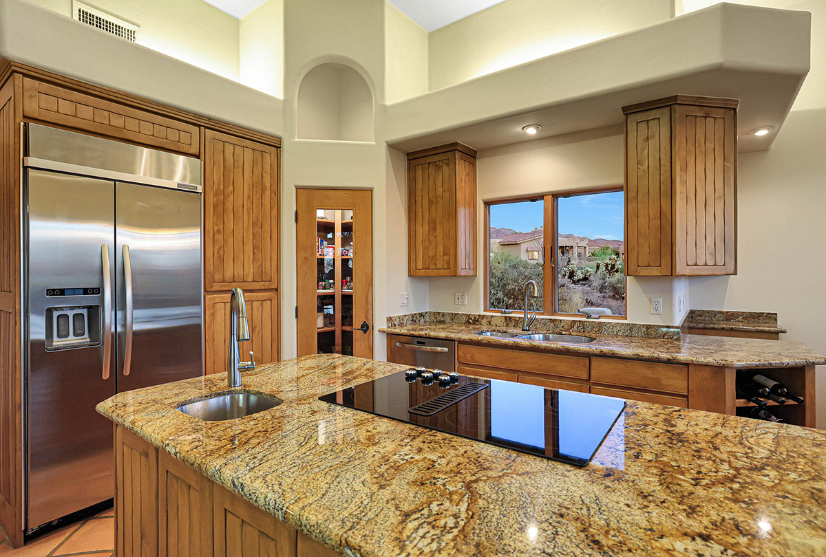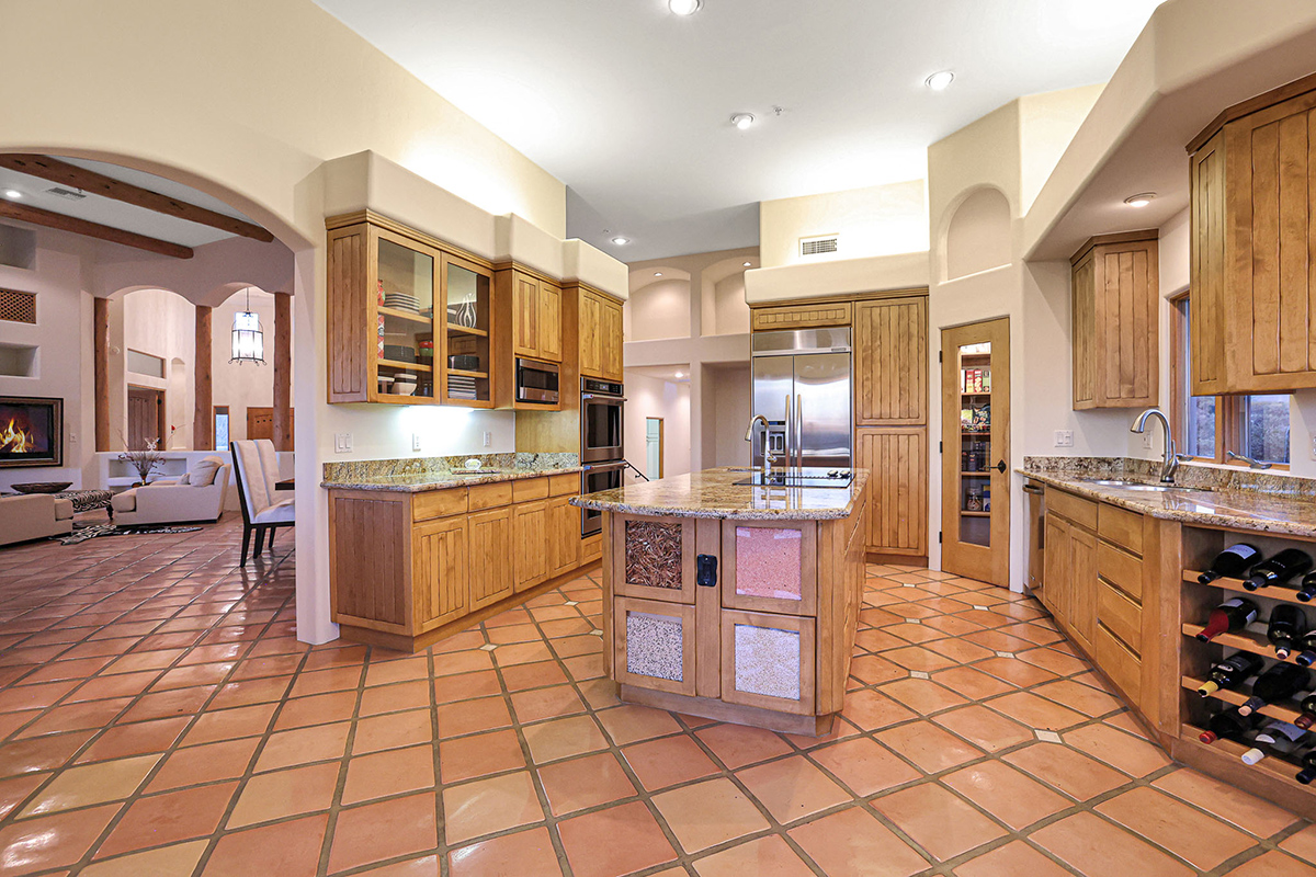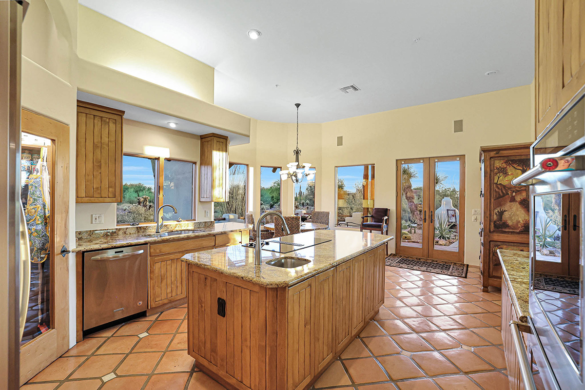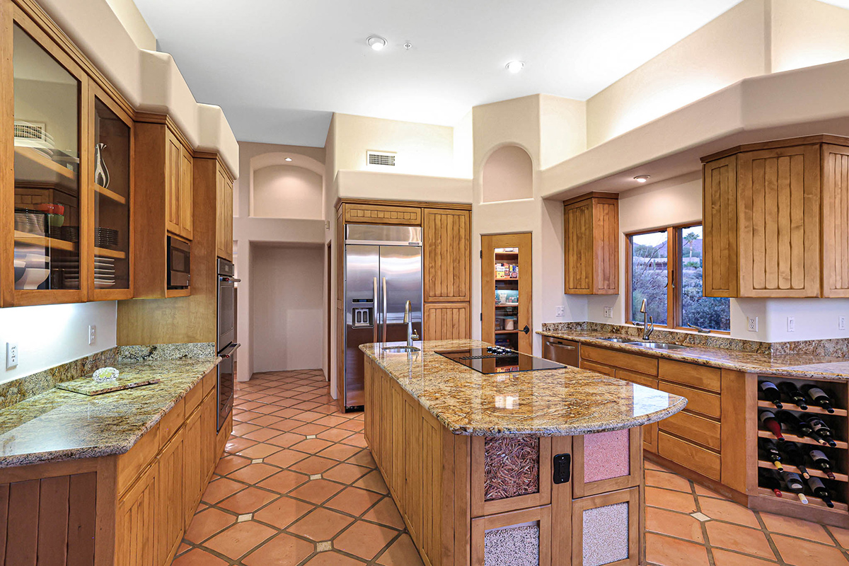 A winding paver driveway leads to guest parking and the three-car garage, complete with air conditioning, epoxy floors, an electric vehicle charger, built-in cabinets, and a workbench. The property spans 1.437 acres, with the house perfectly sized at 3,420 square feet. Indoors, the beautiful kitchen boasts granite counters, a walk-in pantry, wood-slated cabinets, a center island with a prep sink, and a breakfast nook surrounded by view windows. Stainless steel appliances, including a Kitchenaid fridge, double wall ovens, built-in microwave, and electric cooktop.