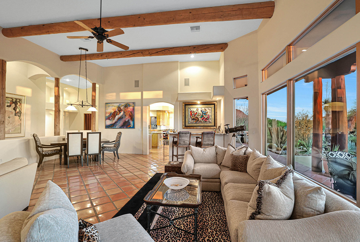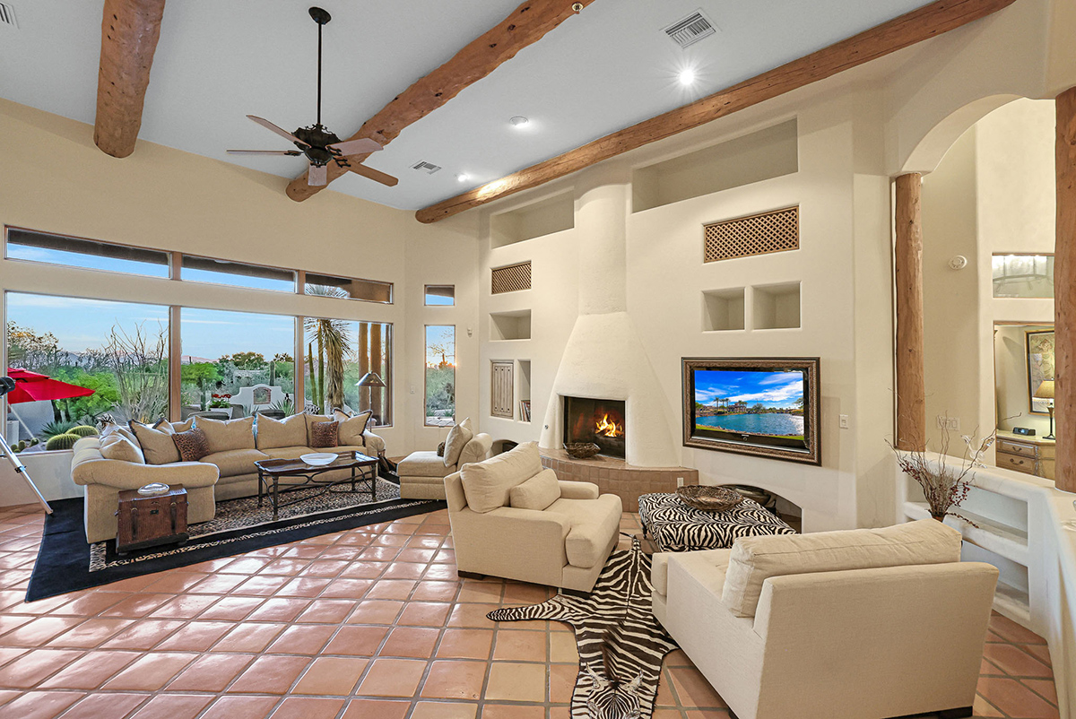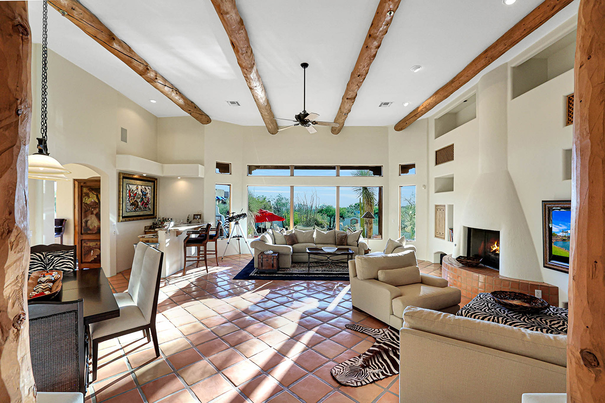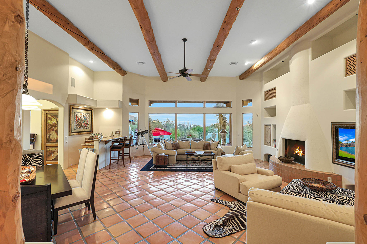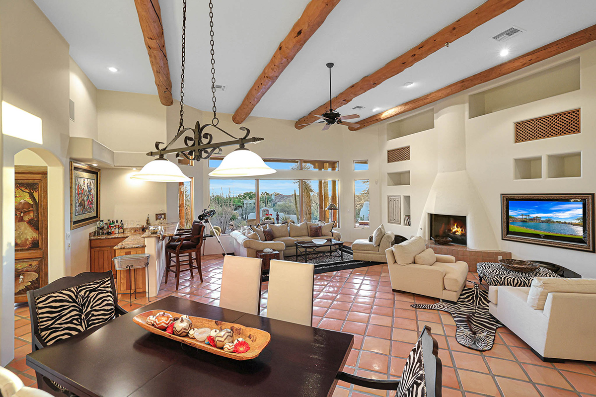 The open concept living and dining area serves as the heart of the home, featuring a centerpiece fireplace, large picture window, beamed ceilings, and a dry bar – perfect for entertaining! The primary suite, thoughtfully separated from the guest rooms, has wood flooring, a fireplace, exterior access, and an ensuite bath offering a separate shower and tub, dual vanities, and a walk-in closet. Two additional guest rooms, one ensuite, and one with access to the hall bath (also serving as a pool bath). A private office with wood flooring and double entry doors welcomes you home.