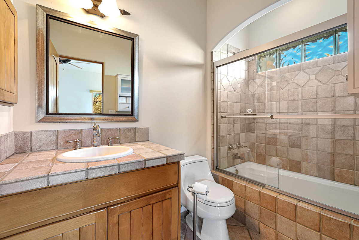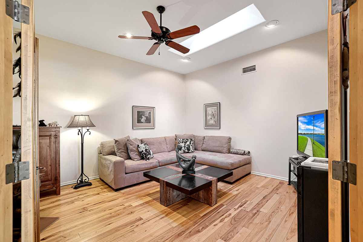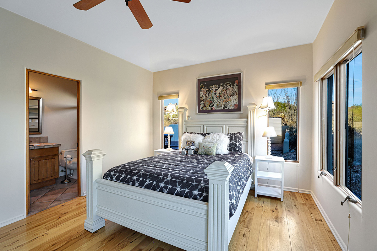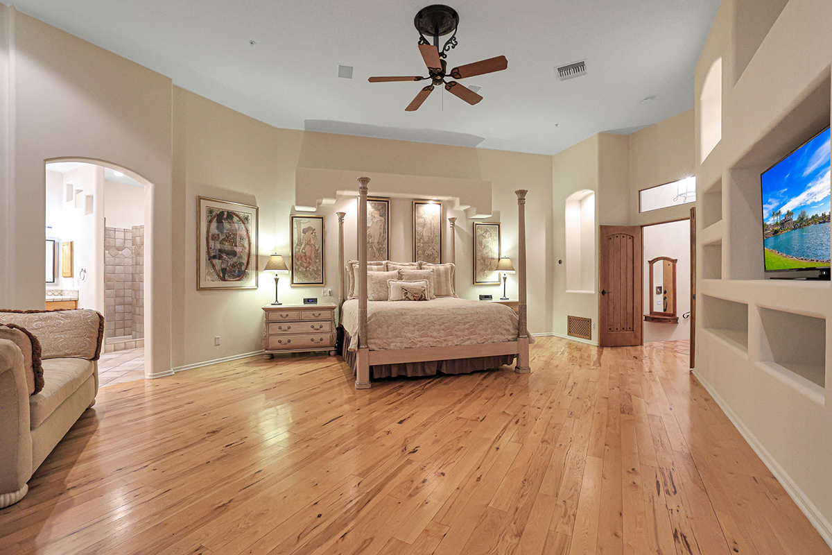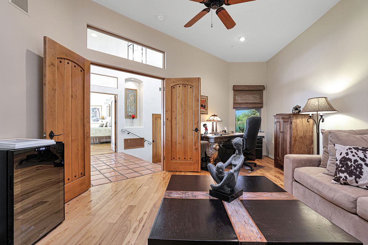 The open concept living and dining area serves as the heart of the home, featuring a centerpiece fireplace, large picture window, beamed ceilings, and a dry bar – perfect for entertaining! The primary suite, thoughtfully separated from the guest rooms, has wood flooring, a fireplace, exterior access, and an ensuite bath offering a separate shower and tub, dual vanities, and a walk-in closet. Two additional guest rooms, one ensuite, and one with access to the hall bath (also serving as a pool bath). A private office with wood flooring and double entry doors welcomes you home.