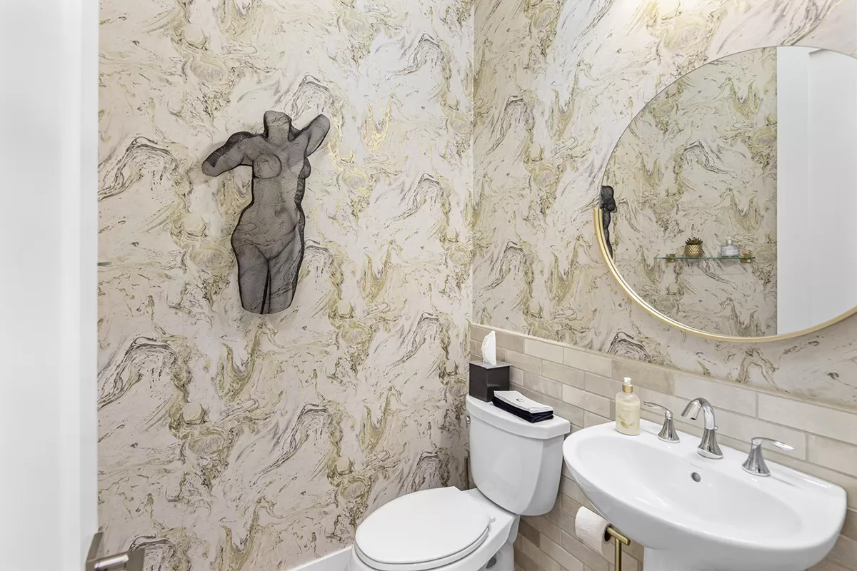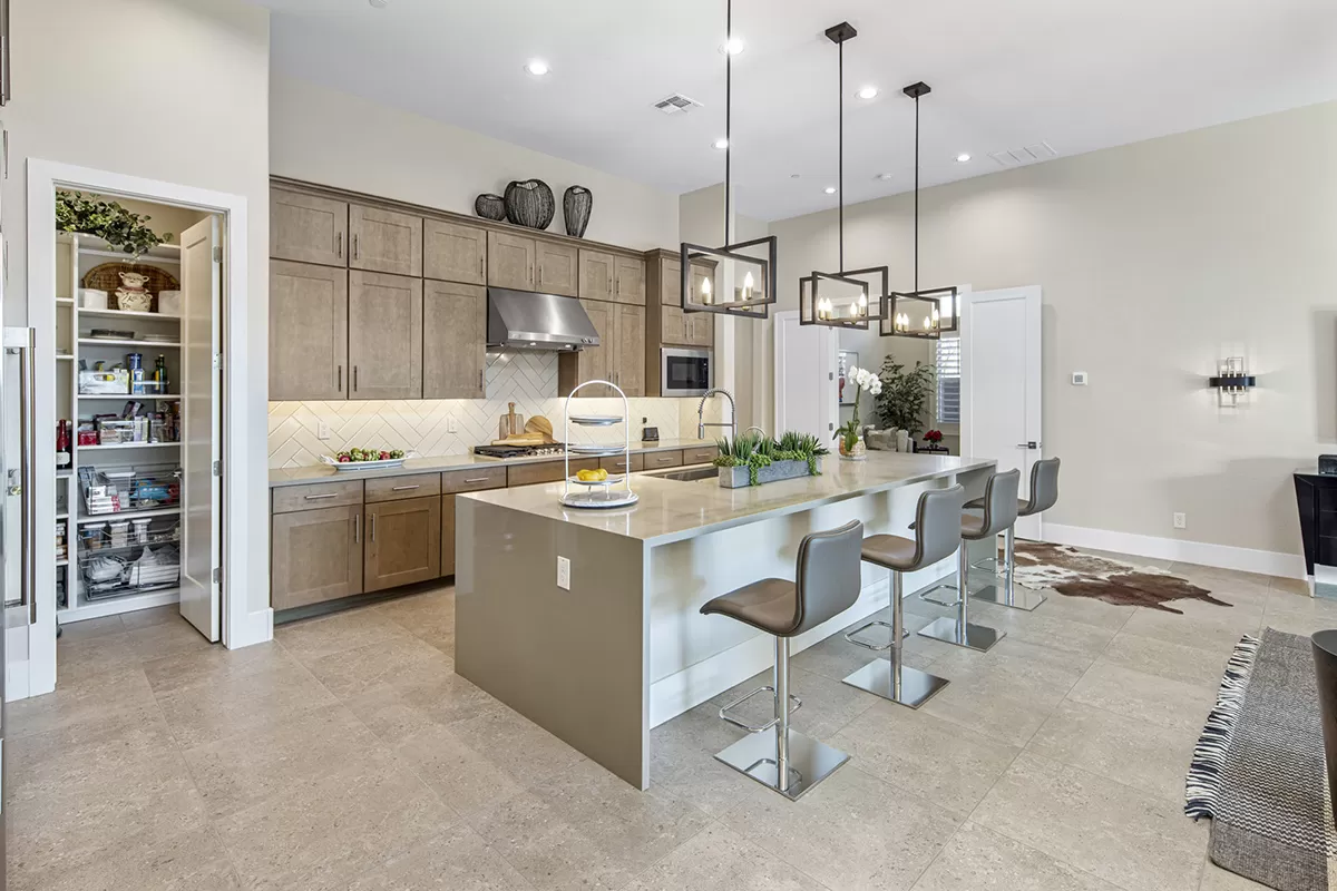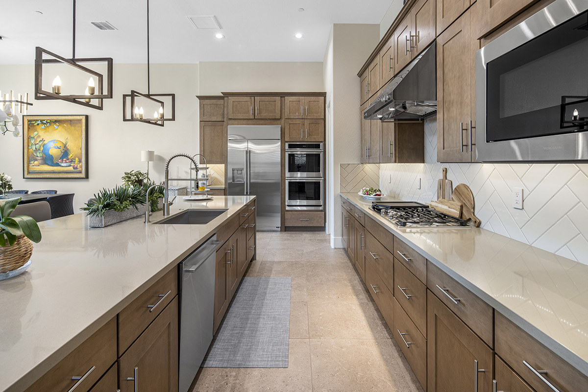 The kitchen is a chef’s delight, featuring stainless steel appliances including a gas cooktop and double wall ovens, an R/O system, large center island with seating and waterfall edge, quartz counters, and wood cabinetry.