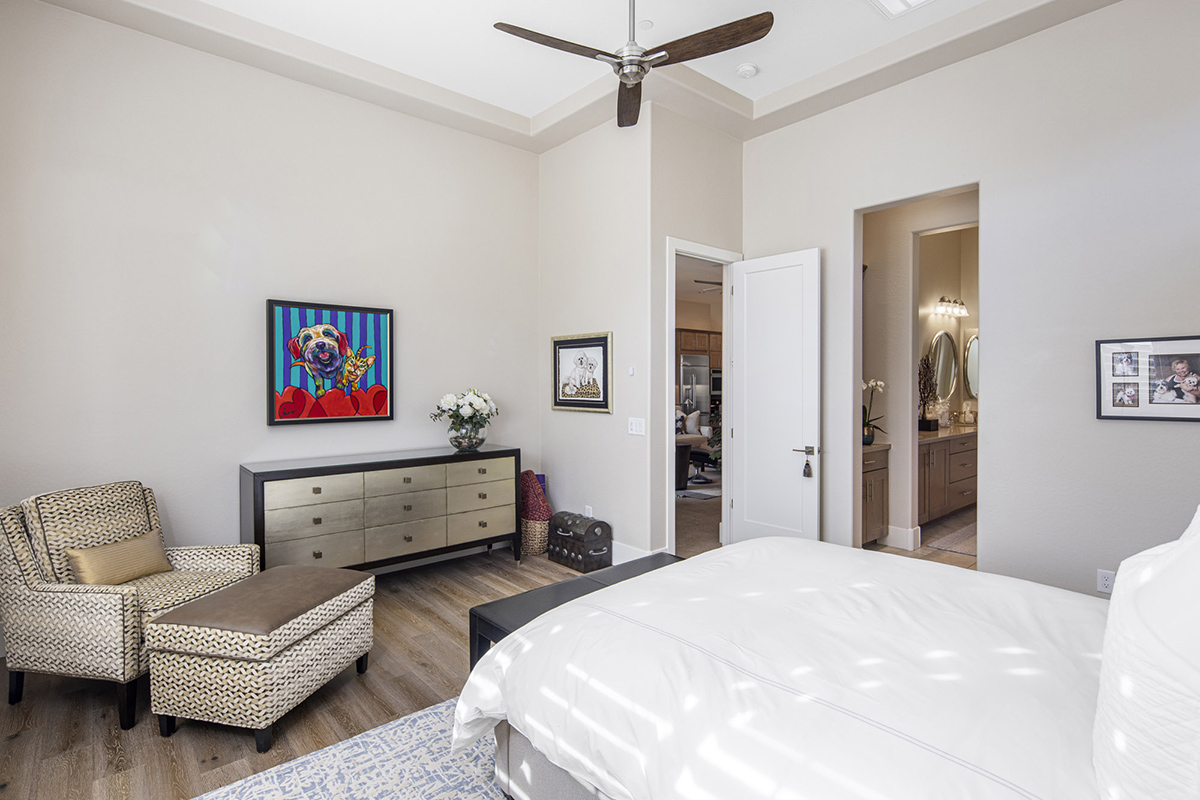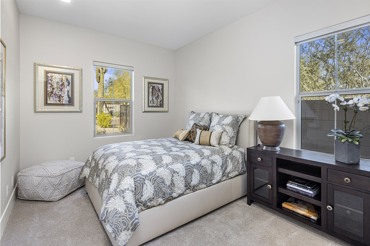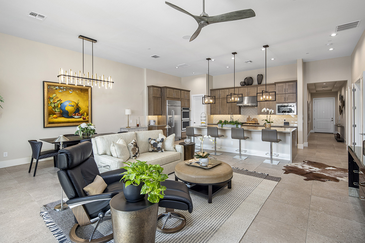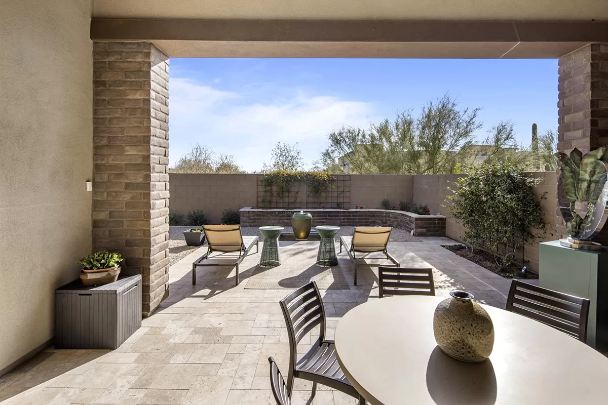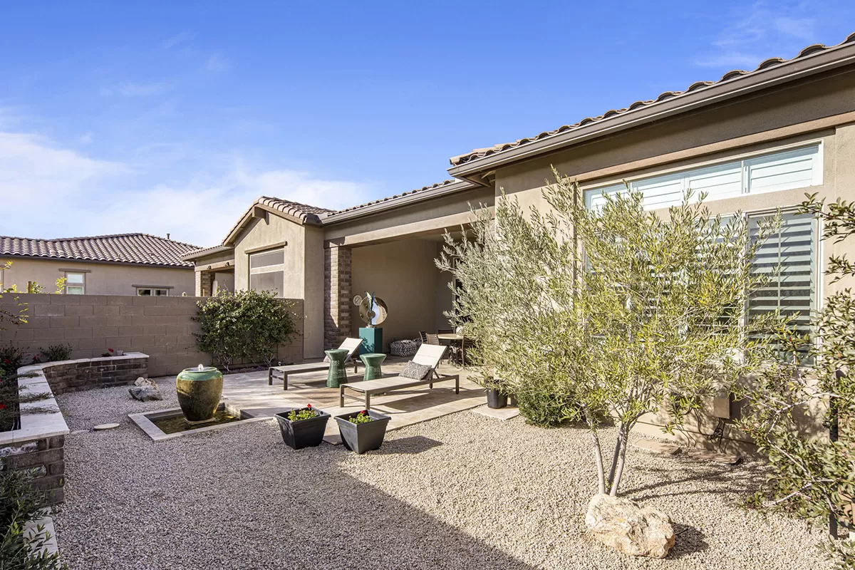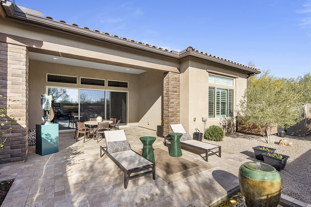 The great room boasts a wall of glass that overlooks a covered travertine patio, leading to a meticulously manicured and easily maintained, private north/south-facing backyard complete with a tranquil water feature and a covered patio.
