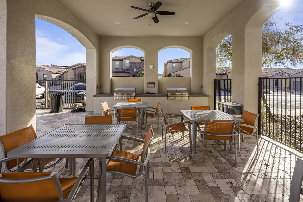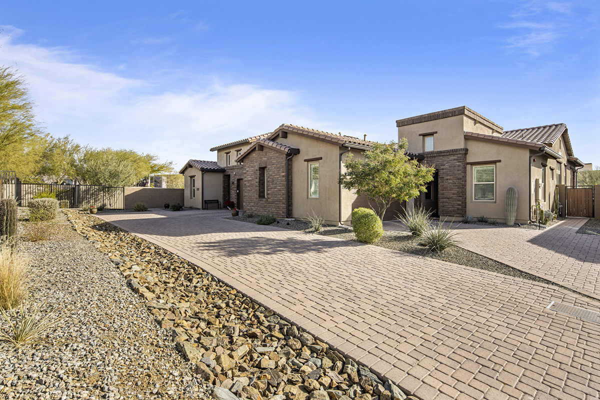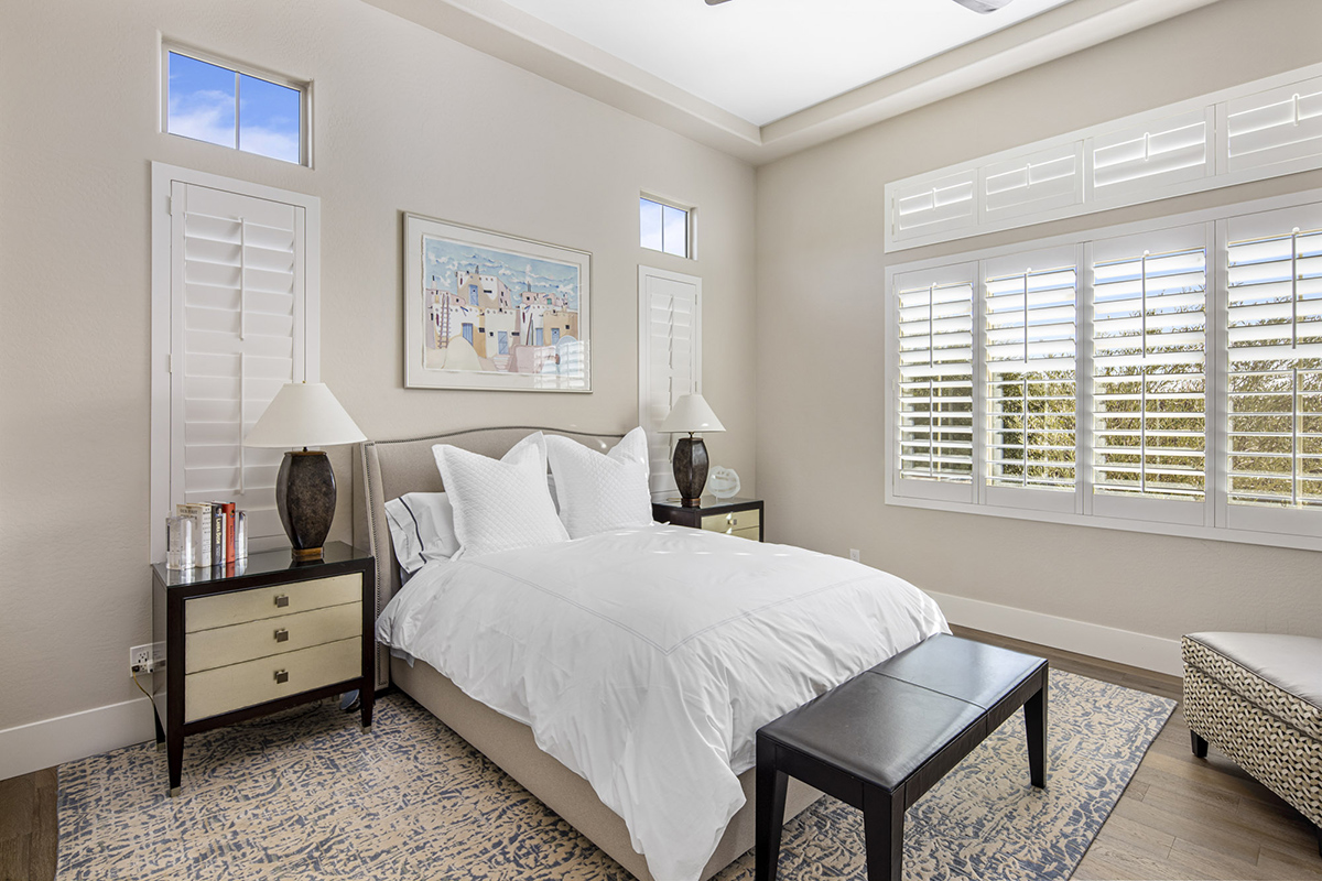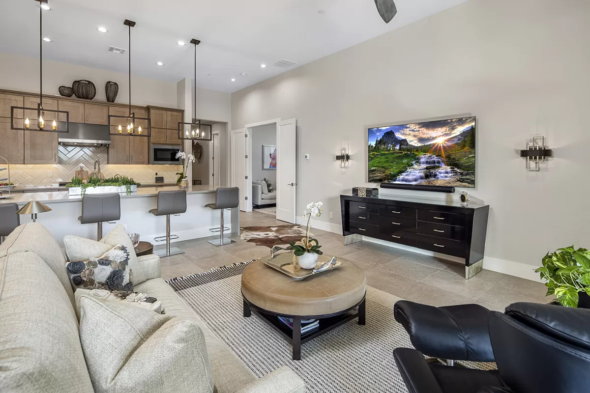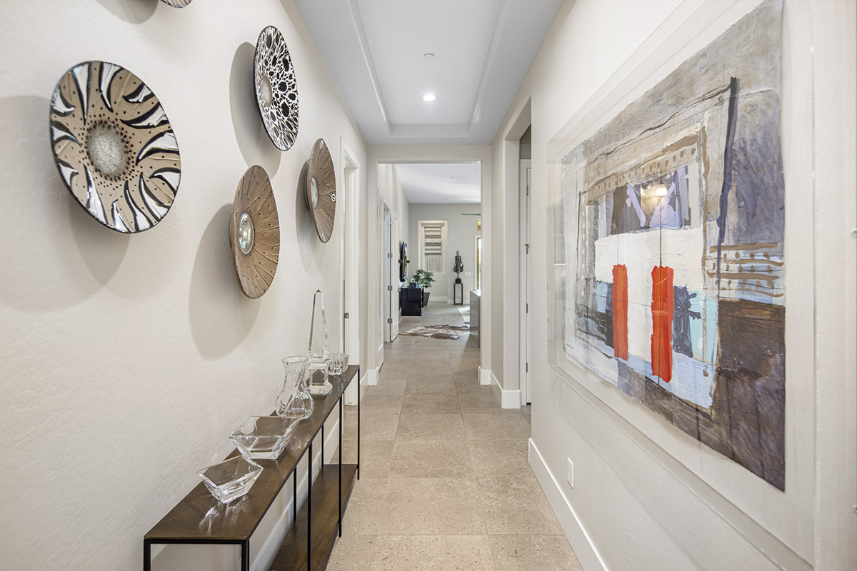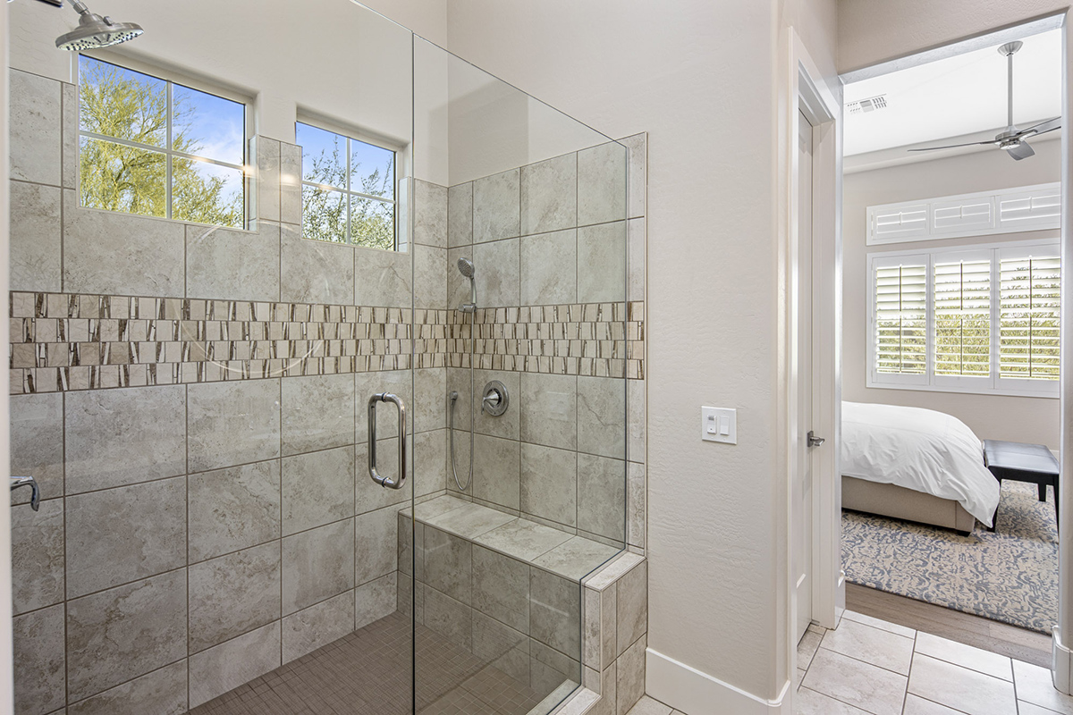 The great room boasts a wall of glass that overlooks a covered travertine patio, leading to a meticulously manicured and easily maintained, private north/south-facing backyard complete with a tranquil water feature and a covered patio.