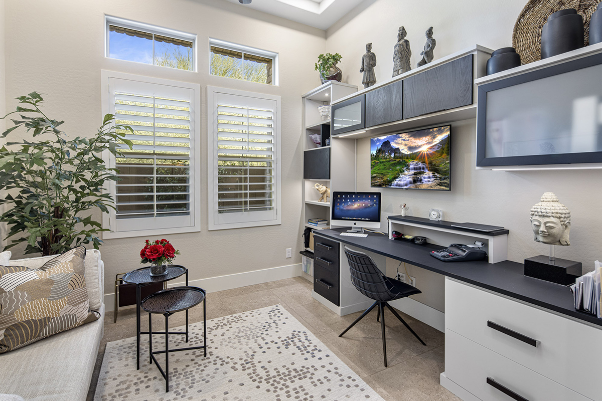 The primary bedroom has an attached ensuite bath with dual sinks, walk-in shower, spacious closet, and private water closet. The second bedroom is a junior primary suite with an ensuite bath. The den has been transformed into a custom home office by California Closets, offering built-in organization and an efficient workspace ideal for remote work but could easily be used as an optional third bedroom if needed.