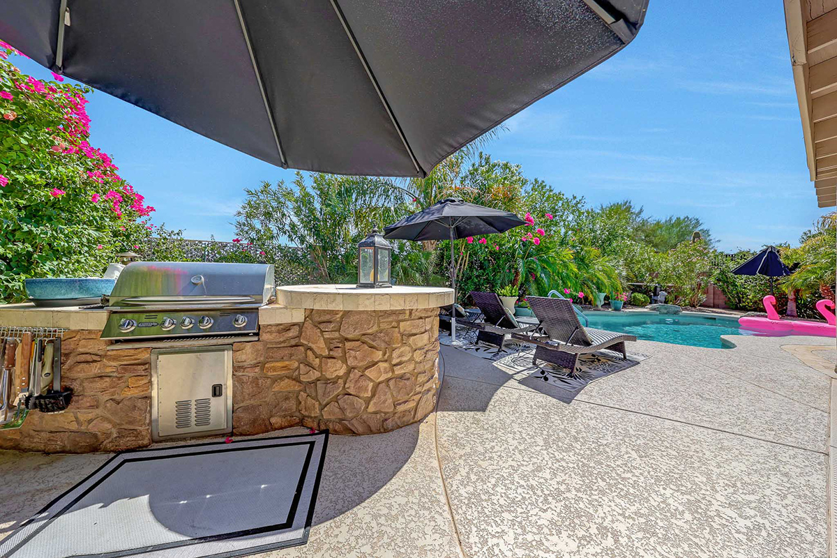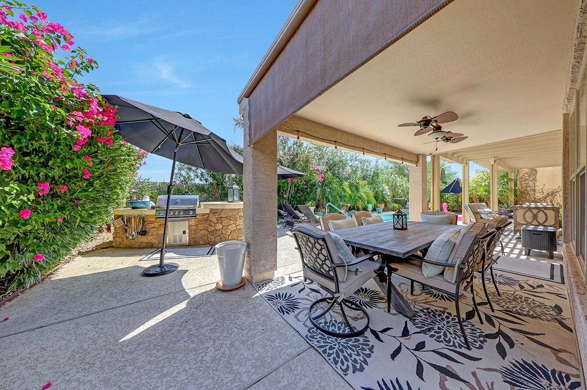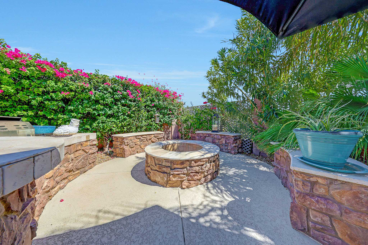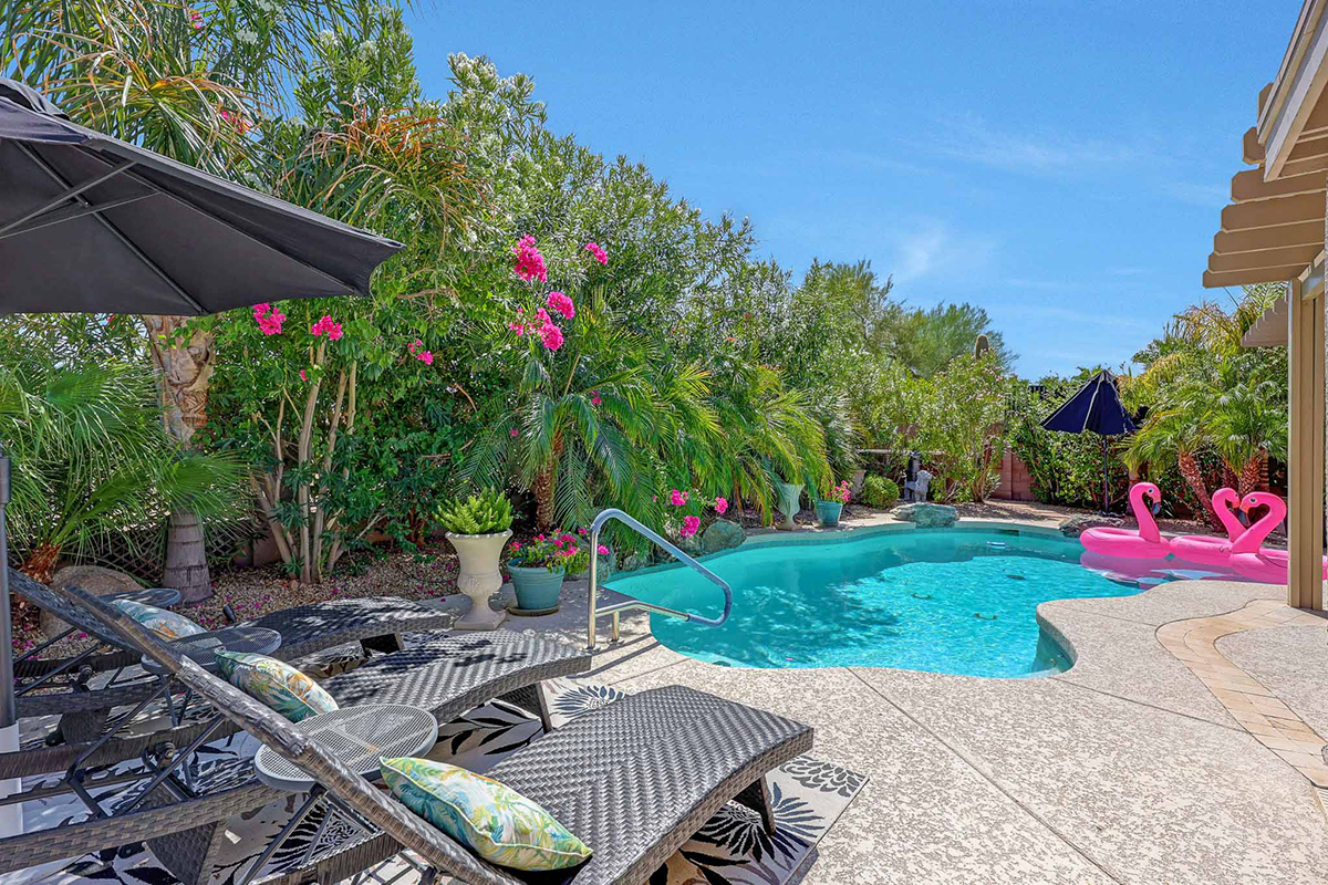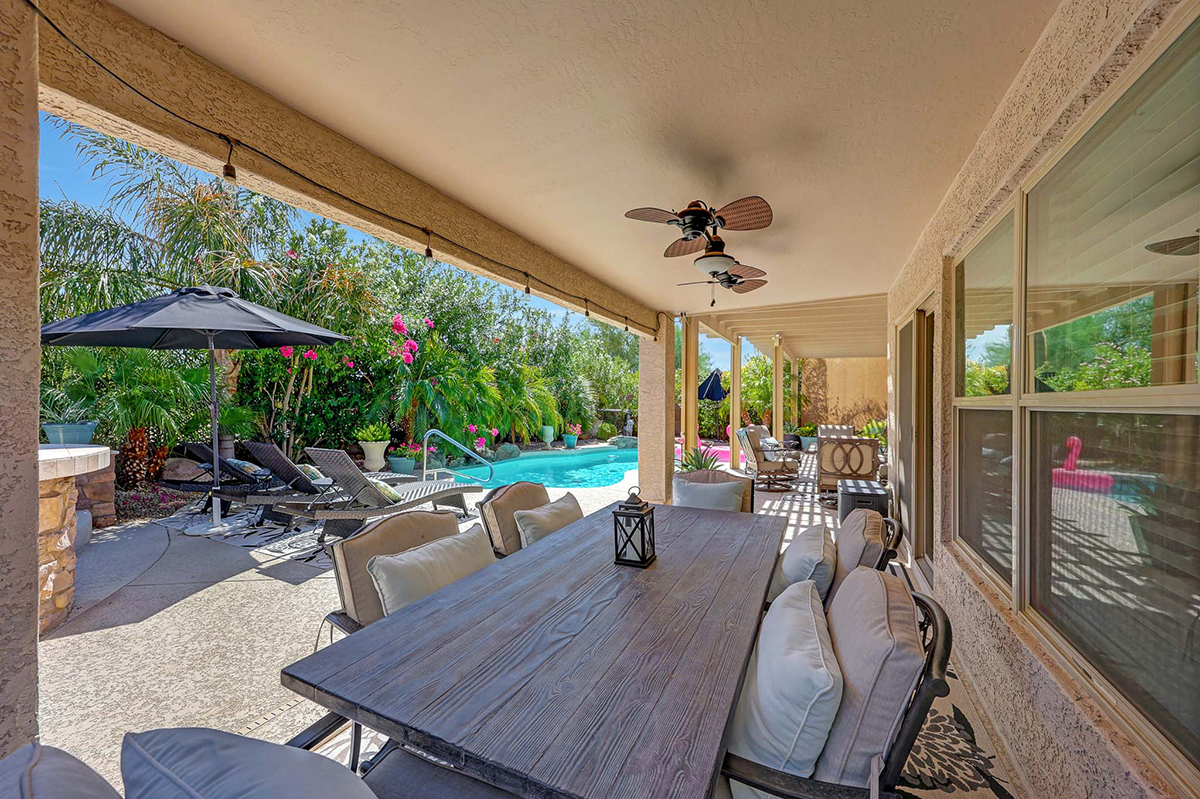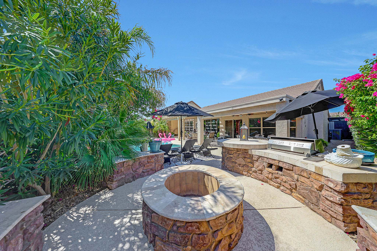 Step outside to your very own desert oasis, where lush greenery surrounds a sparkling pool, creating a tranquil escape right in your backyard. The covered patio spans the length of the house, offering multiple lounge and dining areas for outdoor enjoyment, while an elevated barbecue and firepit add a perfect spot for outdoor cooking and entertaining. The property is situated on a private lot that backs to a natural area, providing added serenity and privacy. A two-car garage with direct entry into a well-equipped laundry room with ample cabinet storage space rounds out this wonderful home.