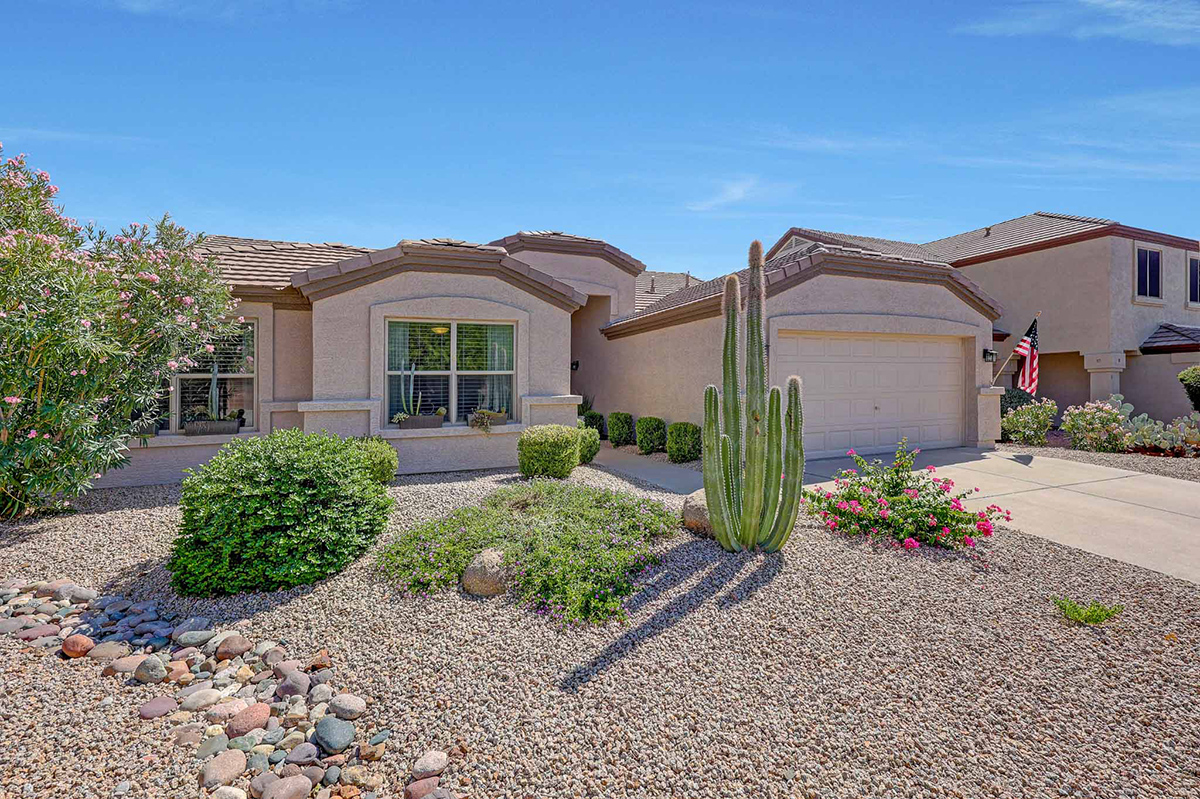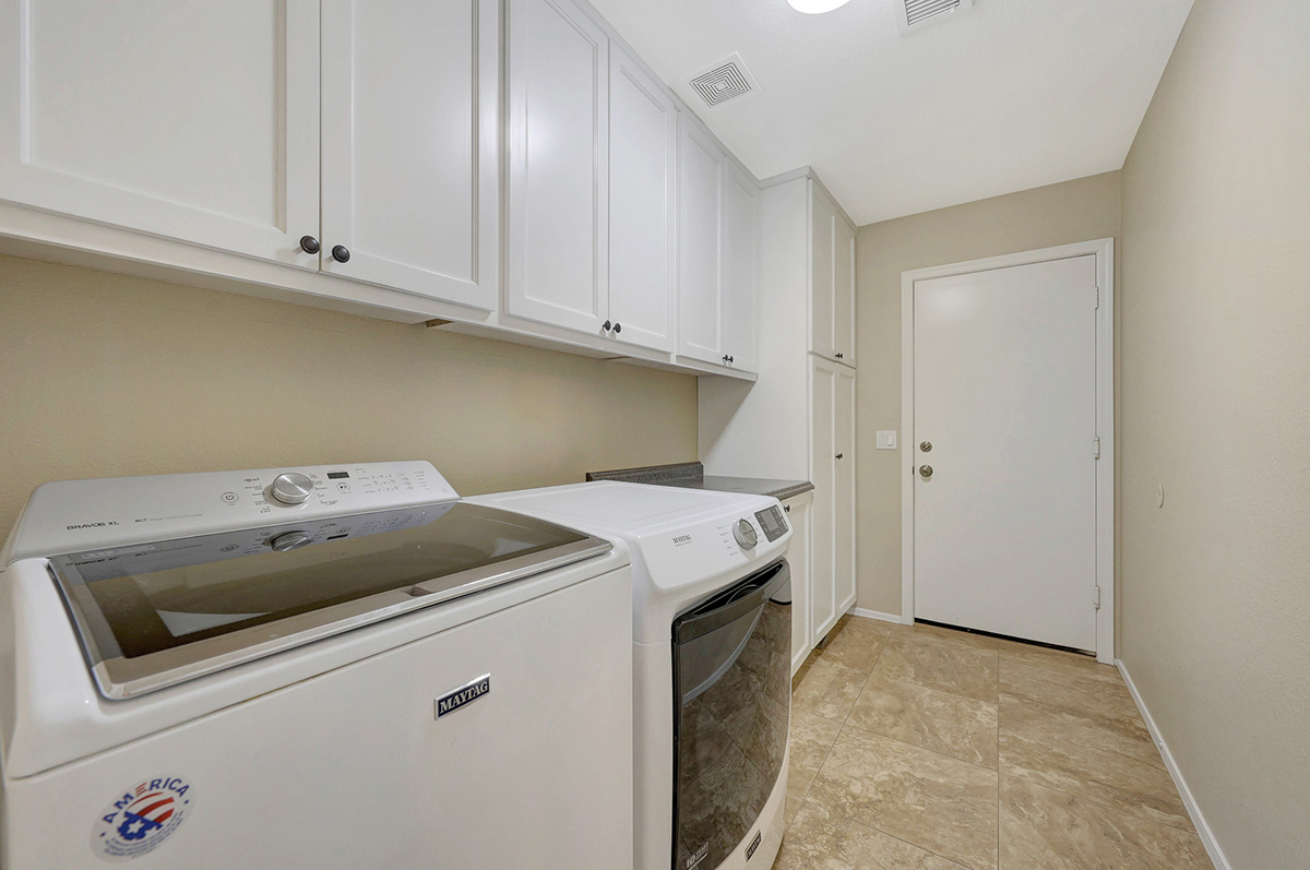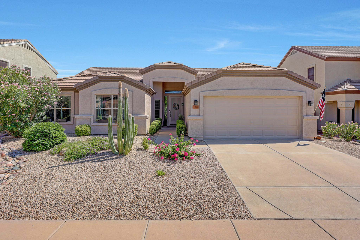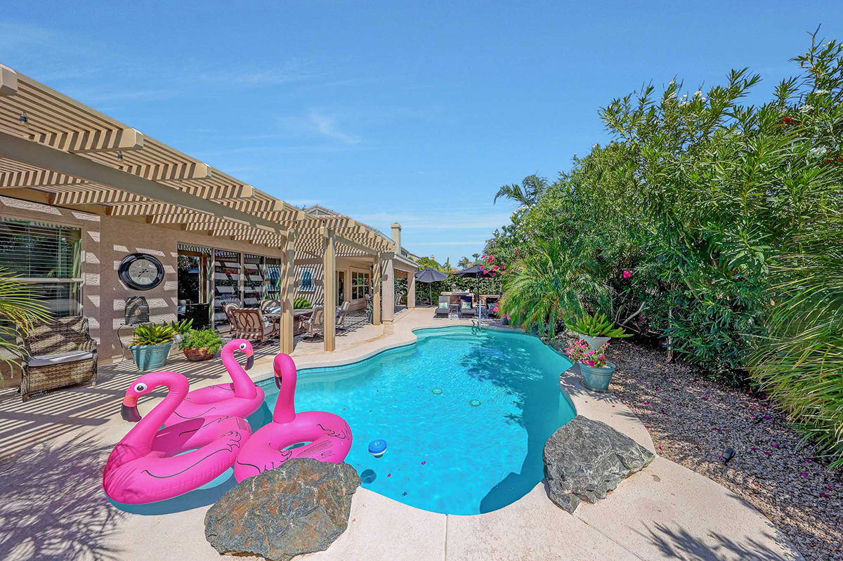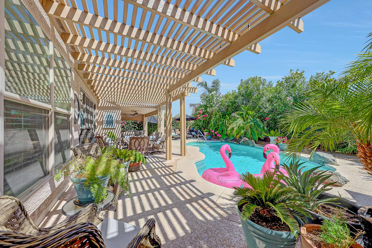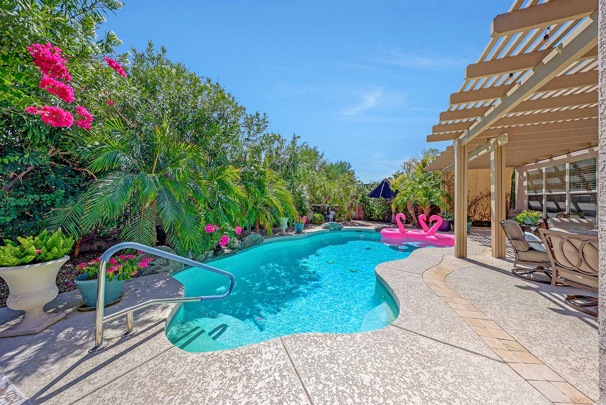 Step outside to your very own desert oasis, where lush greenery surrounds a sparkling pool, creating a tranquil escape right in your backyard. The covered patio spans the length of the house, offering multiple lounge and dining areas for outdoor enjoyment, while an elevated barbecue and firepit add a perfect spot for outdoor cooking and entertaining. The property is situated on a private lot that backs to a natural area, providing added serenity and privacy. A two-car garage with direct entry into a well-equipped laundry room with ample cabinet storage space rounds out this wonderful home.