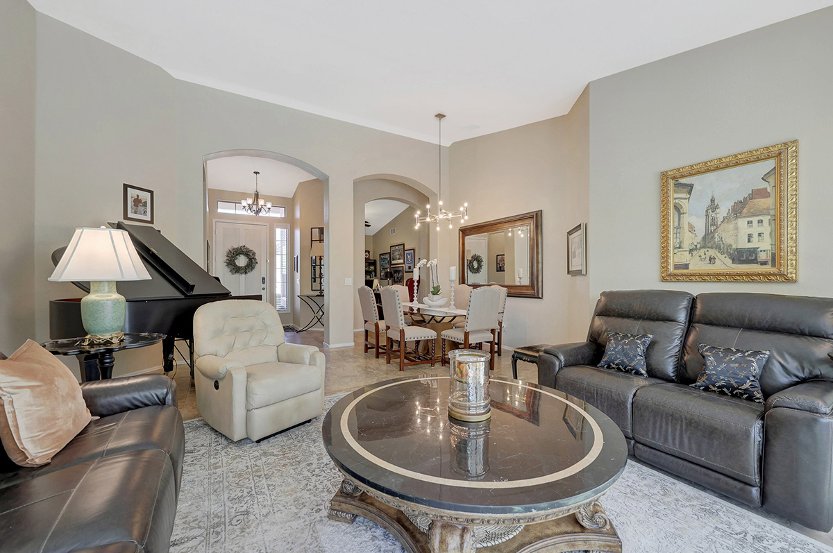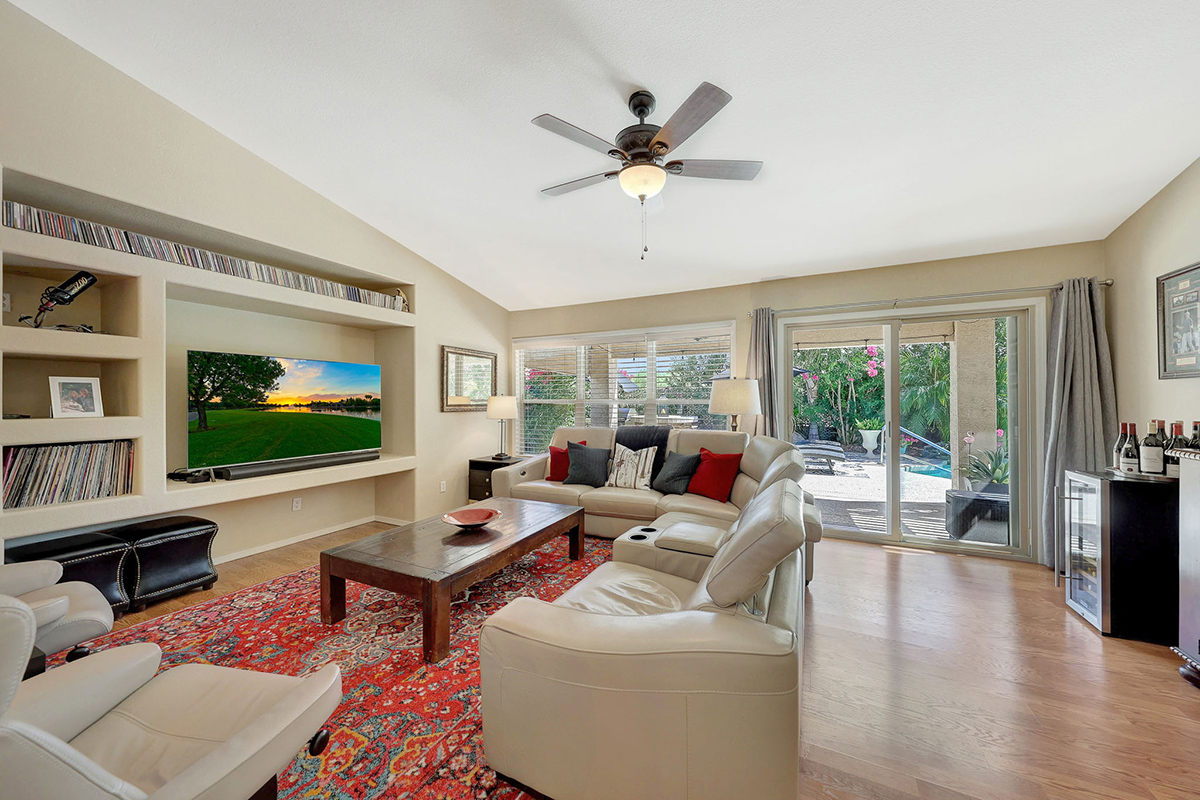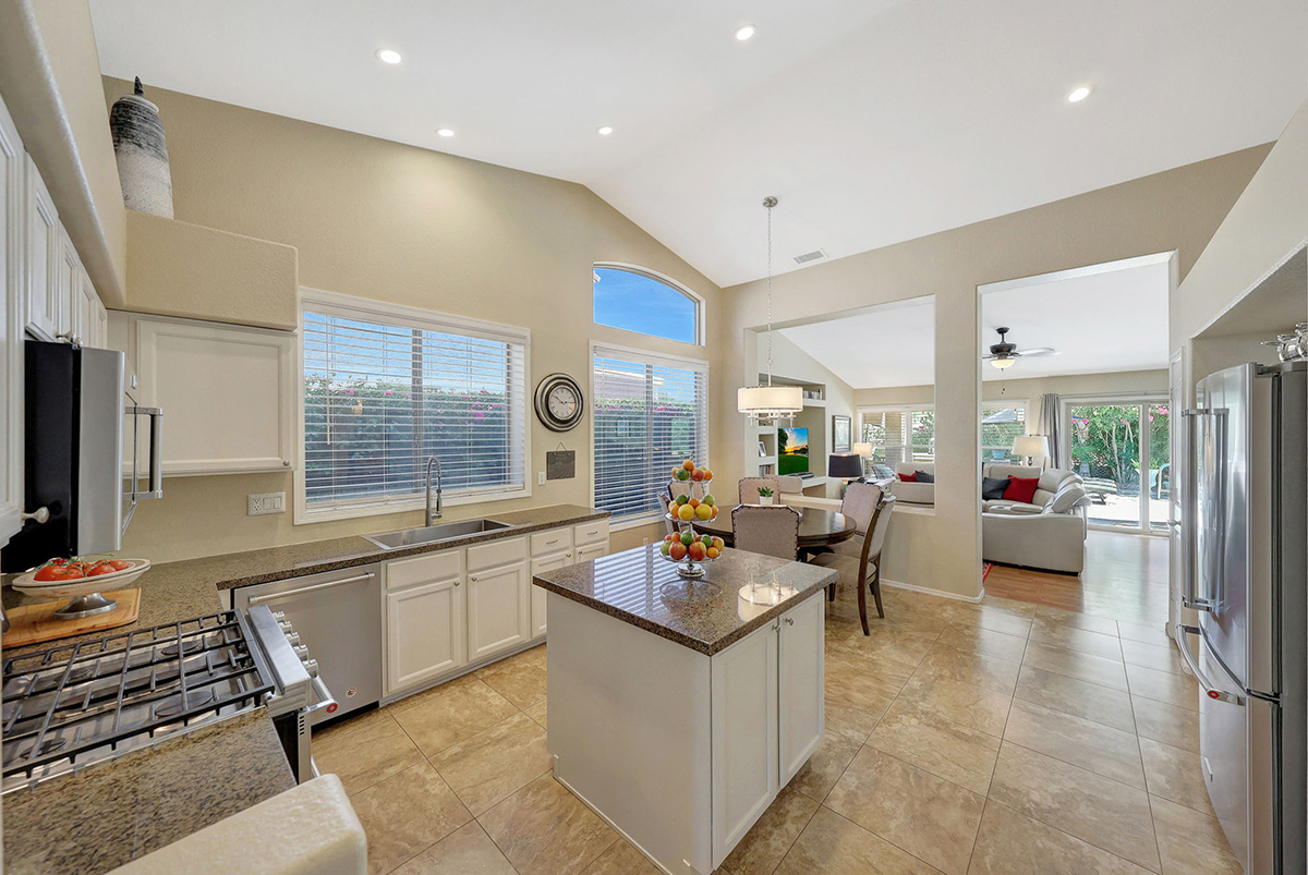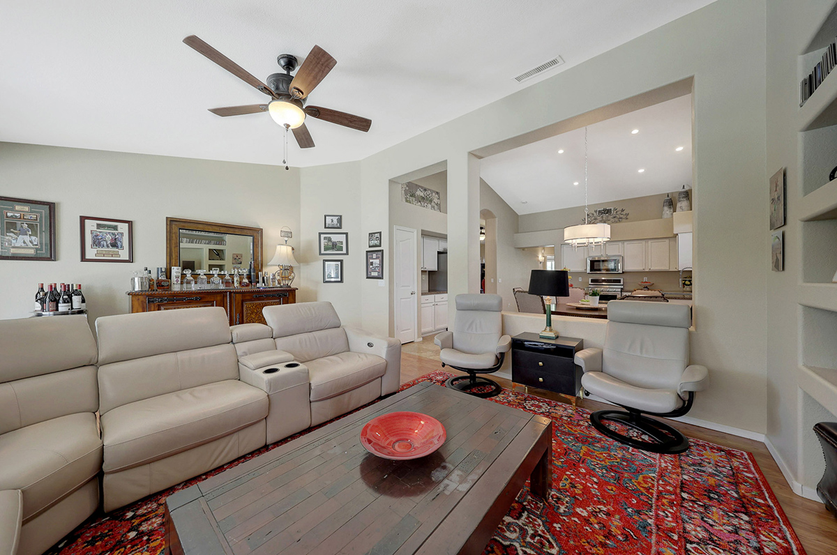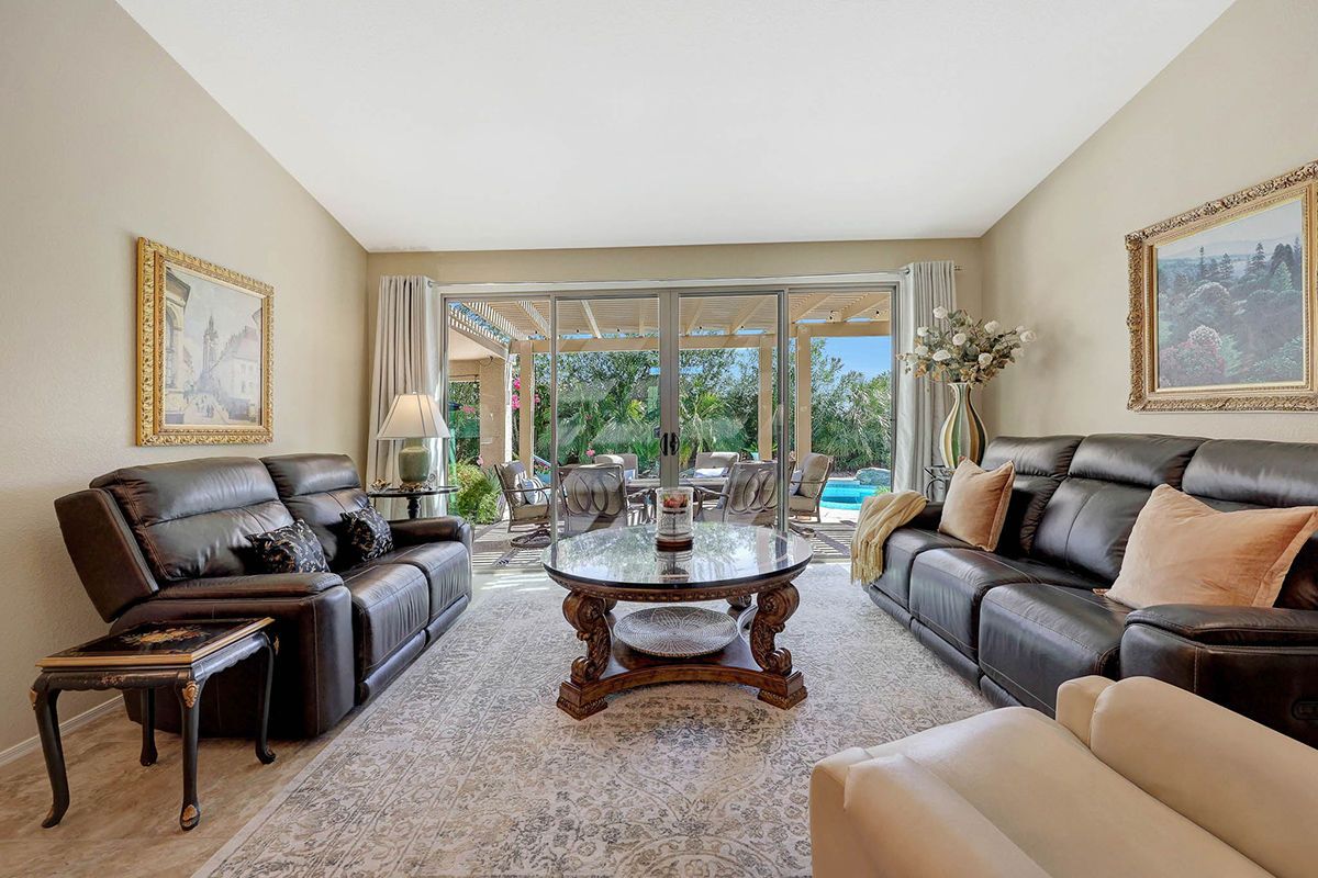 The kitchen opens up to the family room, creating a seamless flow that is perfect for everyday living and entertaining. The kitchen has ample countertop and cabinet space with a center island and breakfast dining area. Adjacent to the main entry is a versatile den, perfect for a home office or a flex space tailored to your needs. Located in the heart of the home, the formal living and dining areas are designed for elegance and comfort, highlighted by wall-to-wall sliding glass doors that flood the space with natural light and offer stunning views of the backyard pool.
