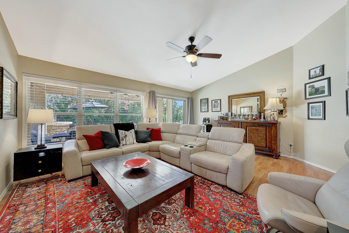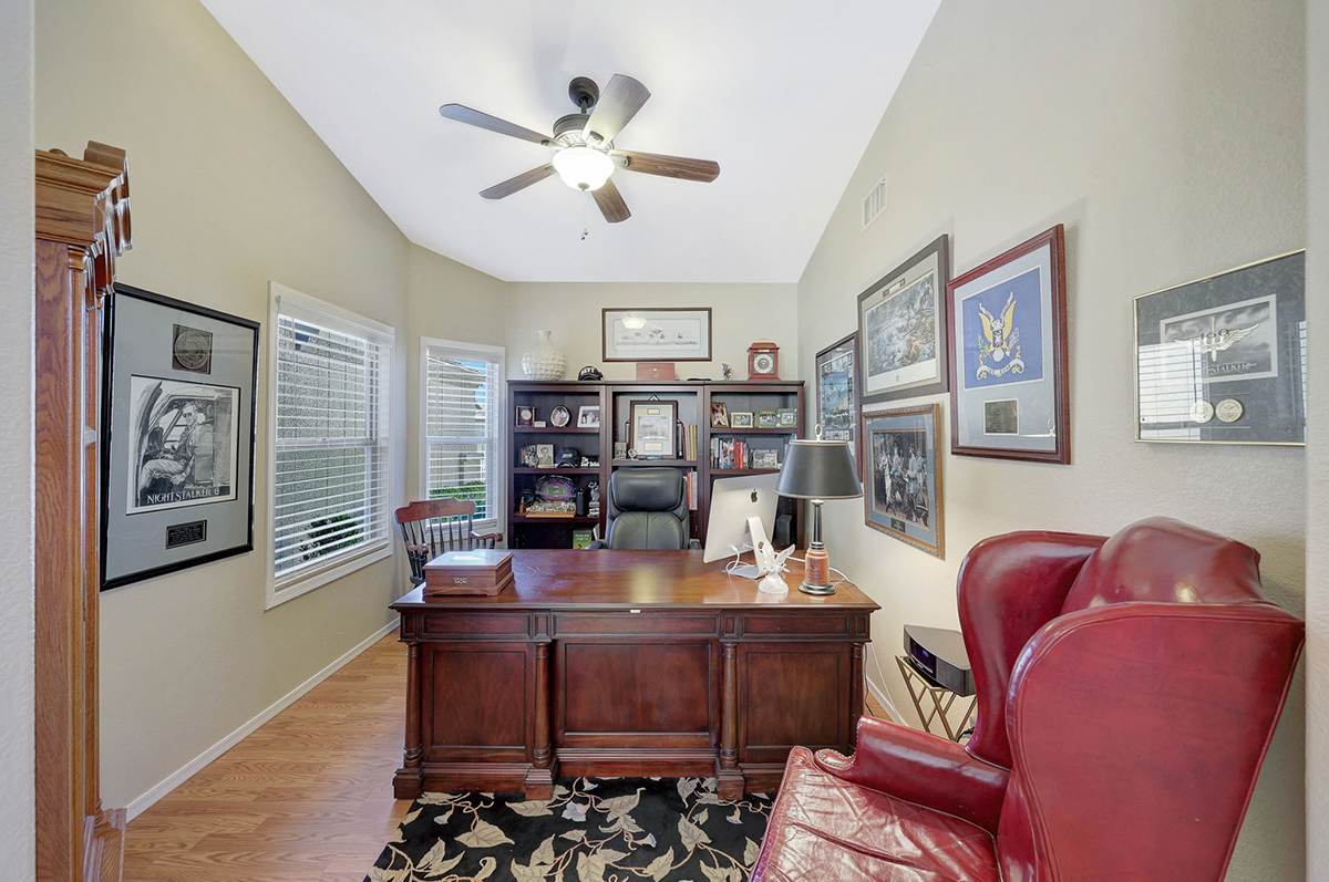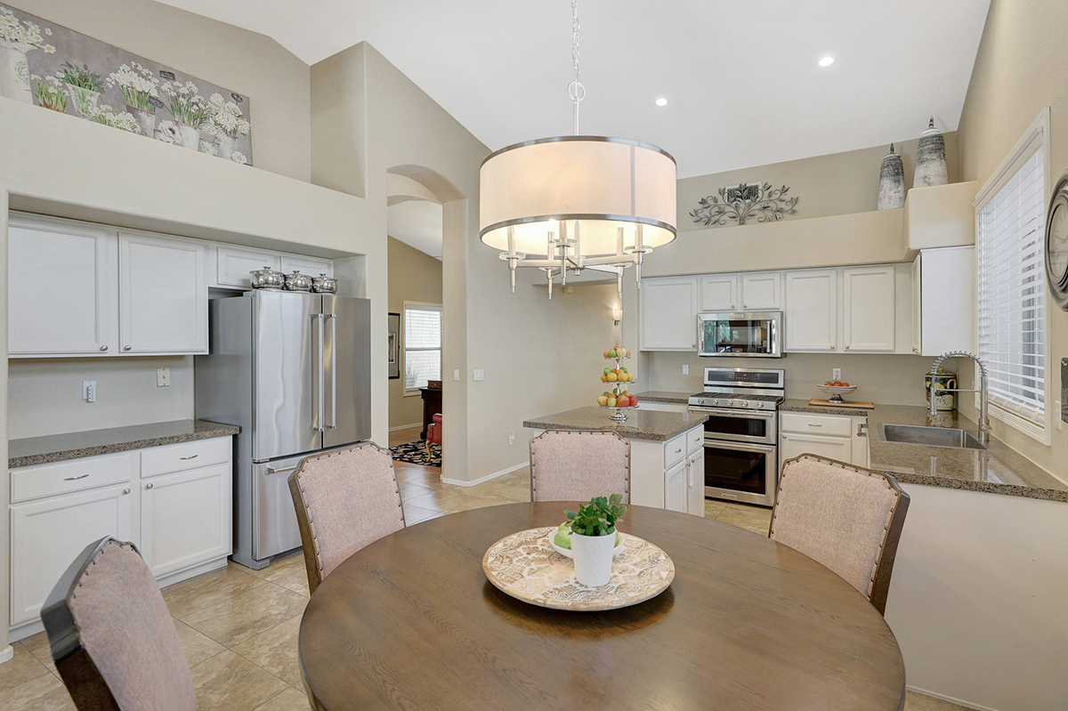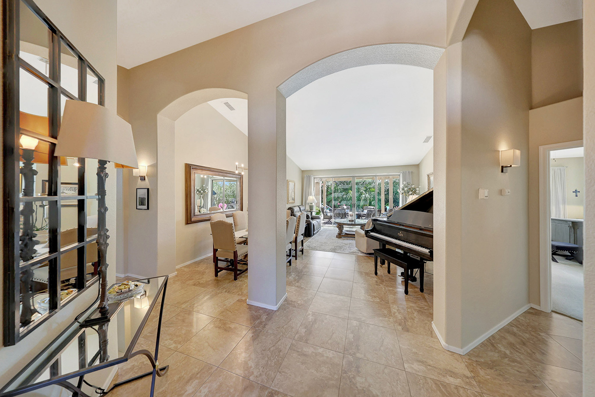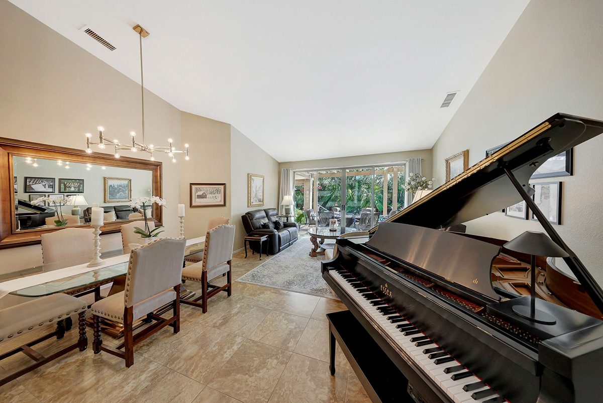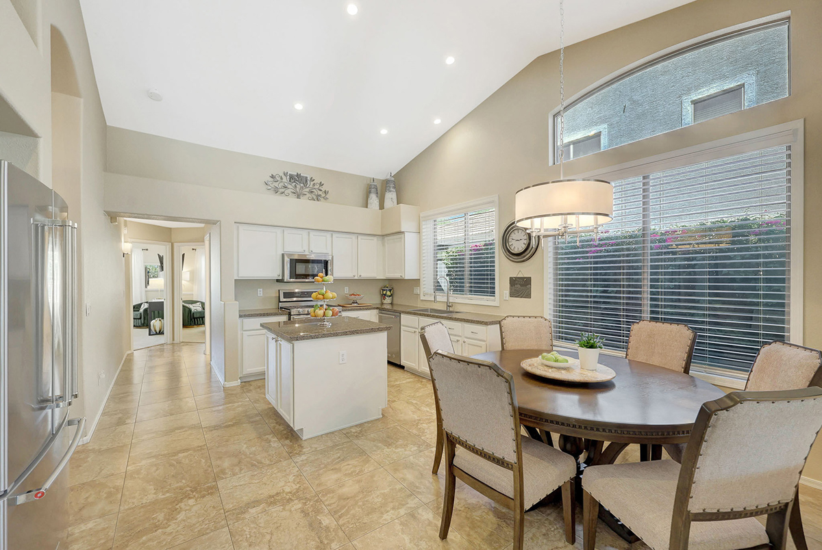 The kitchen opens up to the family room, creating a seamless flow that is perfect for everyday living and entertaining. The kitchen has ample countertop and cabinet space with a center island and breakfast dining area. Adjacent to the main entry is a versatile den, perfect for a home office or a flex space tailored to your needs. Located in the heart of the home, the formal living and dining areas are designed for elegance and comfort, highlighted by wall-to-wall sliding glass doors that flood the space with natural light and offer stunning views of the backyard pool.