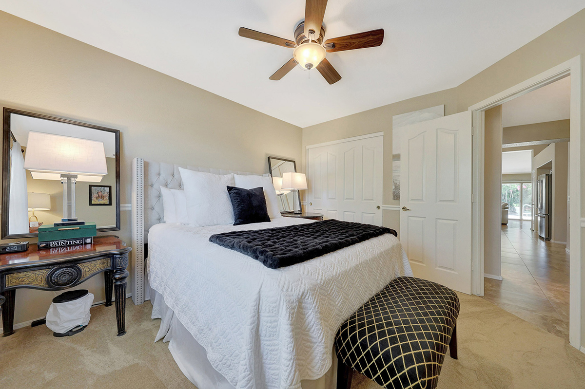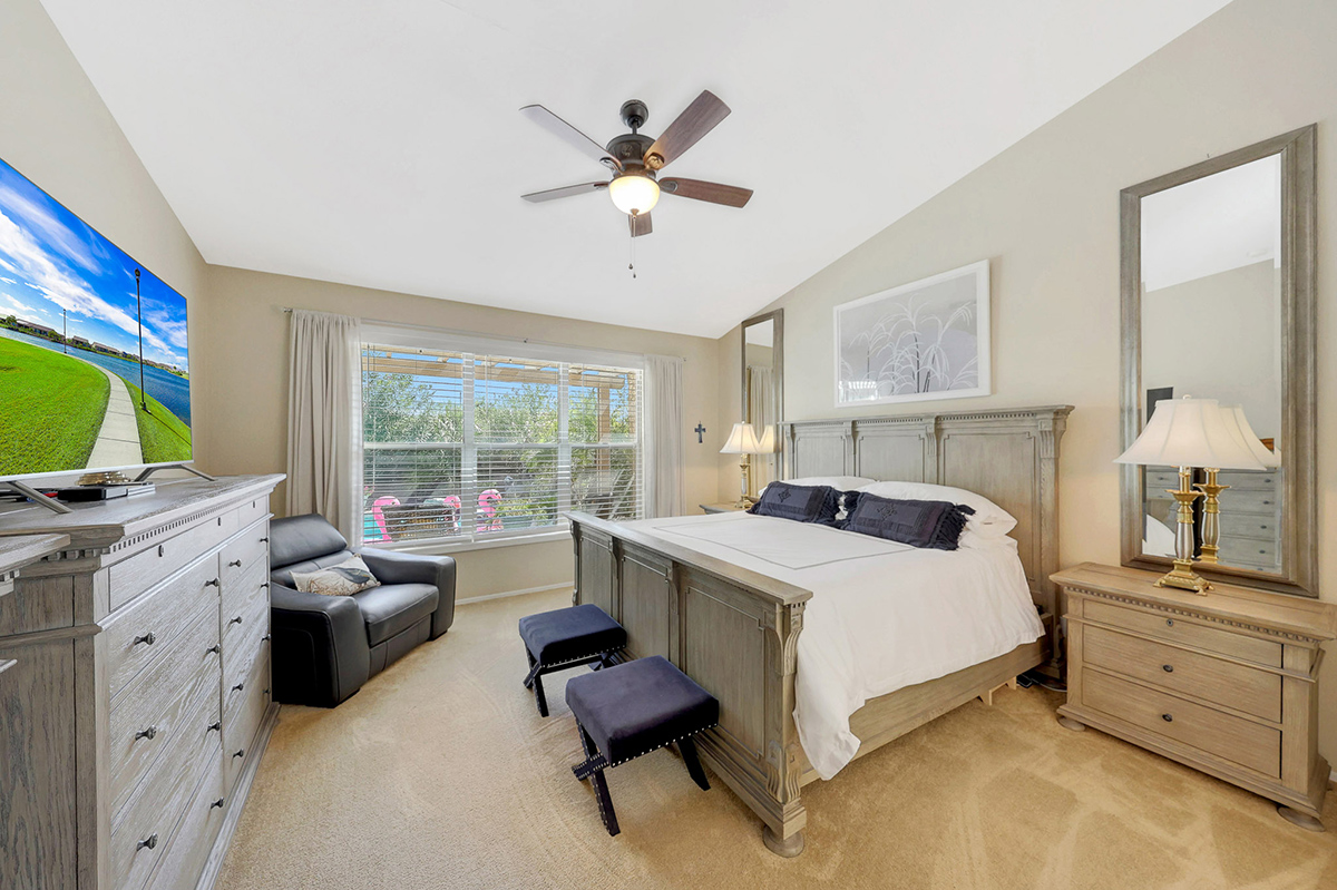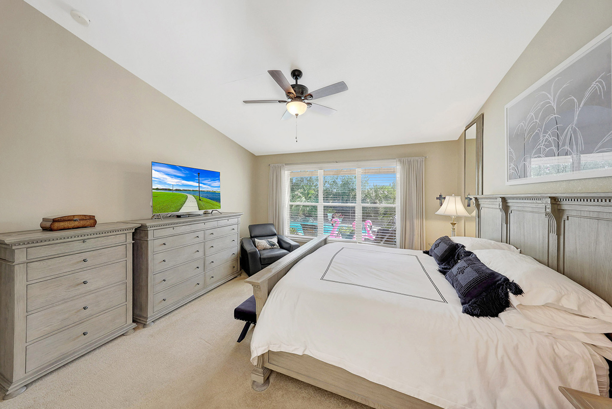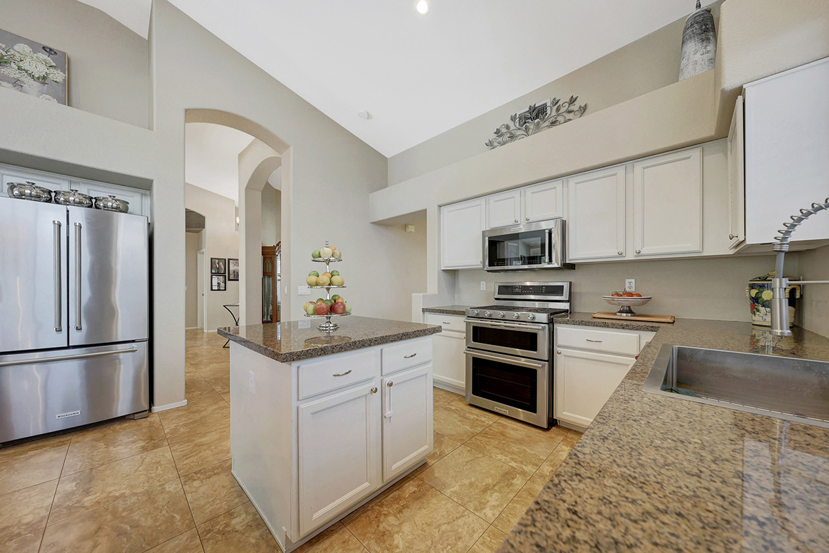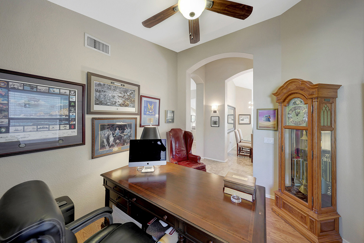 The kitchen opens up to the family room, creating a seamless flow that is perfect for everyday living and entertaining. The kitchen has ample countertop and cabinet space with a center island and breakfast dining area. Adjacent to the main entry is a versatile den, perfect for a home office or a flex space tailored to your needs. Located in the heart of the home, the formal living and dining areas are designed for elegance and comfort, highlighted by wall-to-wall sliding glass doors that flood the space with natural light and offer stunning views of the backyard pool.