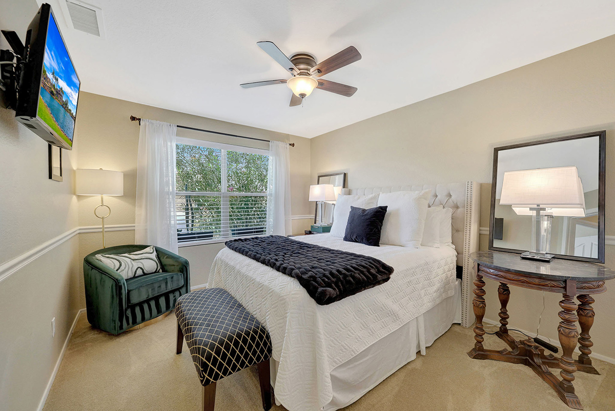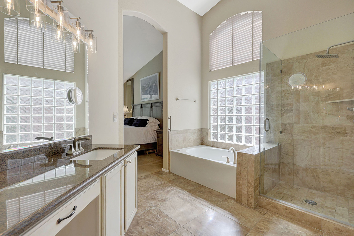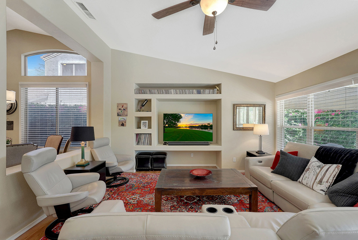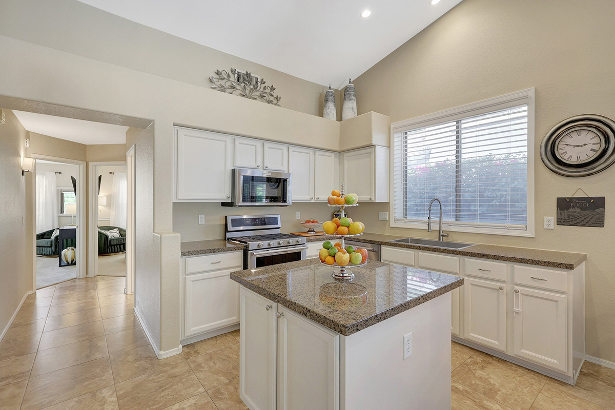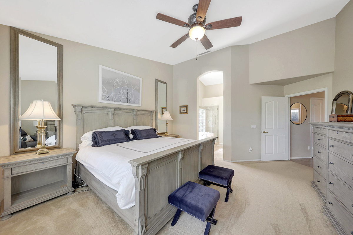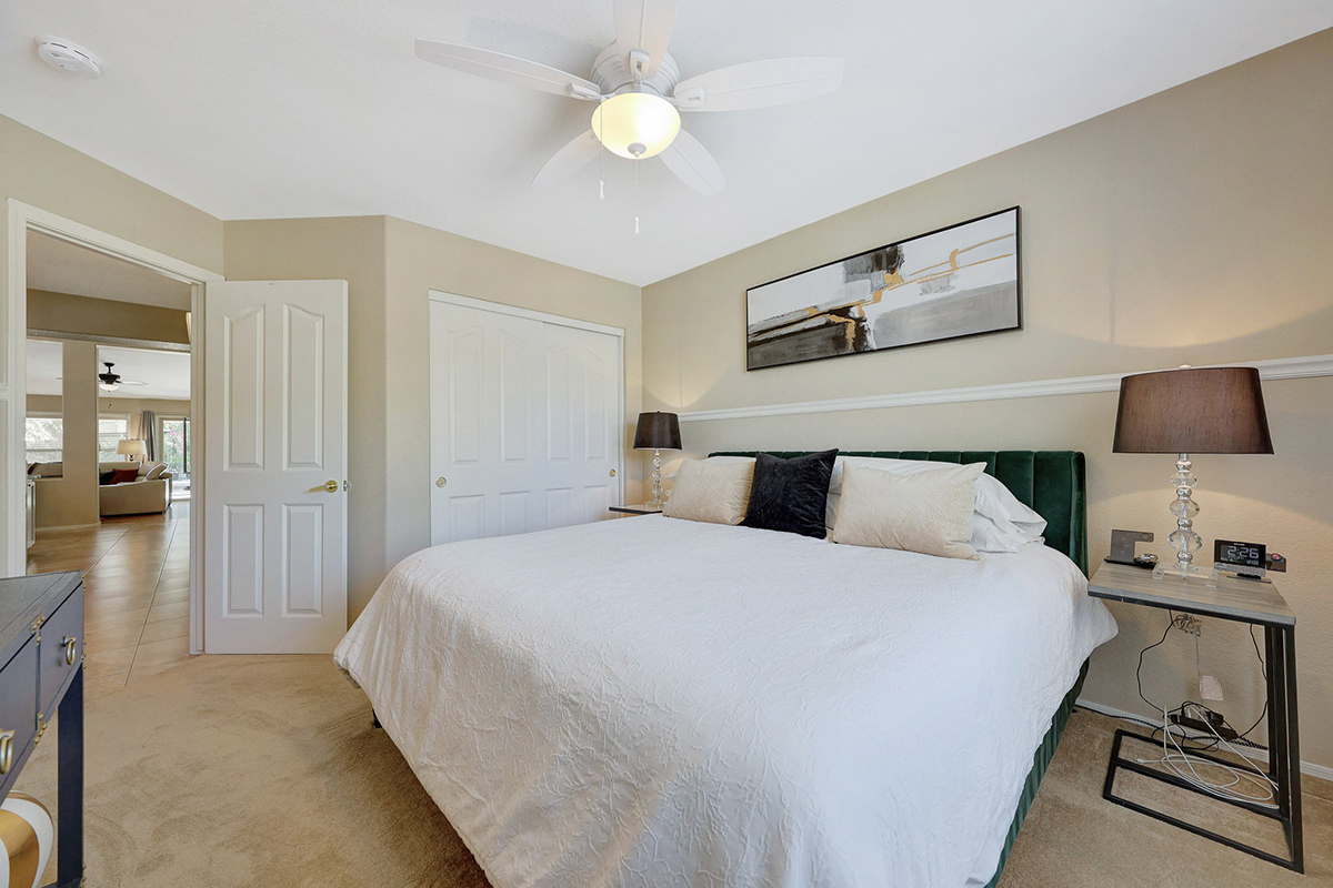The kitchen opens up to the family room, creating a seamless flow that is perfect for everyday living and entertaining. The kitchen has ample countertop and cabinet space with a center island and breakfast dining area. Adjacent to the main entry is a versatile den, perfect for a home office or a flex space tailored to your needs. Located in the heart of the home, the formal living and dining areas are designed for elegance and comfort, highlighted by wall-to-wall sliding glass doors that flood the space with natural light and offer stunning views of the backyard pool.