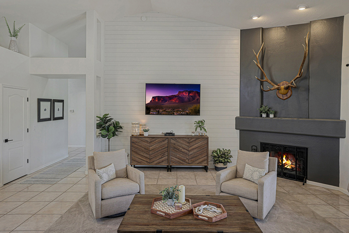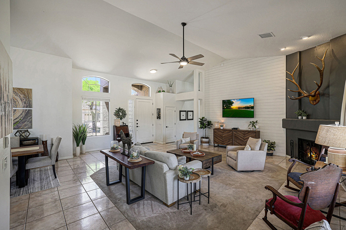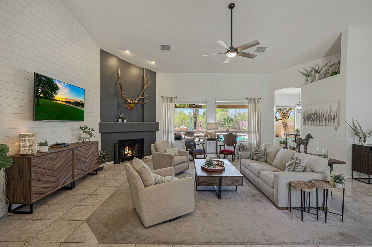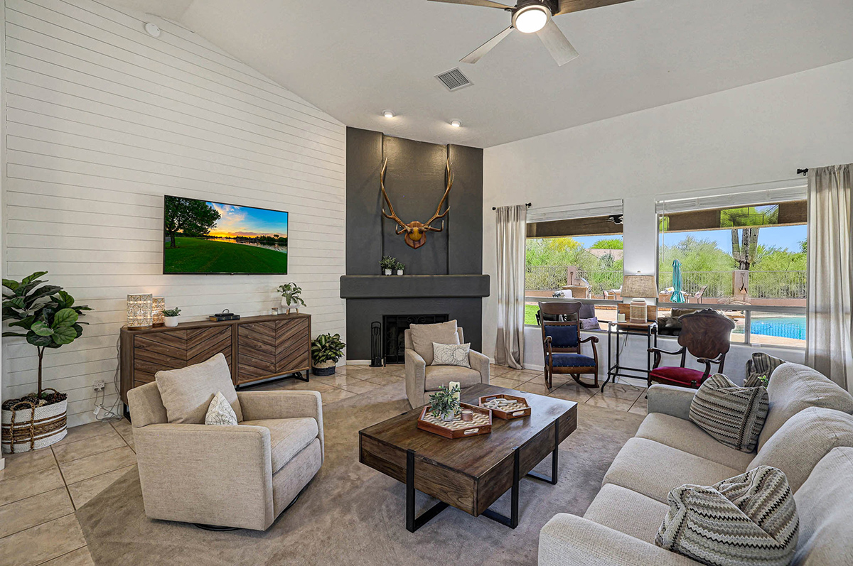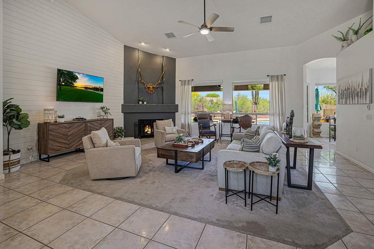 Welcome to your new haven at Tatum Ranch, where a private setting and a natural wash offer a tranquil retreat and view corridor! This 2,203 square foot gem boasts three bedrooms and two and a half baths in a contemporary great room layout. The heart of the home, the living room, welcomes you with its high ceilings and sunlit windows, offering views of the backyard oasis and nearby wash, all accented by the wood-burning fireplace and the charming shiplap wall.