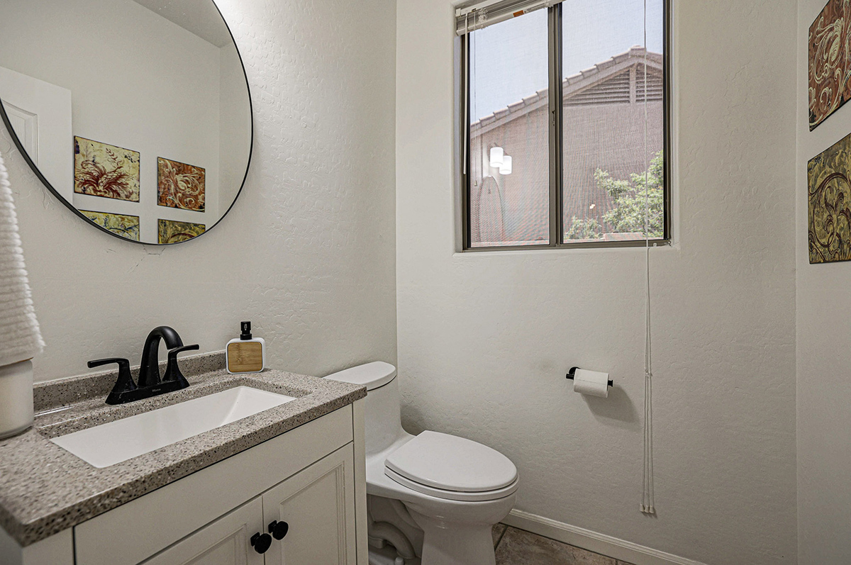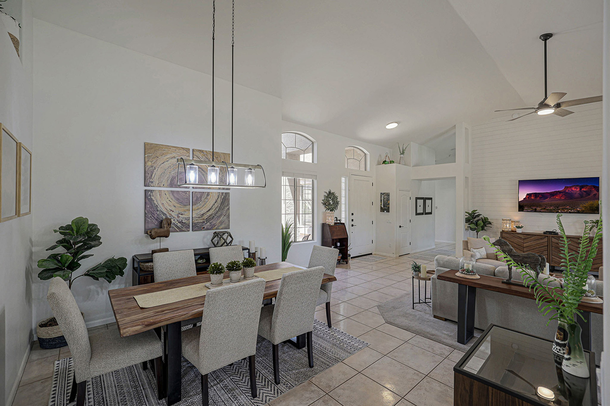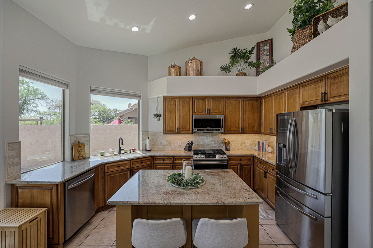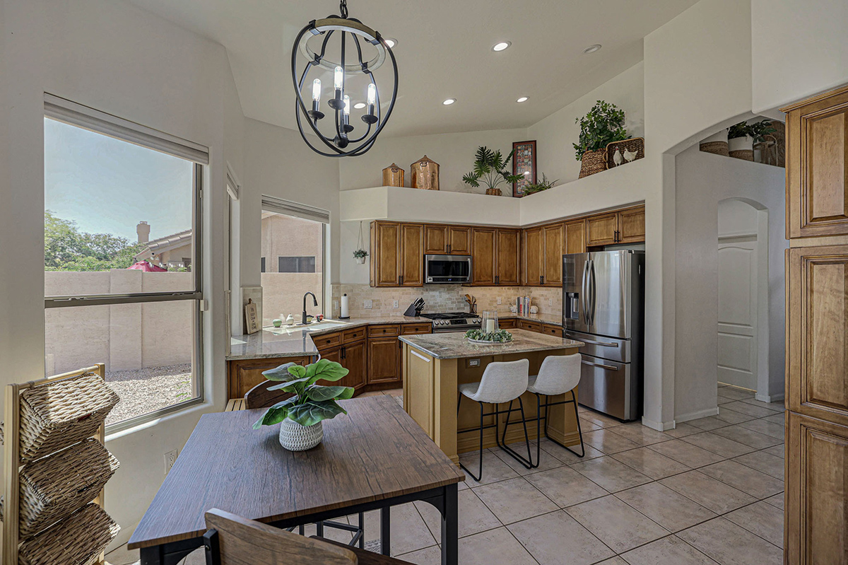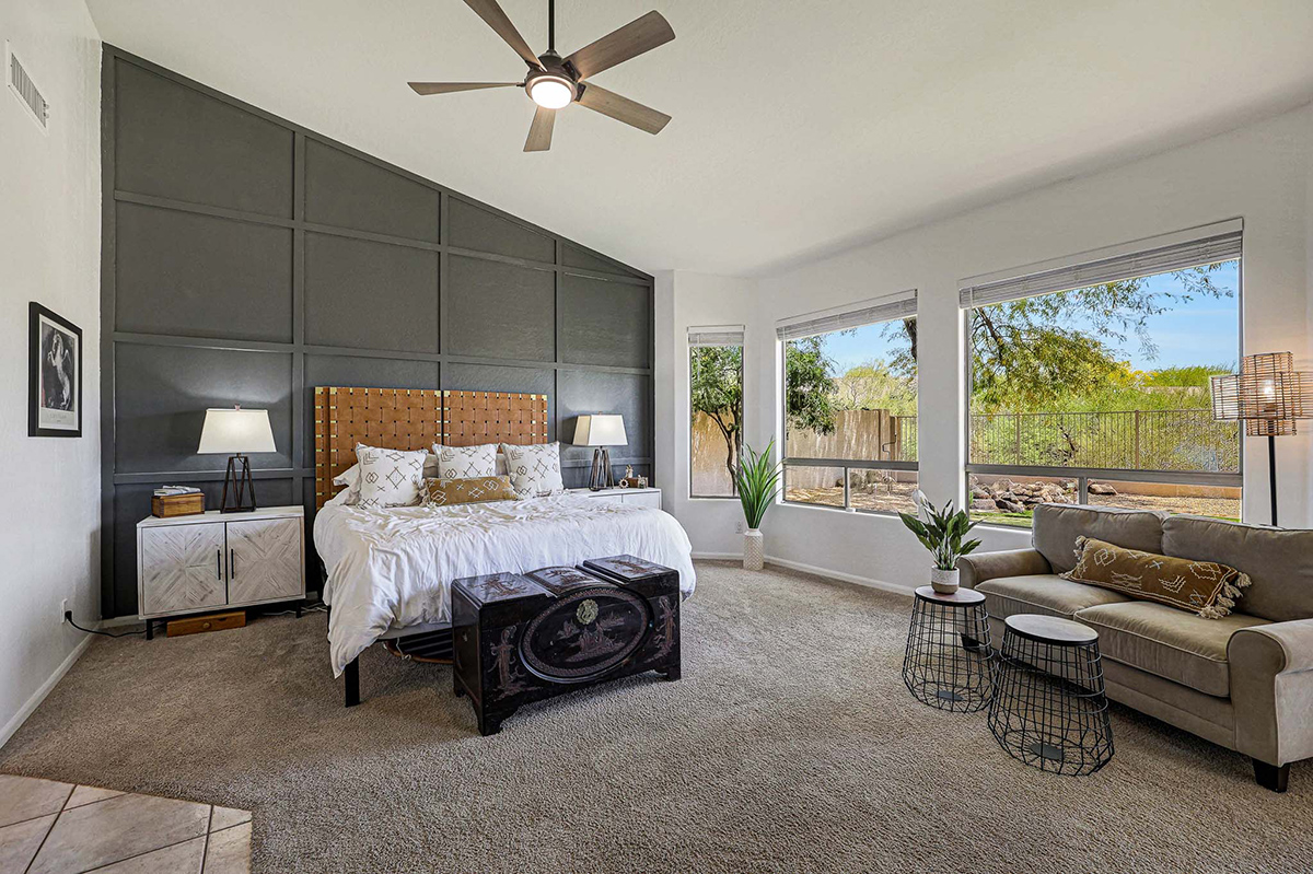 Welcome to your new haven at Tatum Ranch, where a private setting and a natural wash offer a tranquil retreat and view corridor! This 2,203 square foot gem boasts three bedrooms and two and a half baths in a contemporary great room layout. The heart of the home, the living room, welcomes you with its high ceilings and sunlit windows, offering views of the backyard oasis and nearby wash, all accented by the wood-burning fireplace and the charming shiplap wall.