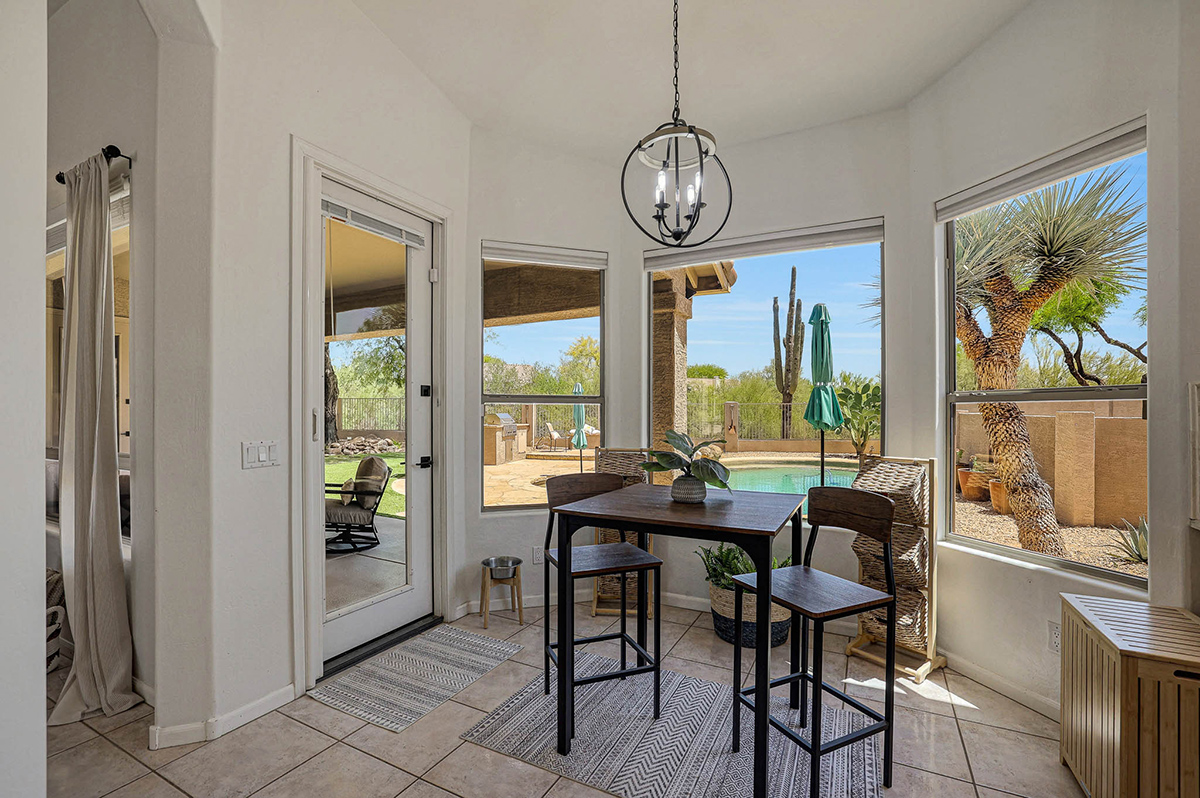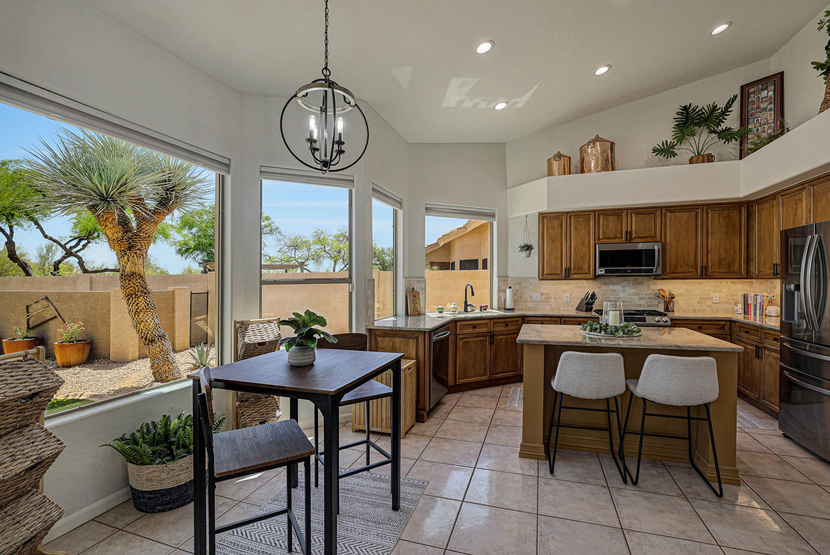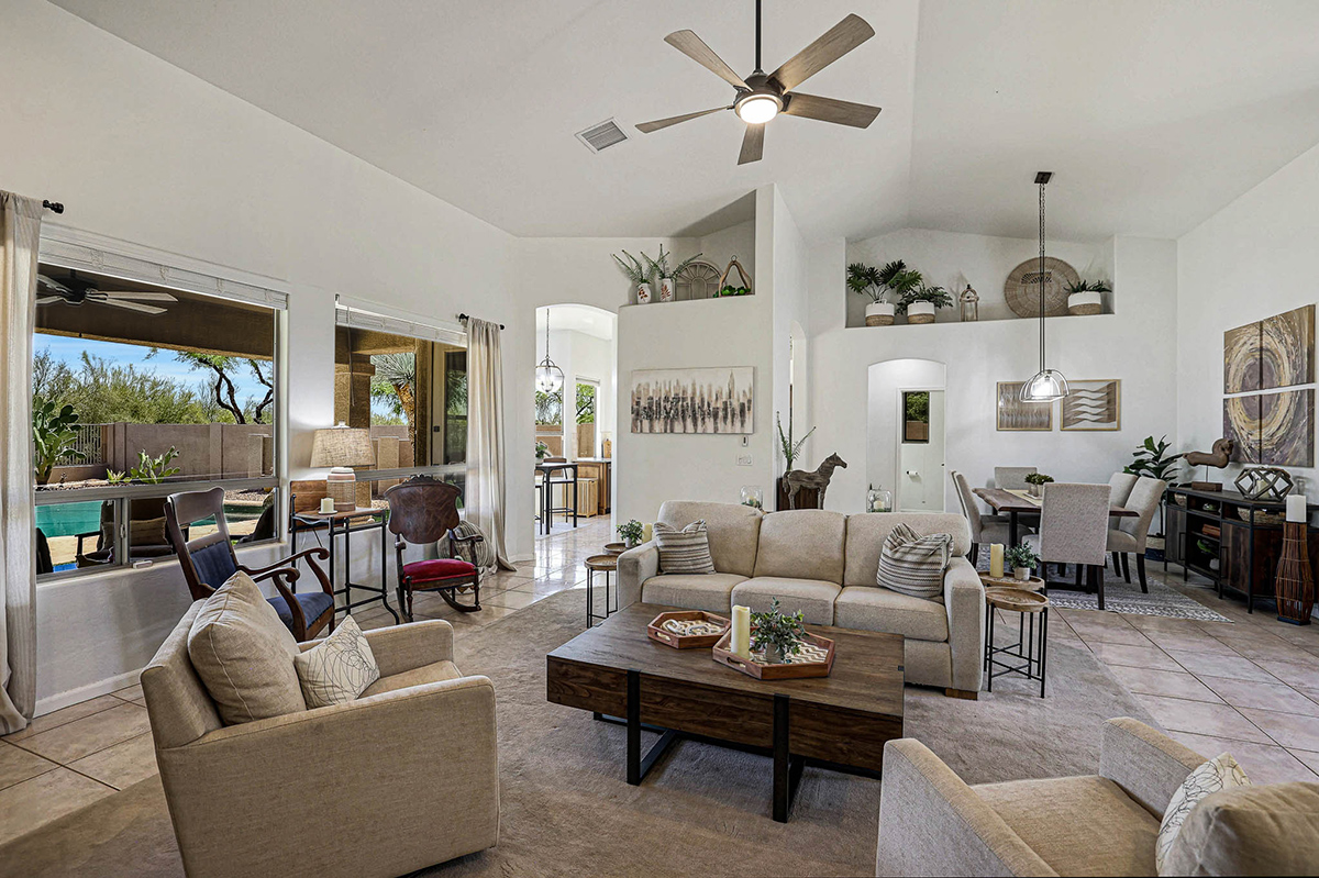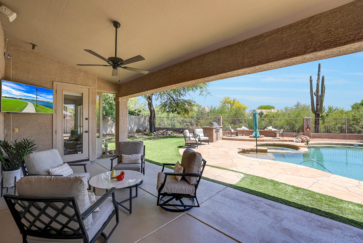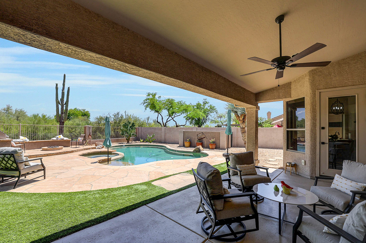 Other highlights include window treatments, an irrigation drip system in the front yard, window sunscreens (stored in the garage), and a spacious three-car garage. Welcome home to comfort, style, and relaxation at Tatum Ranch.