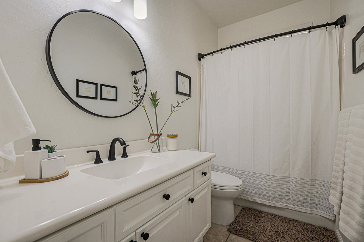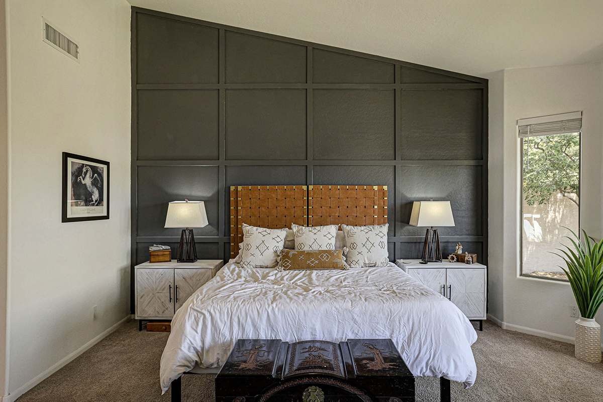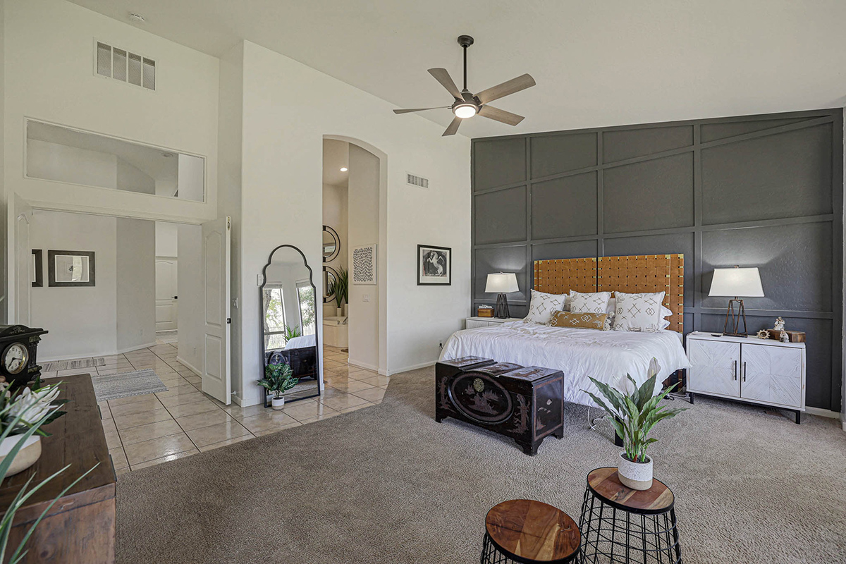 Retreat to the primary bedroom, complete with vaulted ceilings and a cozy wood-trimmed accent wall. The ensuite primary bath offers a walk-in closet, dual vanity sinks, and a separate shower and tub.