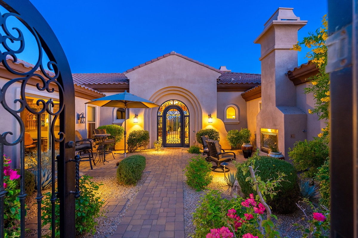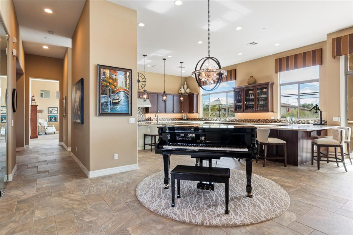 This immaculately maintained, Tuscan-inspired home, built in 2016 by Toll Brothers, offers all the luxuries of a newer build without the hassle of construction. With no interior steps, the single-level layout provides seamless living. As you enter through the gated courtyard, complete with a cozy fireplace, the arched steel and glass front door sets the tone for elegance. The expansive great room showcases an open-concept kitchen and family room with a fireplace and a wall of glass, perfectly framing the backyard.