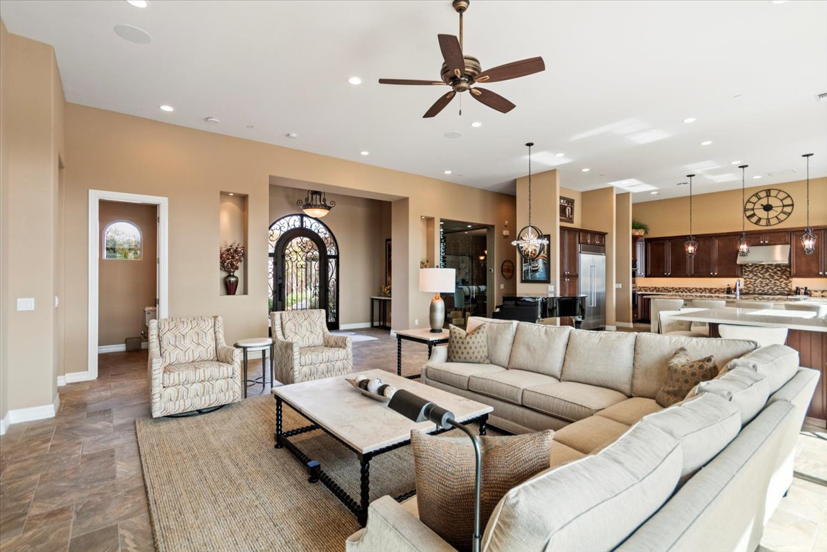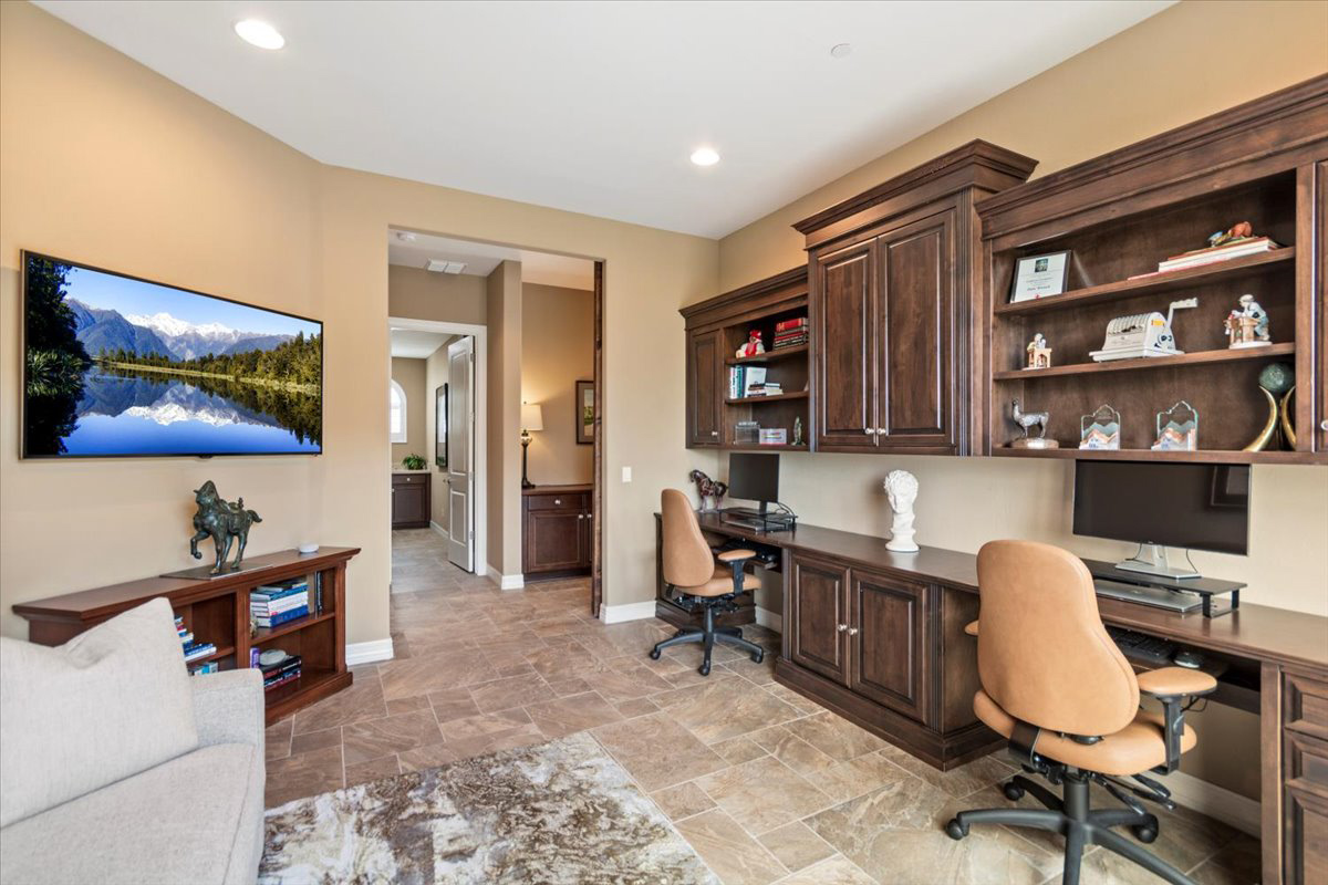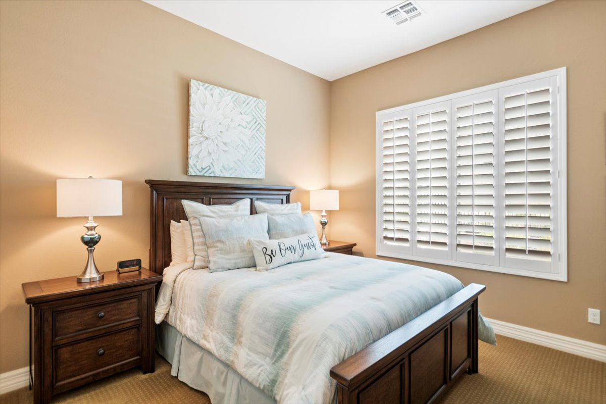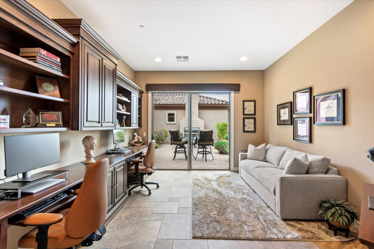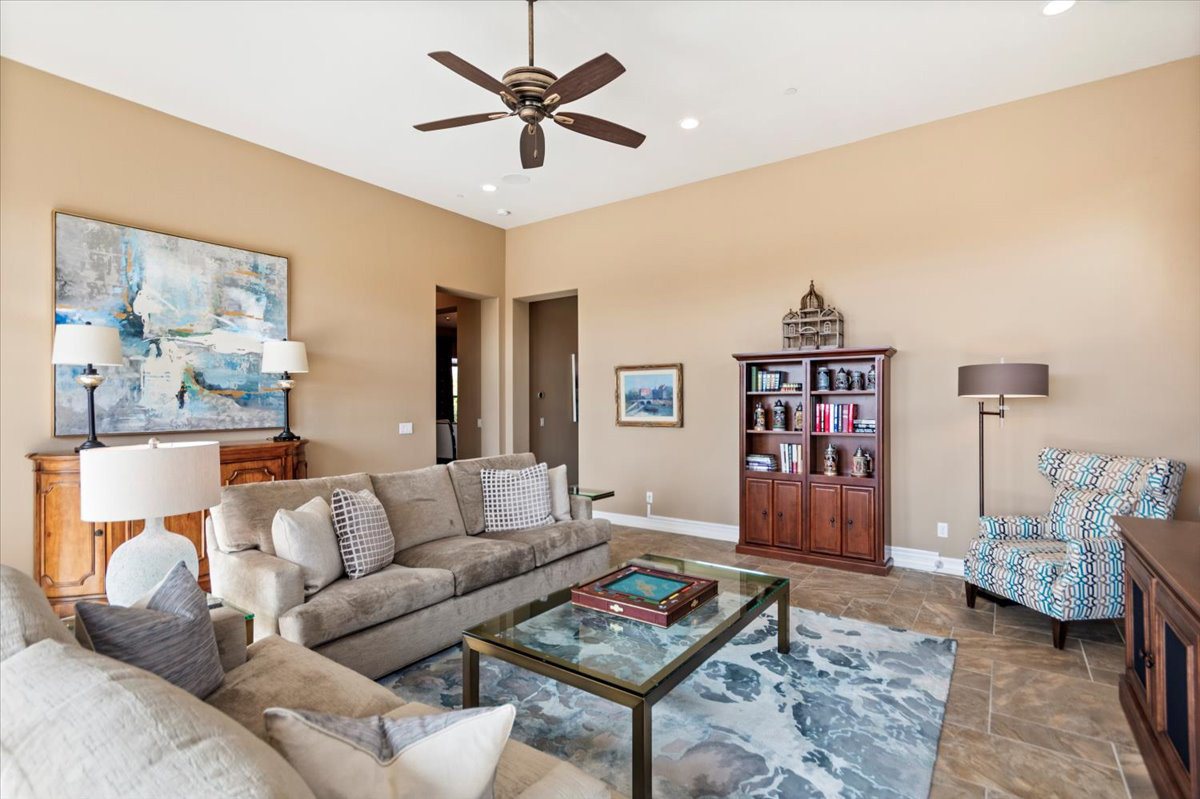 Two additional guest suites and guest baths, are split from the primary for added privacy, along with a separate den/office featuring custom built-ins and entry courtyard access. The home also includes a three-car garage with epoxy flooring, tile flooring in the common areas, plantation shutters and window treatments, upgraded carpet in the bedrooms, powder bath, large laundry, and many luxurious details throughout. Most furnishings and accessories available by separate bill of sale.