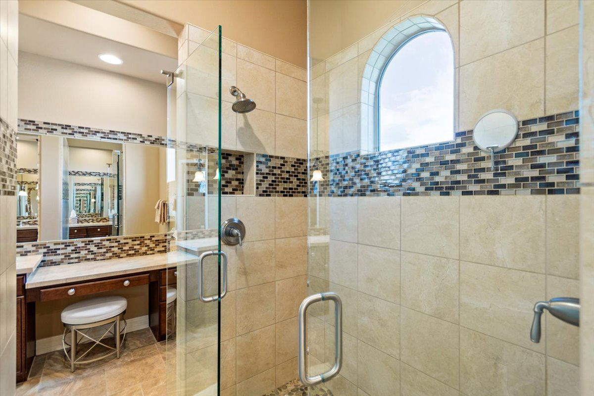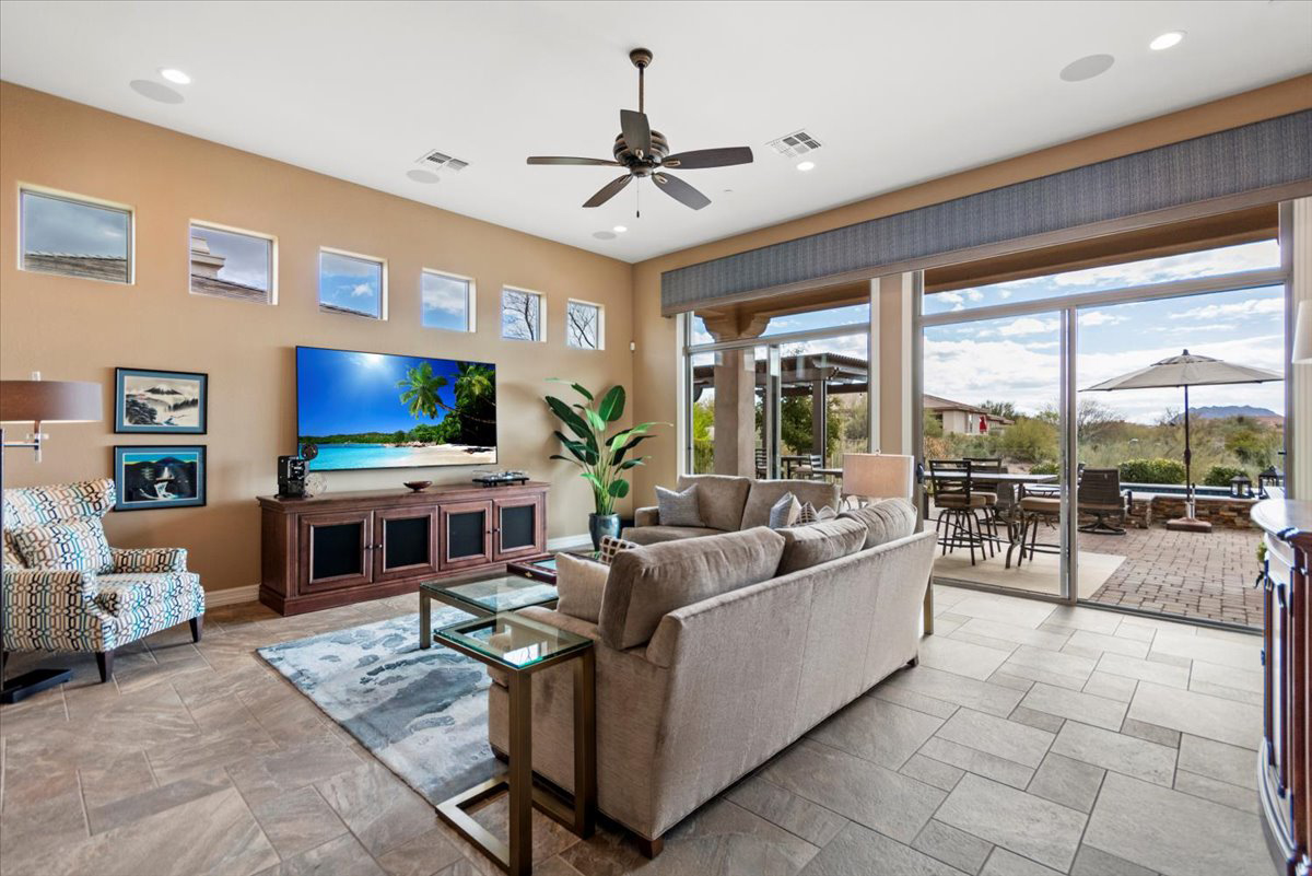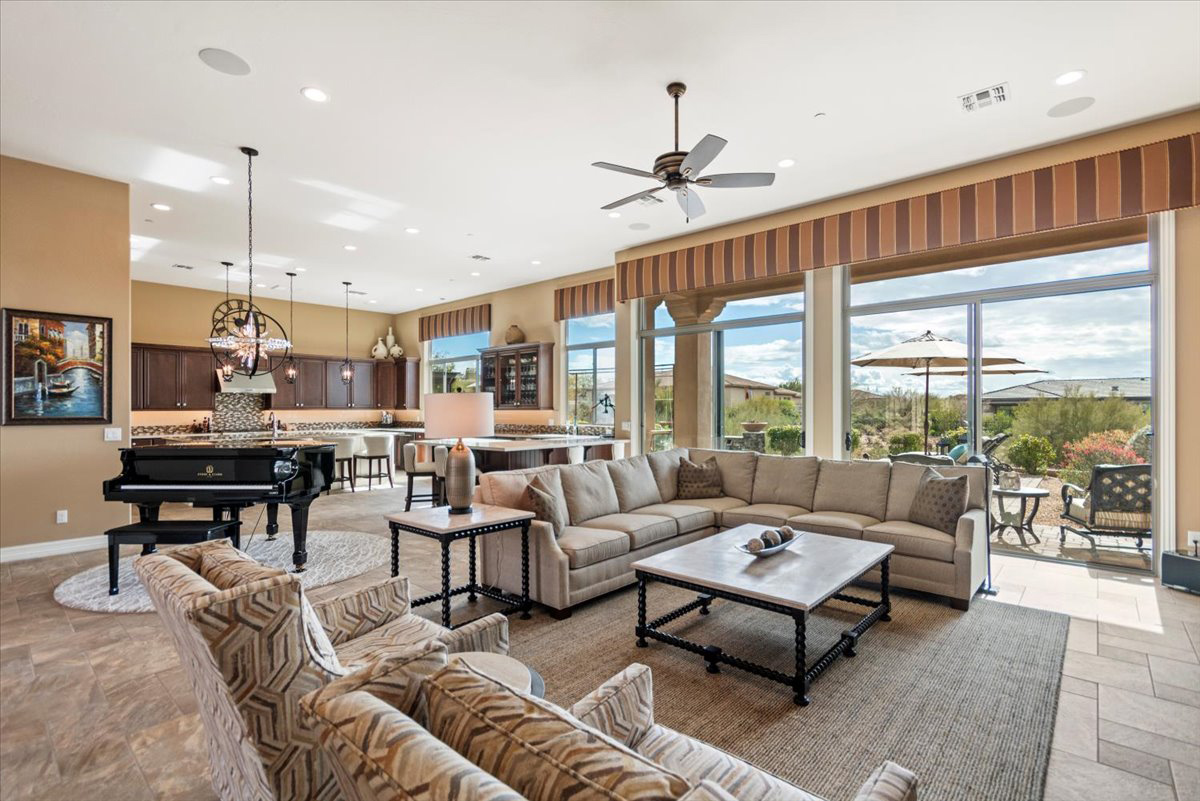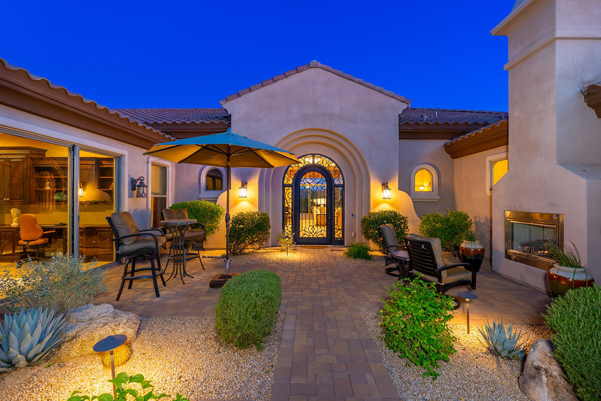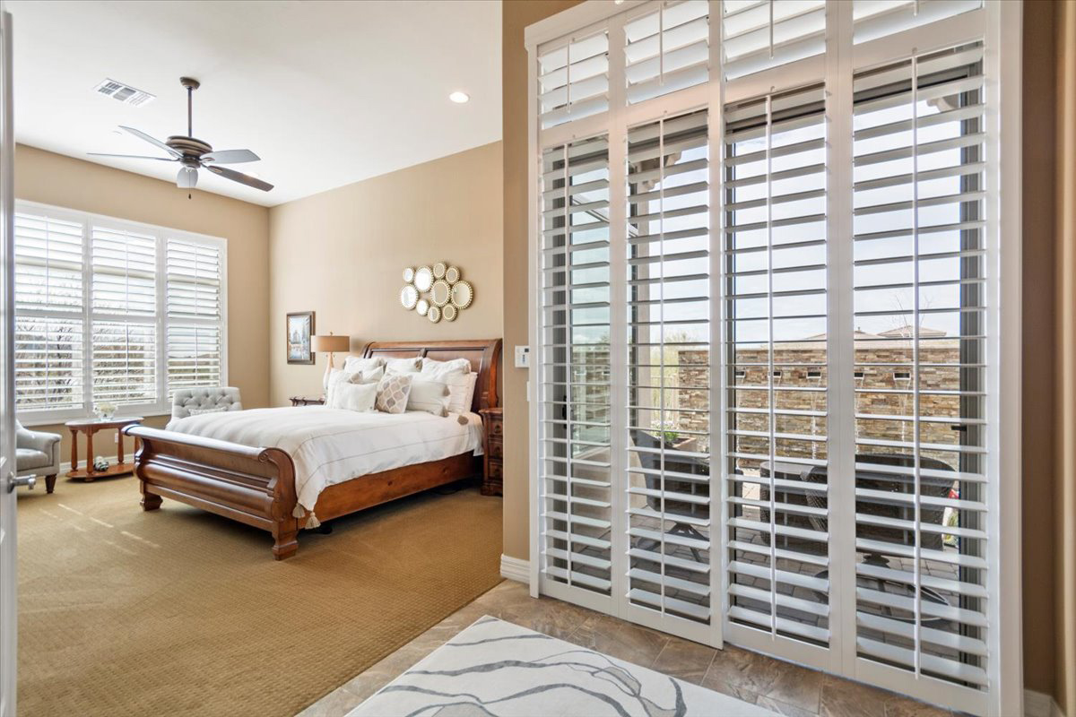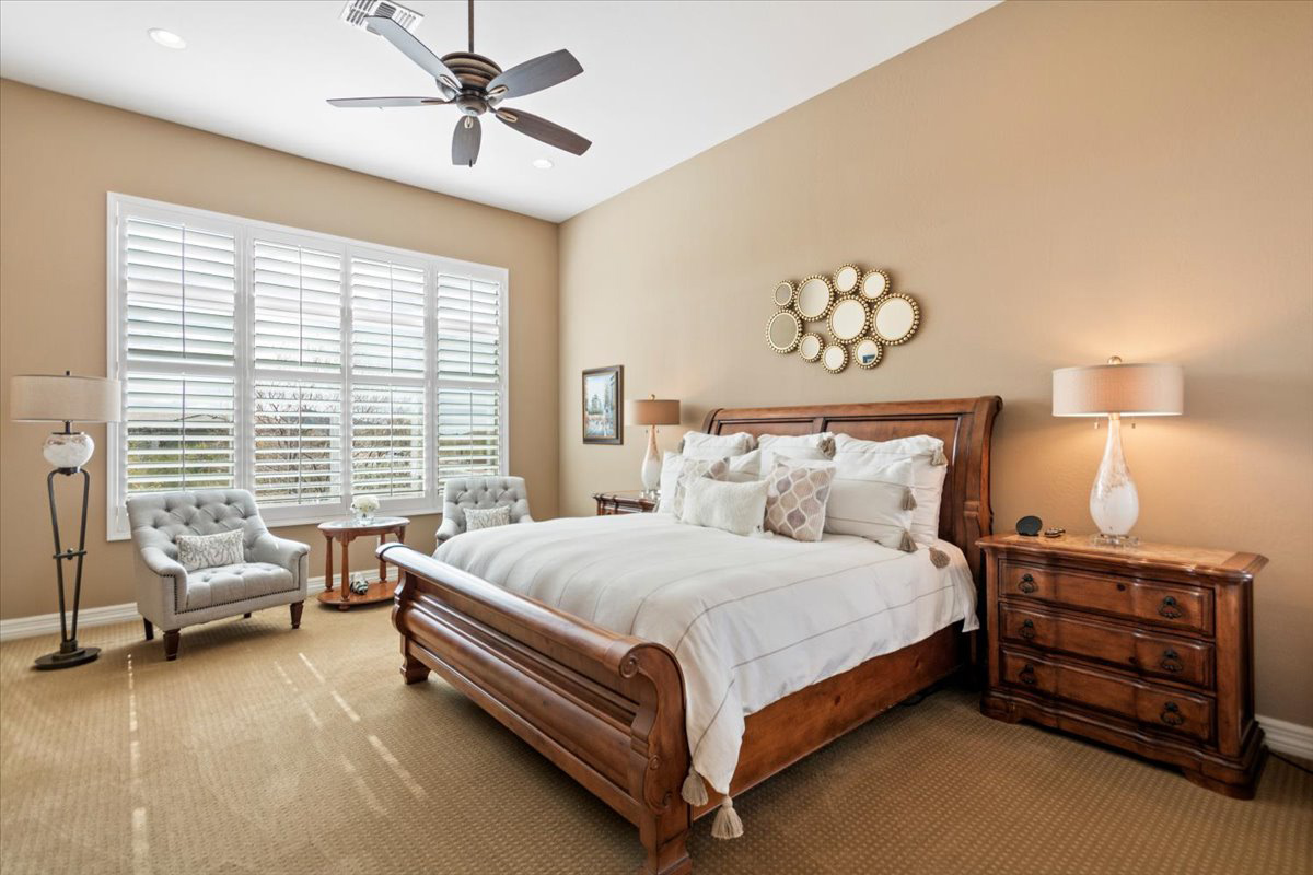 Two additional guest suites and guest baths, are split from the primary for added privacy, along with a separate den/office featuring custom built-ins and entry courtyard access. The home also includes a three-car garage with epoxy flooring, tile flooring in the common areas, plantation shutters and window treatments, upgraded carpet in the bedrooms, powder bath, large laundry, and many luxurious details throughout. Most furnishings and accessories available by separate bill of sale.
