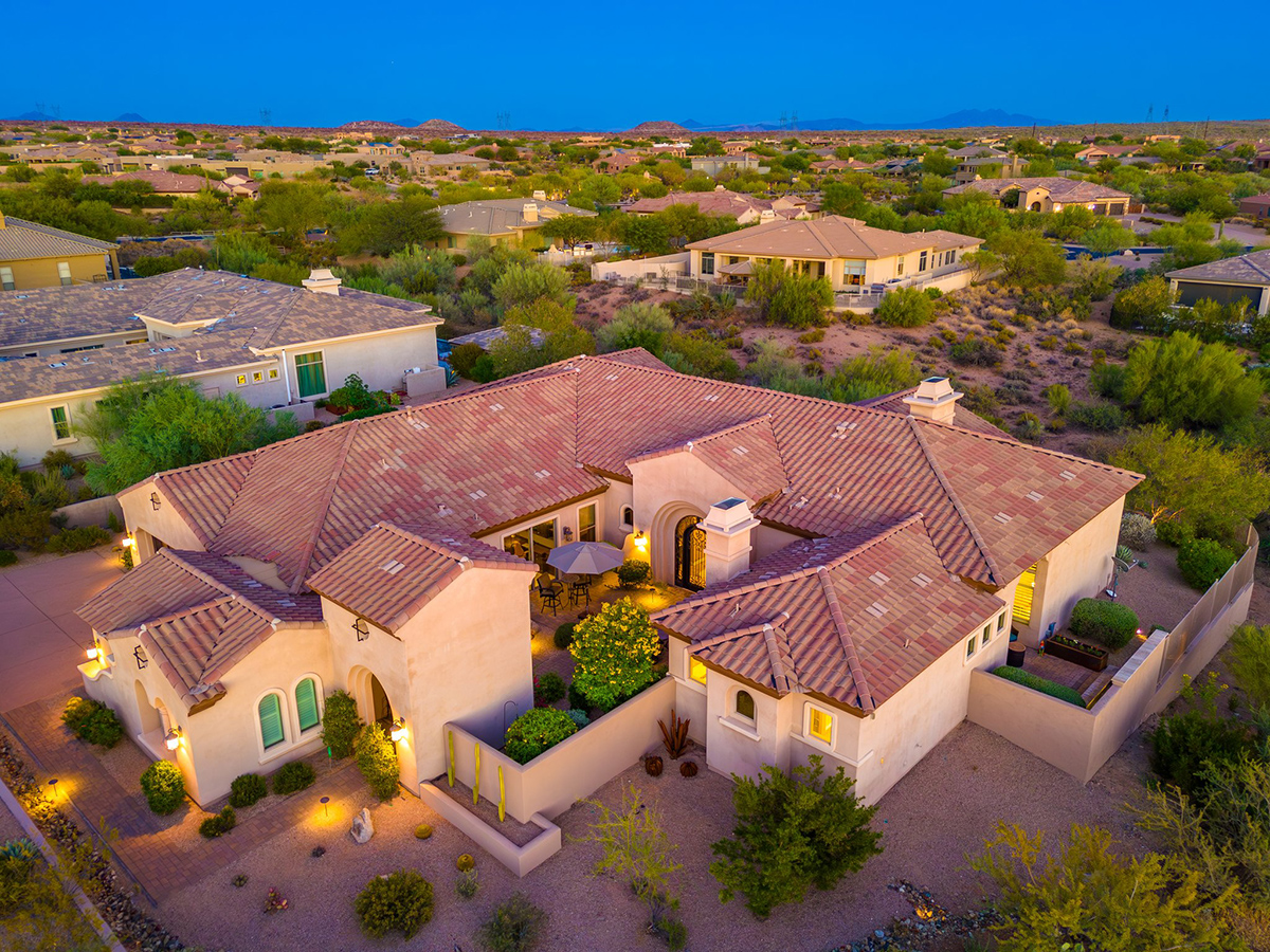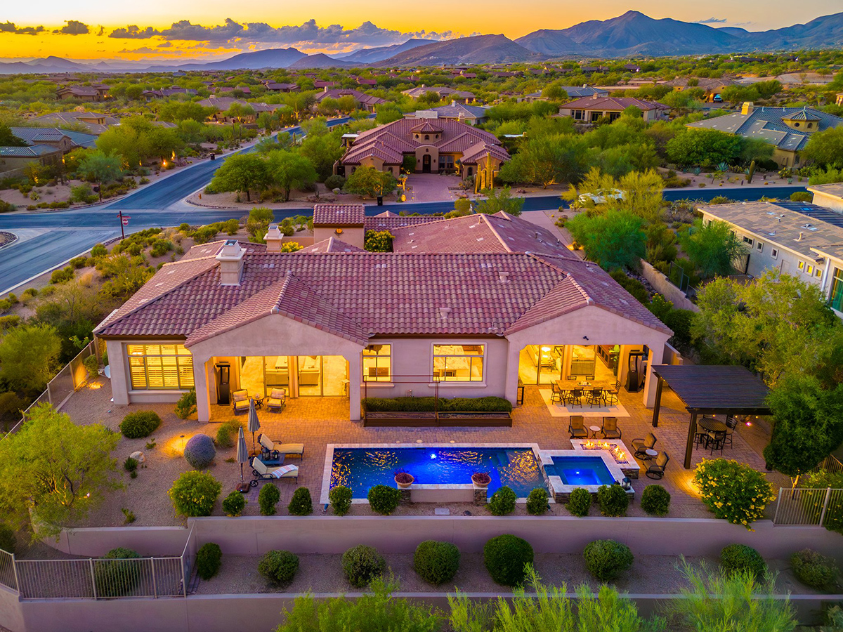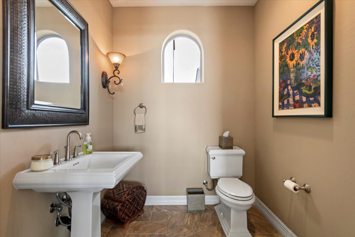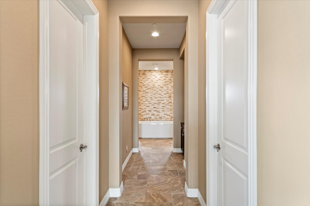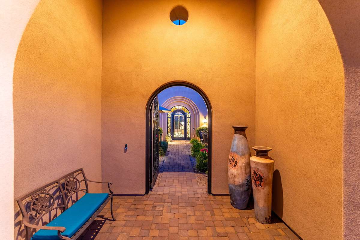 Two additional guest suites and guest baths, are split from the primary for added privacy, along with a separate den/office featuring custom built-ins and entry courtyard access. The home also includes a three-car garage with epoxy flooring, tile flooring in the common areas, plantation shutters and window treatments, upgraded carpet in the bedrooms, powder bath, large laundry, and many luxurious details throughout. Most furnishings and accessories available by separate bill of sale.