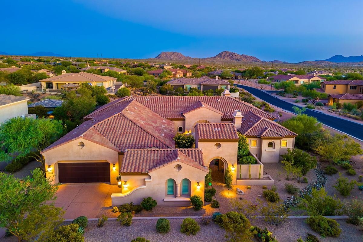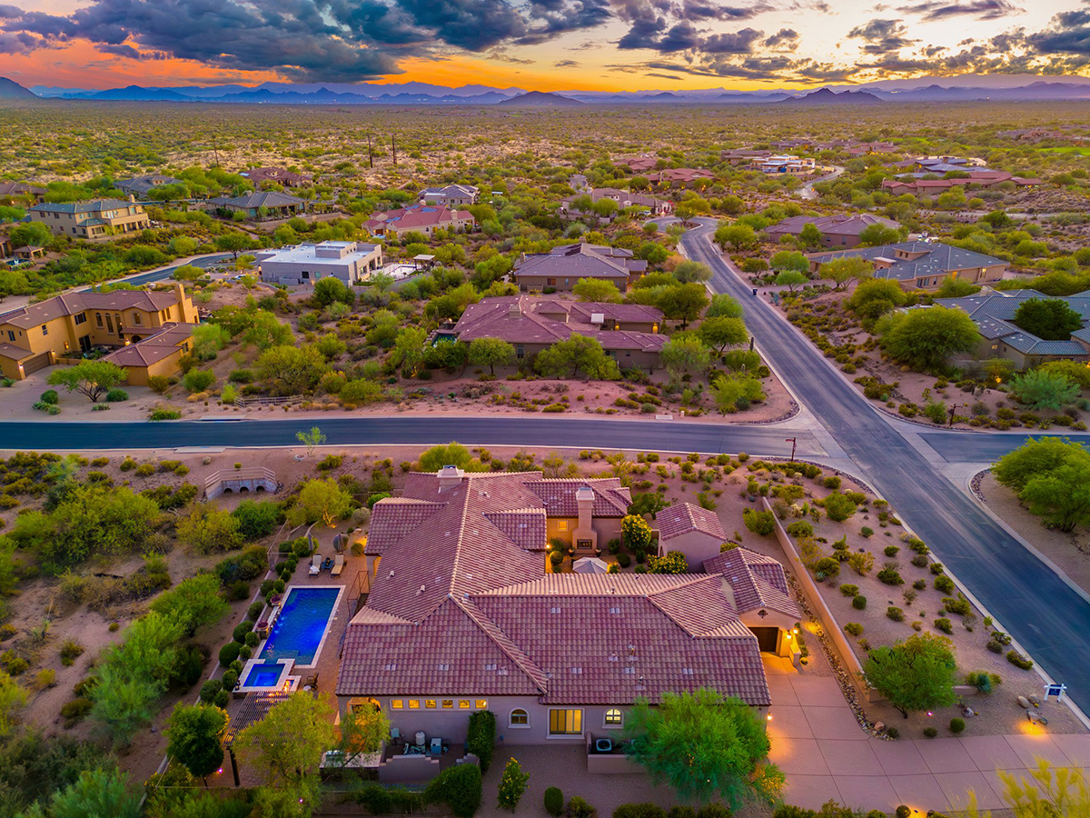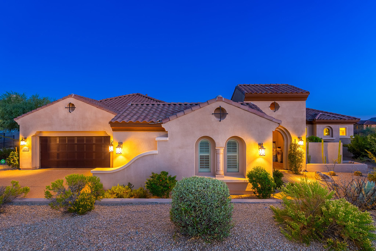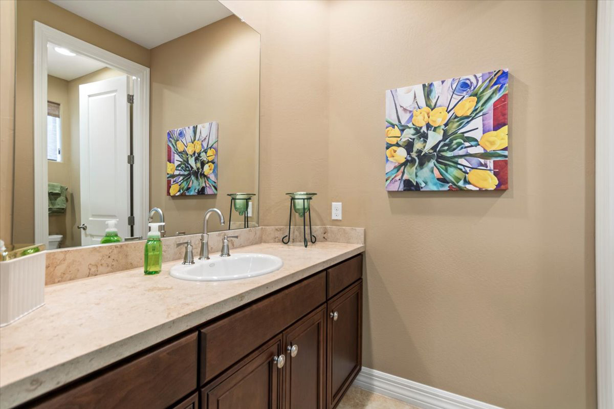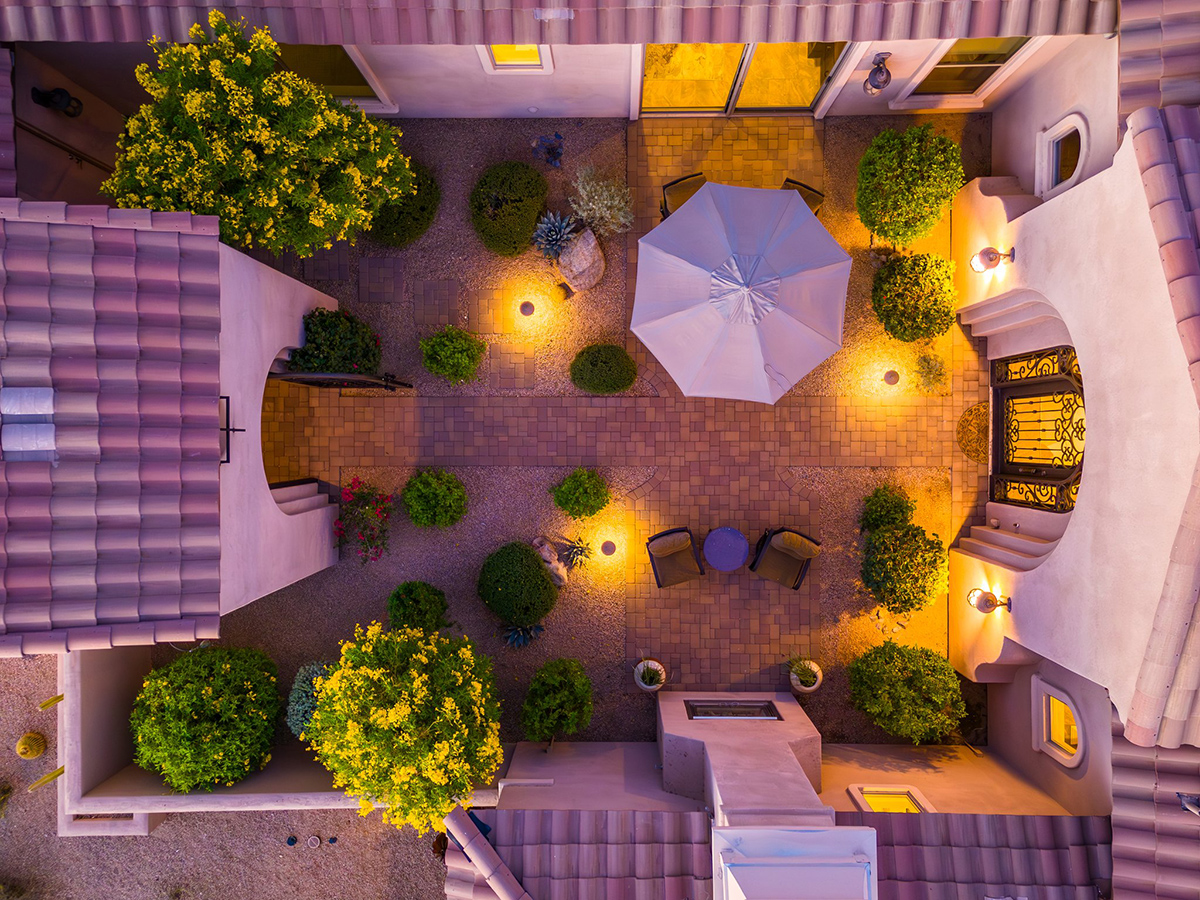 Two additional guest suites and guest baths, are split from the primary for added privacy, along with a separate den/office featuring custom built-ins and entry courtyard access. The home also includes a three-car garage with epoxy flooring, tile flooring in the common areas, plantation shutters and window treatments, upgraded carpet in the bedrooms, powder bath, large laundry, and many luxurious details throughout. Most furnishings and accessories available by separate bill of sale.