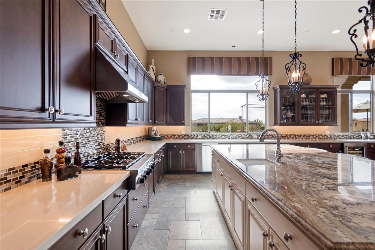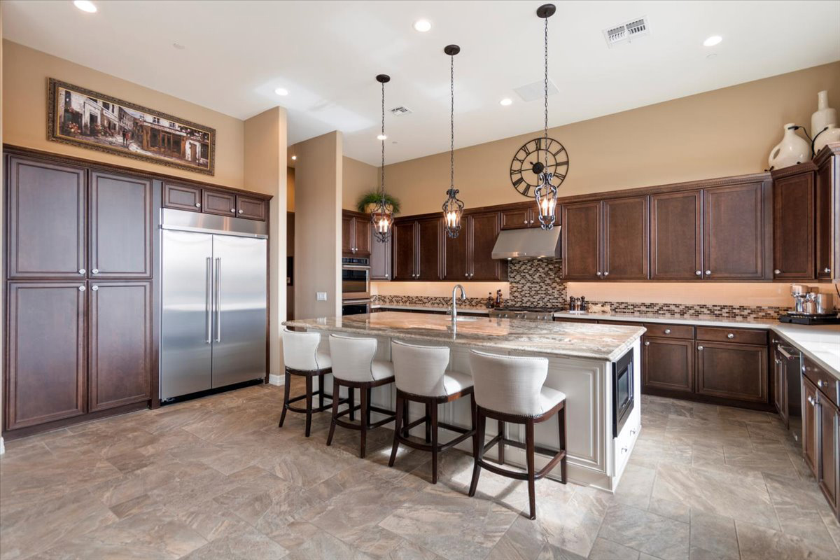 The chef’s kitchen is a culinary dream, boasting ample cabinetry, granite and quartz countertops, a large center island, and a wraparound peninsula with seating. High-end stainless steel appliances include double wall ovens, a side-by-side fridge/freezer, built-in microwave, and beverage fridge. The adjacent formal dining room is accompanied by a sophisticated wine room featuring a stunning glass wall, custom cabinetry, and display racks for your wine collection.